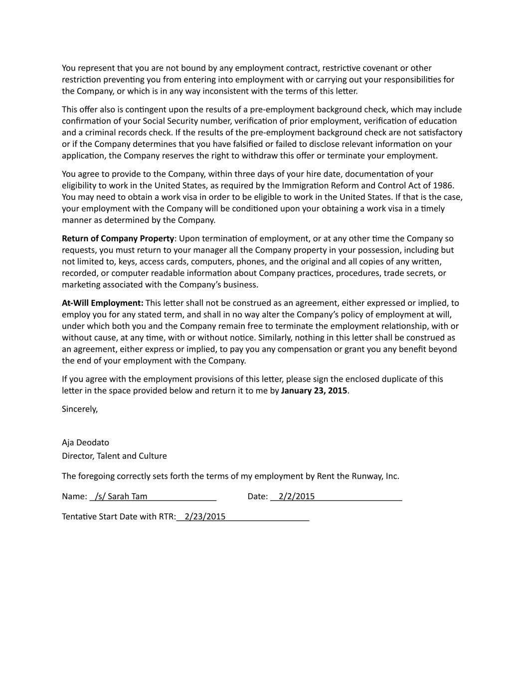 You represent that you are not bound by any employment contract, restrictive covenant or other restriction preventing you from entering into employment with or carrying out your responsibilities for the Company, or which is in any way inconsistent with the terms of this letter. This offer also is contingent upon the results of a pre-employment background check, which may include confirmation of your Social Security number, verification of prior employment, verification of education and a criminal records check. If the results of the pre-employment background check are not satisfactory or if the Company determines that you have falsified or failed to disclose relevant information on your application, the Company reserves the right to withdraw this offer or terminate your employment. You agree to provide to the Company, within three days of your hire date, documentation of your eligibility to work in the United States, as required by the Immigration Reform and Control Act of 1986. You may need to obtain a work visa in order to be eligible to work in the United States. If that is the case, your employment with the Company will be conditioned upon your obtaining a work visa in a timely manner as determined by the Company. Return of Company Property: Upon termination of employment, or at any other time the Company so requests, you must return to your manager all the Company property in your possession, including but not limited to, keys, access cards, computers, phones, and the original and all copies of any written, recorded, or computer readable information about Company practices, procedures, trade secrets, or marketing associated with the Company’s business. At-Will Employment: This letter shall not be construed as an agreement, either expressed or implied, to employ you for any stated term, and shall in no way alter the Company’s policy of employment at will, under which both you and the Company remain free to terminate the employment relationship, with or without cause, at any time, with or without notice. Similarly, nothing in this letter shall be construed as an agreement, either express or implied, to pay you any compensation or grant you any benefit beyond the end of your employment with the Company. If you agree with the employment provisions of this letter, please sign the enclosed duplicate of this letter in the space provided below and return it to me by January 23, 2015. Sincerely, Aja Deodato Director, Talent and Culture The foregoing correctly sets forth the terms of my employment by Rent the Runway, Inc. Name: /s/ Sarah Tam Date: 2/2/2015 Tentative Start Date with RTR: 2/23/2015