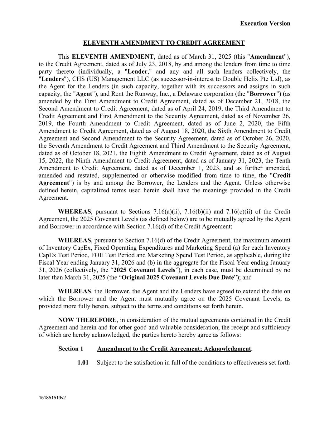 151851519v2 Execution Version ELEVENTH AMENDMENT TO CREDIT AGREEMENT This ELEVENTH AMENDMENT, dated as of March 31, 2025 (this "Amendment"), to the Credit Agreement, dated as of July 23, 2018, by and among the lenders from time to time party thereto (individually, a "Lender," and any and all such lenders collectively, the "Lenders"), CHS (US) Management LLC (as successor-in-interest to Double Helix Pte Ltd), as the Agent for the Lenders (in such capacity, together with its successors and assigns in such capacity, the "Agent"), and Rent the Runway, Inc., a Delaware corporation (the "Borrower") (as amended by the First Amendment to Credit Agreement, dated as of December 21, 2018, the Second Amendment to Credit Agreement, dated as of April 24, 2019, the Third Amendment to Credit Agreement and First Amendment to the Security Agreement, dated as of November 26, 2019, the Fourth Amendment to Credit Agreement, dated as of June 2, 2020, the Fifth Amendment to Credit Agreement, dated as of August 18, 2020, the Sixth Amendment to Credit Agreement and Second Amendment to the Security Agreement, dated as of October 26, 2020, the Seventh Amendment to Credit Agreement and Third Amendment to the Security Agreement, dated as of October 18, 2021, the Eighth Amendment to Credit Agreement, dated as of August 15, 2022, the Ninth Amendment to Credit Agreement, dated as of January 31, 2023, the Tenth Amendment to Credit Agreement, dated as of December 1, 2023, and as further amended, amended and restated, supplemented or otherwise modified from time to time, the "Credit Agreement") is by and among the Borrower, the Lenders and the Agent. Unless otherwise defined herein, capitalized terms used herein shall have the meanings provided in the Credit Agreement. WHEREAS, pursuant to Sections 7.16(a)(ii), 7.16(b)(ii) and 7.16(c)(ii) of the Credit Agreement, the 2025 Covenant Levels (as defined below) are to be mutually agreed by the Agent and Borrower in accordance with Section 7.16(d) of the Credit Agreement; WHEREAS, pursuant to Section 7.16(d) of the Credit Agreement, the maximum amount of Inventory CapEx, Fixed Operating Expenditures and Marketing Spend (a) for each Inventory CapEx Test Period, FOE Test Period and Marketing Spend Test Period, as applicable, during the Fiscal Year ending January 31, 2026 and (b) in the aggregate for the Fiscal Year ending January 31, 2026 (collectively, the “2025 Covenant Levels”), in each case, must be determined by no later than March 31, 2025 (the “Original 2025 Covenant Levels Due Date”); and WHEREAS, the Borrower, the Agent and the Lenders have agreed to extend the date on which the Borrower and the Agent must mutually agree on the 2025 Covenant Levels, as provided more fully herein, subject to the terms and conditions set forth herein. NOW THEREFORE, in consideration of the mutual agreements contained in the Credit Agreement and herein and for other good and valuable consideration, the receipt and sufficiency of which are hereby acknowledged, the parties hereto hereby agree as follows: Section 1 Amendment to the Credit Agreement; Acknowledgment. 1.01 Subject to the satisfaction in full of the conditions to effectiveness set forth