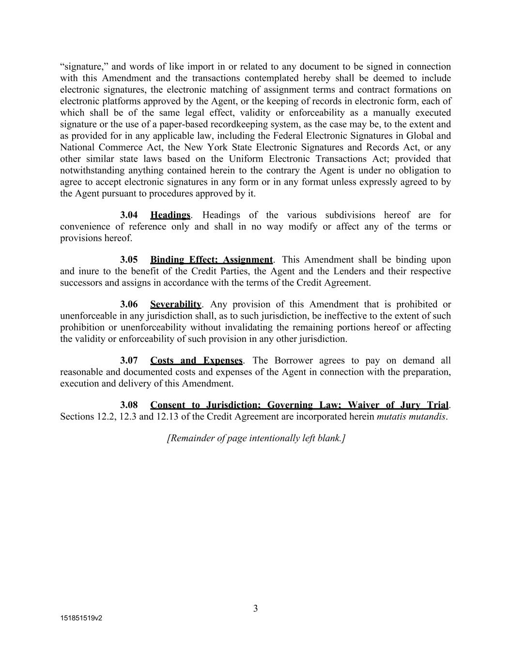 151851519v2 “signature,” and words of like import in or related to any document to be signed in connection with this Amendment and the transactions contemplated hereby shall be deemed to include electronic signatures, the electronic matching of assignment terms and contract formations on electronic platforms approved by the Agent, or the keeping of records in electronic form, each of which shall be of the same legal effect, validity or enforceability as a manually executed signature or the use of a paper-based recordkeeping system, as the case may be, to the extent and as provided for in any applicable law, including the Federal Electronic Signatures in Global and National Commerce Act, the New York State Electronic Signatures and Records Act, or any other similar state laws based on the Uniform Electronic Transactions Act; provided that notwithstanding anything contained herein to the contrary the Agent is under no obligation to agree to accept electronic signatures in any form or in any format unless expressly agreed to by the Agent pursuant to procedures approved by it. 3.04 Headings. Headings of the various subdivisions hereof are for convenience of reference only and shall in no way modify or affect any of the terms or provisions hereof. 3.05 Binding Effect; Assignment. This Amendment shall be binding upon and inure to the benefit of the Credit Parties, the Agent and the Lenders and their respective successors and assigns in accordance with the terms of the Credit Agreement. 3.06 Severability. Any provision of this Amendment that is prohibited or unenforceable in any jurisdiction shall, as to such jurisdiction, be ineffective to the extent of such prohibition or unenforceability without invalidating the remaining portions hereof or affecting the validity or enforceability of such provision in any other jurisdiction. 3.07 Costs and Expenses. The Borrower agrees to pay on demand all reasonable and documented costs and expenses of the Agent in connection with the preparation, execution and delivery of this Amendment. 3.08 Consent to Jurisdiction; Governing Law; Waiver of Jury Trial. Sections 12.2, 12.3 and 12.13 of the Credit Agreement are incorporated herein mutatis mutandis. [Remainder of page intentionally left blank.] 3