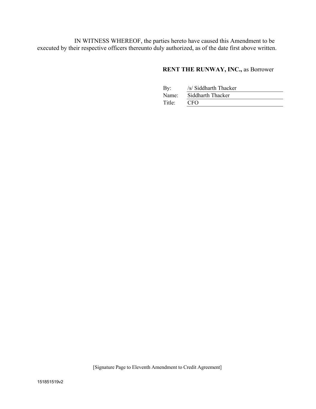 151851519v2 IN WITNESS WHEREOF, the parties hereto have caused this Amendment to be executed by their respective officers thereunto duly authorized, as of the date first above written. RENT THE RUNWAY, INC., as Borrower By: /s/ Siddharth Thacker Name: Siddharth Thacker Title: CFO [Signature Page to Eleventh Amendment to Credit Agreement]