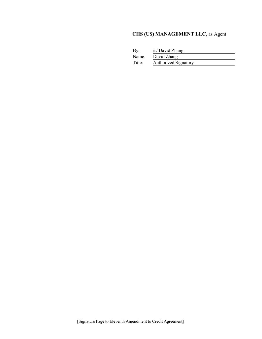 [Signature Page to Eleventh Amendment to Credit Agreement] CHS (US) MANAGEMENT LLC, as Agent By: /s/ David Zhang Name: David Zhang Title: Authorized Signatory