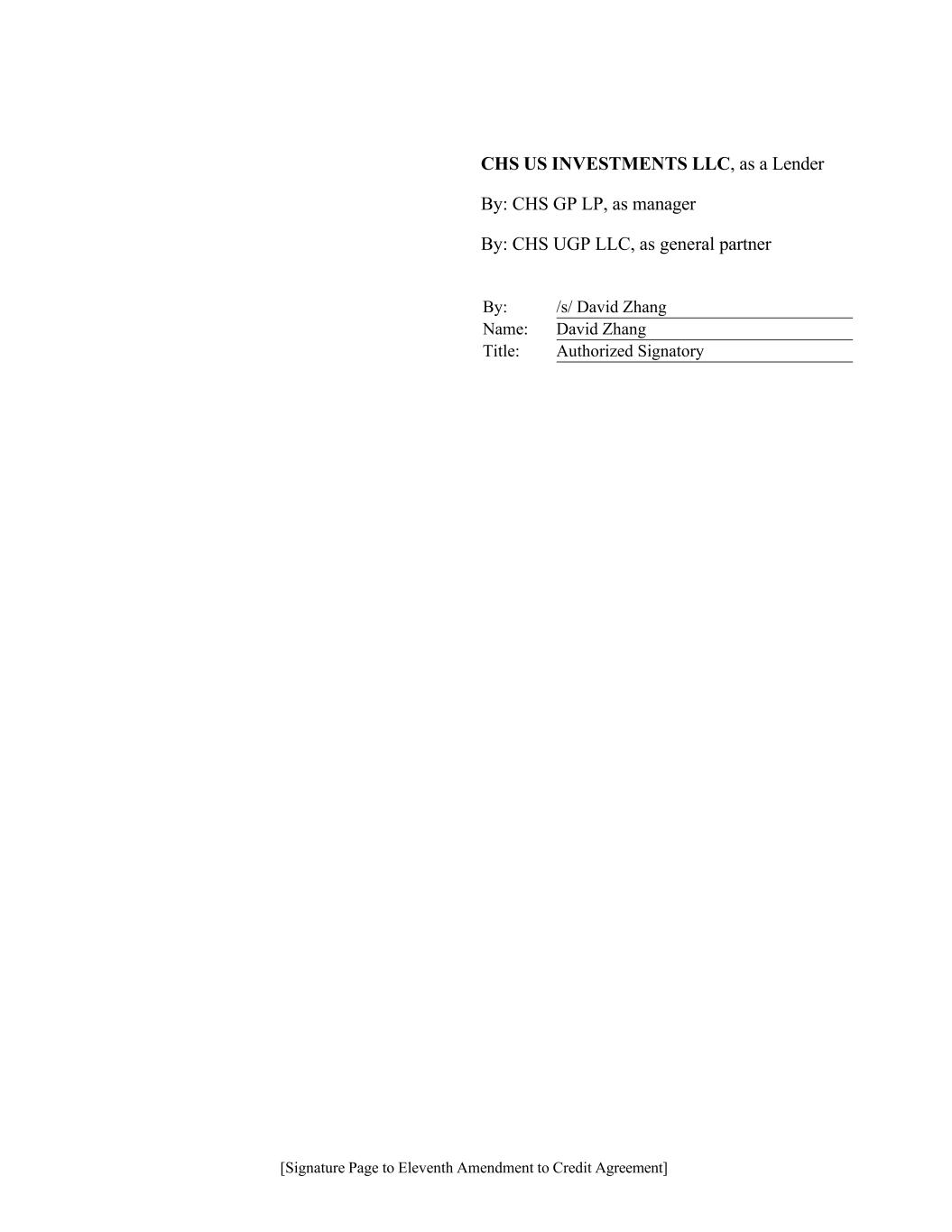 [Signature Page to Eleventh Amendment to Credit Agreement] CHS US INVESTMENTS LLC, as a Lender By: CHS GP LP, as manager By: CHS UGP LLC, as general partner By: /s/ David Zhang Name: David Zhang Title: Authorized Signatory