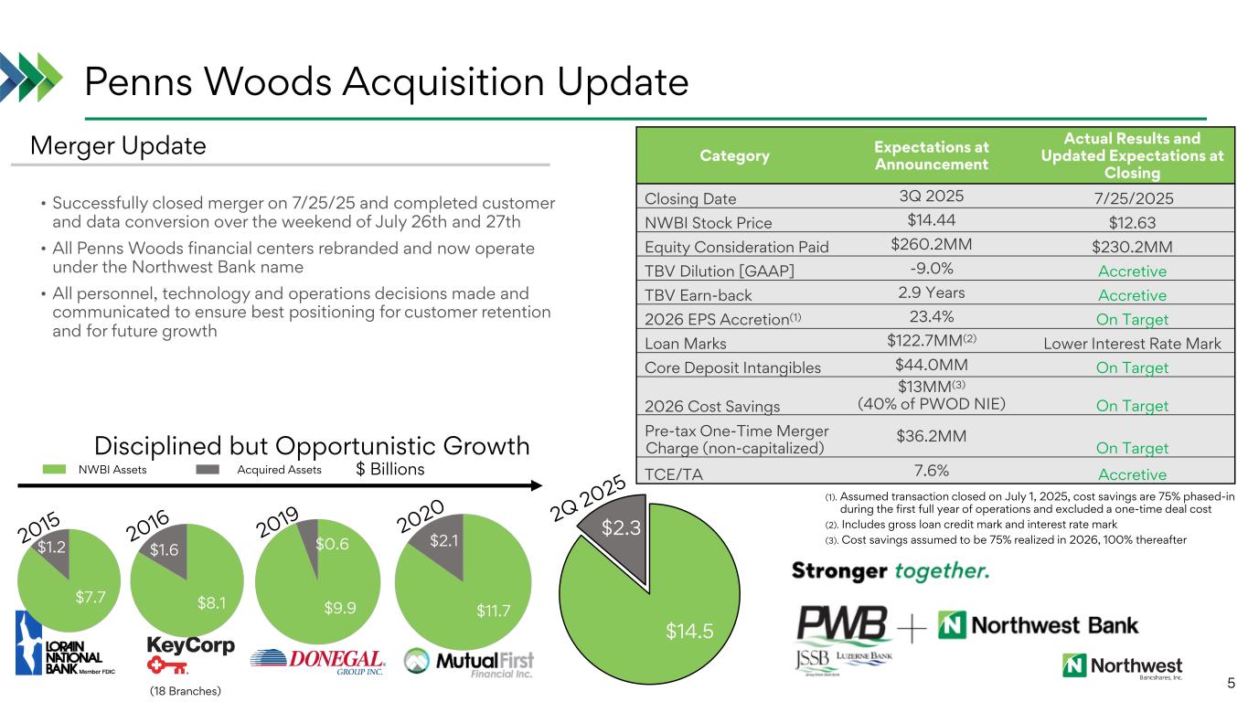 「予断を許さない事業環境が続いていますが、ノースウエストの今後の見通しには自信と興奮を感じています。当行は常に、さらなる規模と戦略的利益を求めて買収の機会を検討していますが、ペンズウッズの買収と転換が完了した直後である今、当行は主に、新たに統合された事業体の業務と財務実績を最適化することに注力しています。当行は引き続き、業務能力を強化し、新規支店の開設を通じて事業基盤を拡大し、お客様や当行がサービスを提供する地域社会に対し、個別対応型のサービスや専門知識を提供してまいります。"