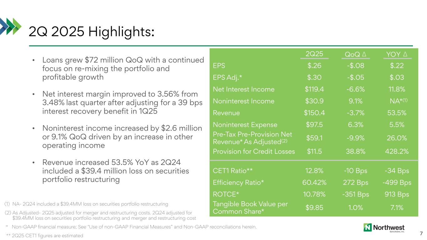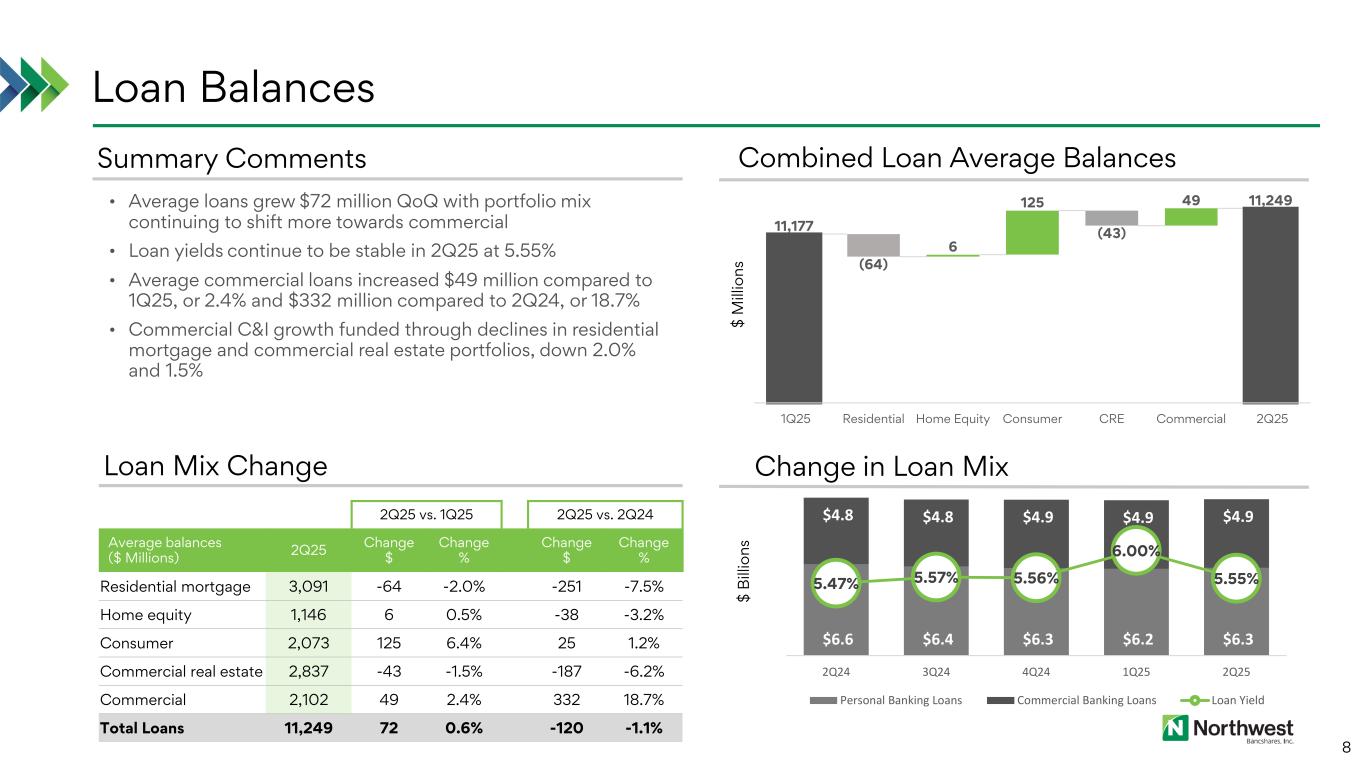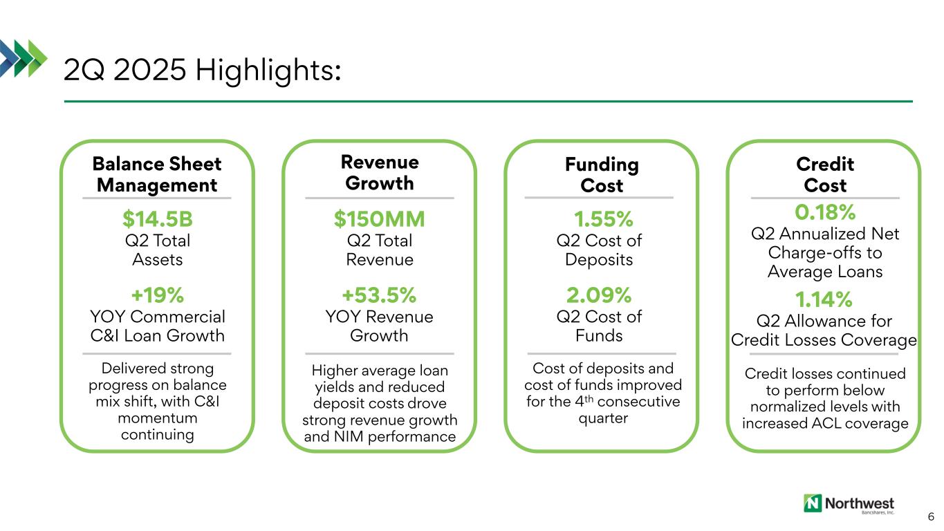 ノースウエスト・バンクシェアーズのルイス・J・トーチオ社長兼最高経営責任者(CEO)は次のようにコメントし ました。「持続可能で責任ある収益性の高い成長へのコミットメントを実現し、戦略を実行し続けている当行の 2025 年第 2 四半期の業績に満足しています。全体として、当行は年初からの好調なスタートを維持し、純利鞘の拡大と収益の伸びを達成しました。また、慎重な経費管理を継続した結果、効率率はさらに改善しました。