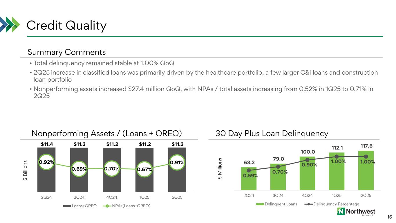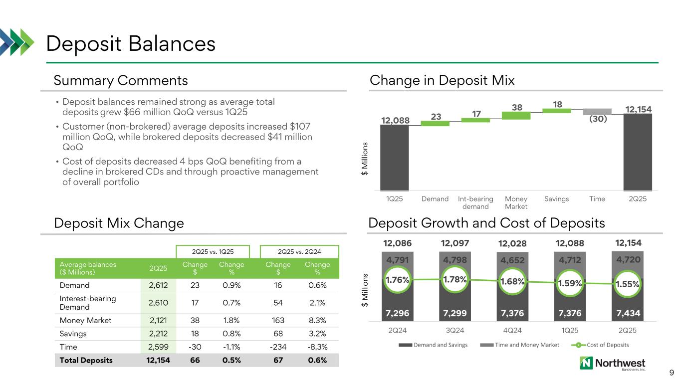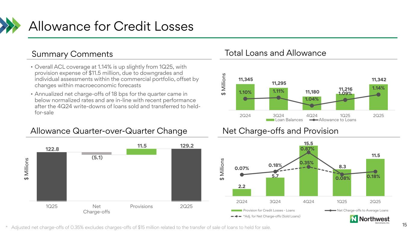 ノースウエスト・バンクシェアーズのルイス・J・トーチオ社長兼最高経営責任者(CEO)は次のようにコメントし ました。「持続可能で責任ある収益性の高い成長へのコミットメントを実現し、戦略を実行し続けている当行の 2025 年第 2 四半期の業績に満足しています。全体として、当行は年初からの好調なスタートを維持し、純利鞘の拡大と収益の伸びを達成しました。また、慎重な経費管理を継続した結果、効率率はさらに改善しました。