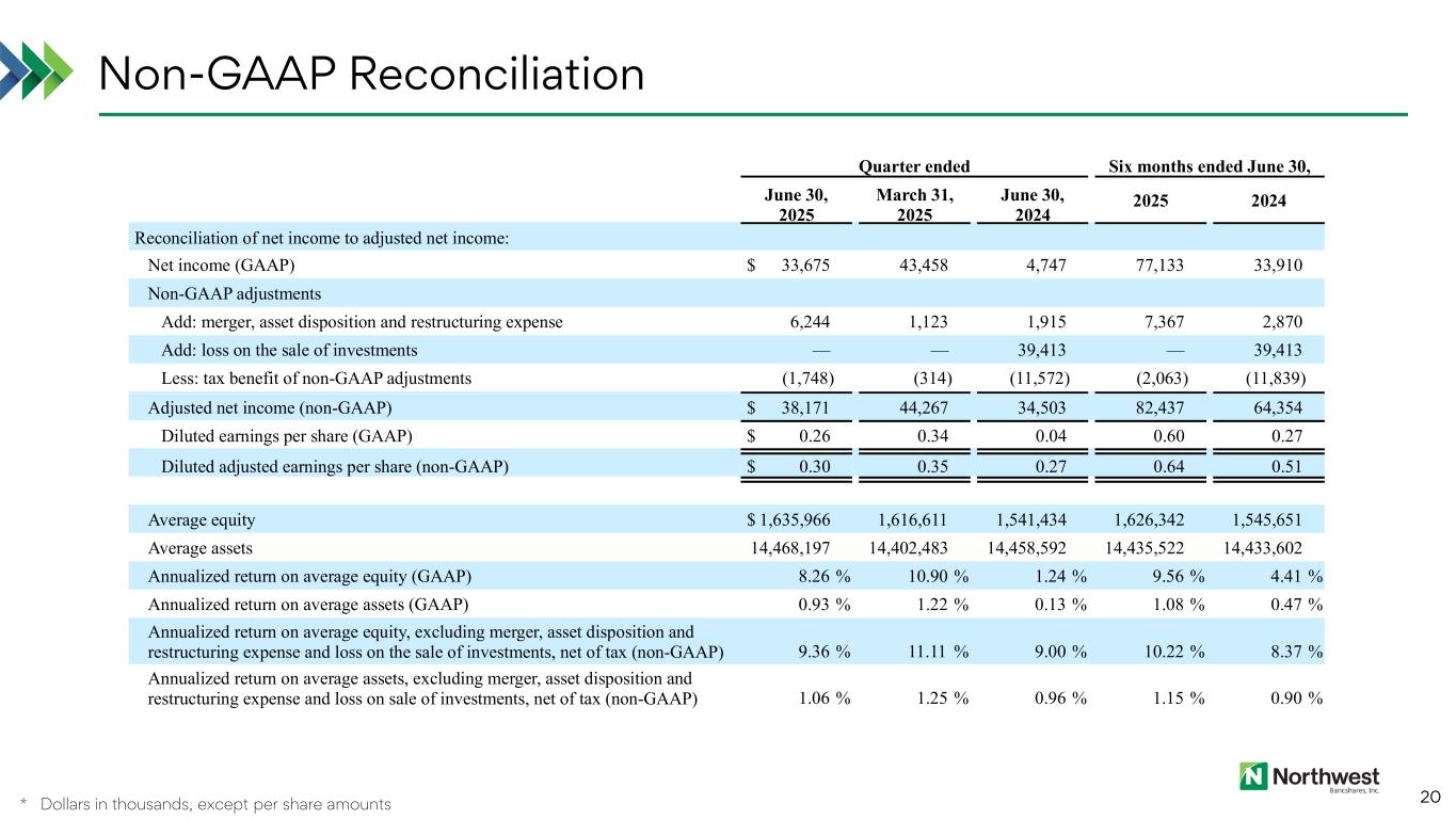 2025年6月30日に終了した四半期の調整後純利益(非GAAP基準)は3,800万ドル(希薄化後1株当たり0.30ドル) となり、前期の4,400万ドル(希薄化後1株当たり0.35ドル)から600万ドル減少しました。この減少の主な要因は、前四半期の多額の未収利息回収の影響を受け、純利息利益が 800 万ドル減少したことです。2025 年第 1 四半期の平均株主資本(非 GAAP 基準)および平均資産(非 GAAP 基準)に対する調整後年率換算利益 率は、前四半期の 11.11%および 1.25%に対して、それぞれ 9.36%および 1.06%となりました。