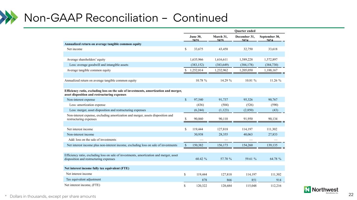 ノースウエスト・バンクシェアーズ・インク(ナスダック:NWBI)は、2025 年第 1 四半期の純利益が 3,400 万ドル(希薄化後 1 株当たり 0.26 ドル)となったことを発表した。これは、純利益が500万ドル(希薄化後1株当たり0.04ドル)であった前年同期と比べると2,900万ドルの増加、純利益が4,300万ドル(希薄化後1株当たり0.34ドル)であった前四半期と比べると1,000万ドルの減少となります。2025年6月30日に終了した四半期の平均株主資本利益率(年率換算)は8.26%、平均資産利益率(年率換算)は0.93%で、前年同期の平均株主資本利益率(年率換算)は1.24%、平均資産利益率(年率換算)は0.13%、前期の平均株主資本利益率(年率換算)は10.90%、平均資産利益率(年率換算)は1.22%でした。