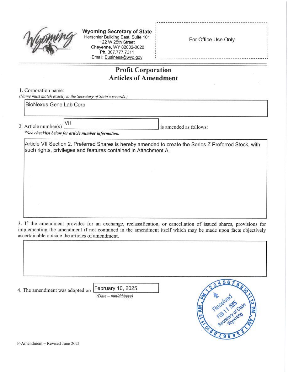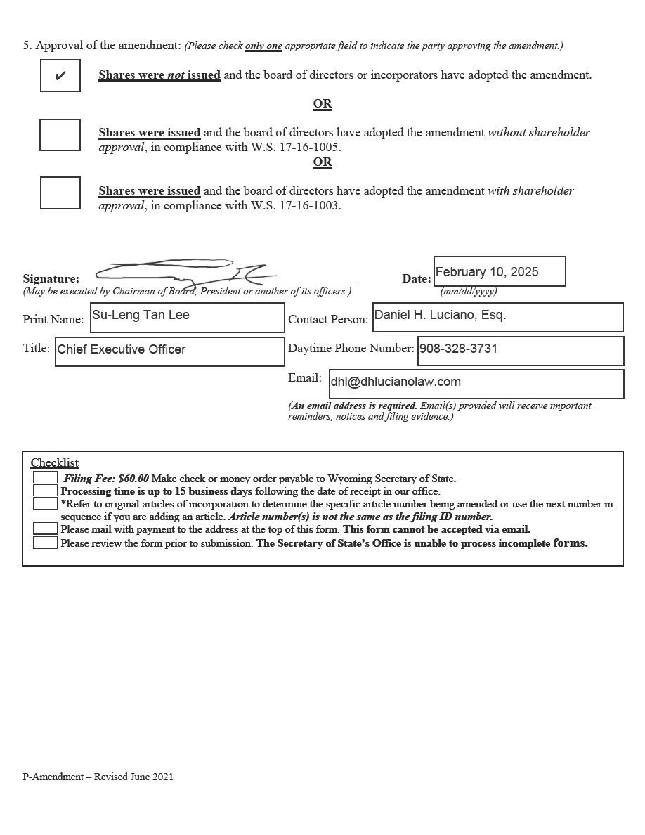 Articles of Amendment filed with the Wyoming Secretary of State on February 11, 2025. |