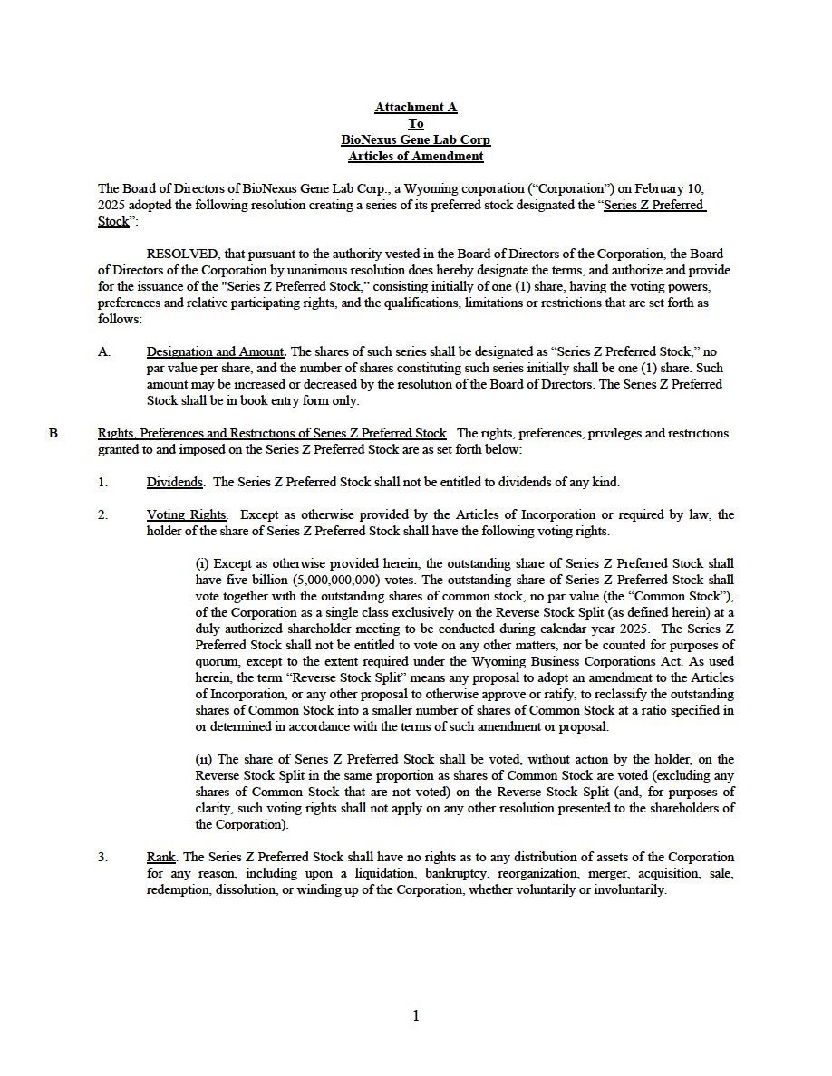 As stated in the Amendment, the outstanding share of Series Z Preferred Stock shall have five billion (5,000,000,000) votes. The outstanding share of Series Z Preferred Stock shall vote together with the outstanding shares of common stock, no par value (the “Common Stock”), of the Corporation as a single class exclusively on the Reverse Stock Split (as defined herein) at a duly authorized shareholder meeting to be conducted during calendar year 2025. The Series Z Preferred Stock will not be entitled to vote on any other matters, nor be counted for purposes of quorum, except to the extent required under the Wyoming Business Corporations Act. “Reverse Stock Split” means any proposal to adopt an amendment to the Articles of Incorporation, or any other proposal to otherwise approve or ratify, to reclassify the outstanding shares of Common Stock into a smaller number of shares of Common Stock at a ratio specified in or determined in accordance with the terms of such amendment or proposal.