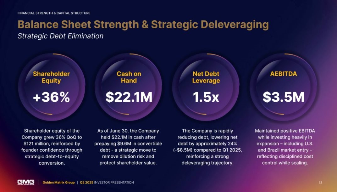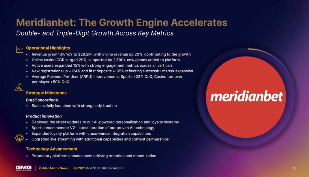米国ラスベガス、2025年8月6日 - オンラインゲームプラットフォームの開発、ライセンサー、および世界的な運営会社であるゴールデン・マトリックス・グループ・インク(NASDAQ: GMGI)(以下「ゴールデン・マトリックス」または「当社」)は本日、2025年6月30日に終了した第2四半期の財務および経営成績を発表しました。当四半期の営業指標は加速し、引き続き好調を維持しました。メリディアンベットの賭け金ボリュームは製品強化により30%増加し、新規登録者数は124%増加しました。