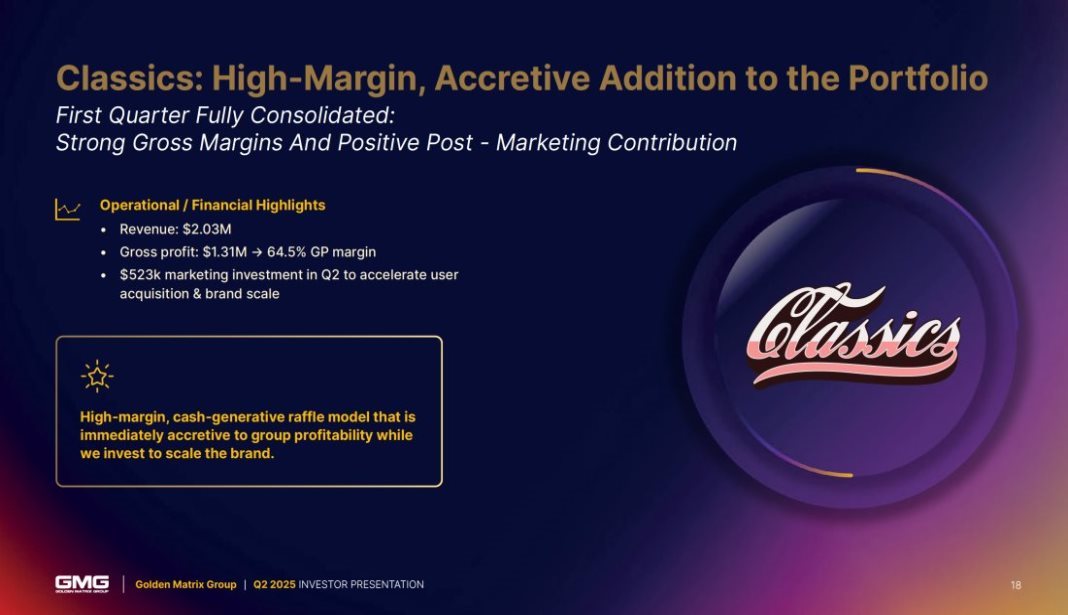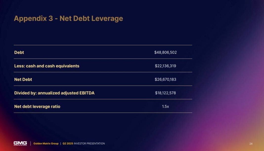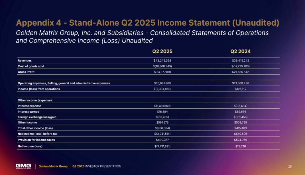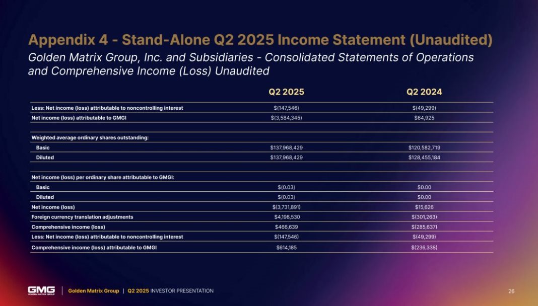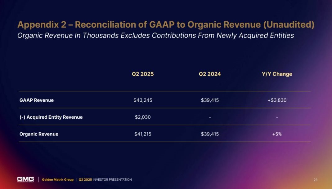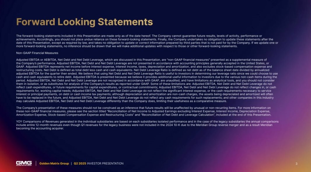 GAAP会計およびメリディアンベットが会計上の買収者である点で、提示された比較は正しく記載されており、当社の新体制を反映しています。GAAPの観点で示された比較は、メリディアンベット・グループの過去の業績に対する連結会社の業績であり、ゴールデン・マトリックス・グループの過去の業績に対するものではありません。