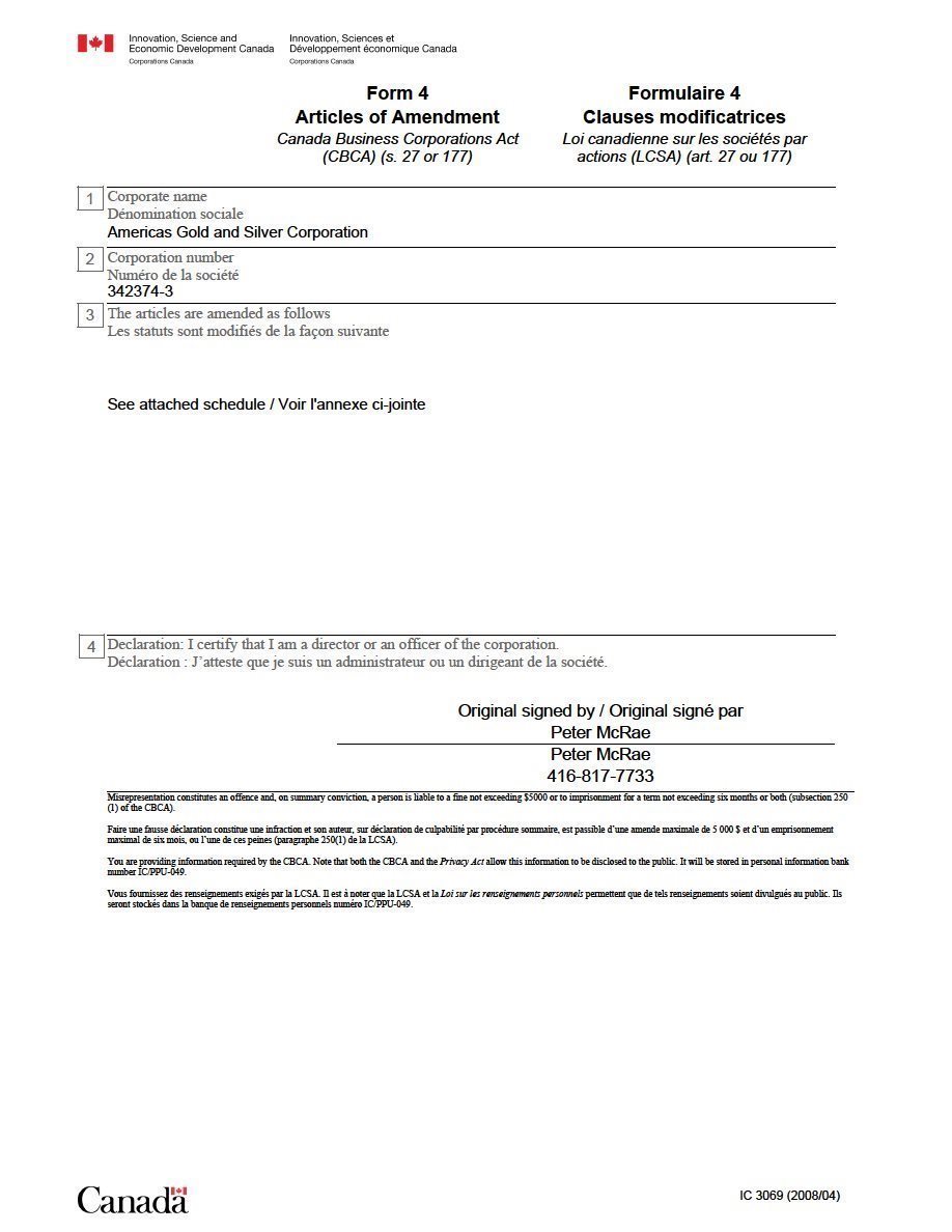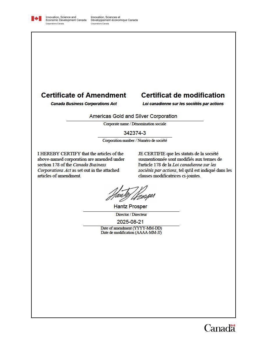 | Americas Gold and Silver Corporation (the “Company”) 145 King Street West, Suite 2870 Toronto, Ontario M5H 1J8 |