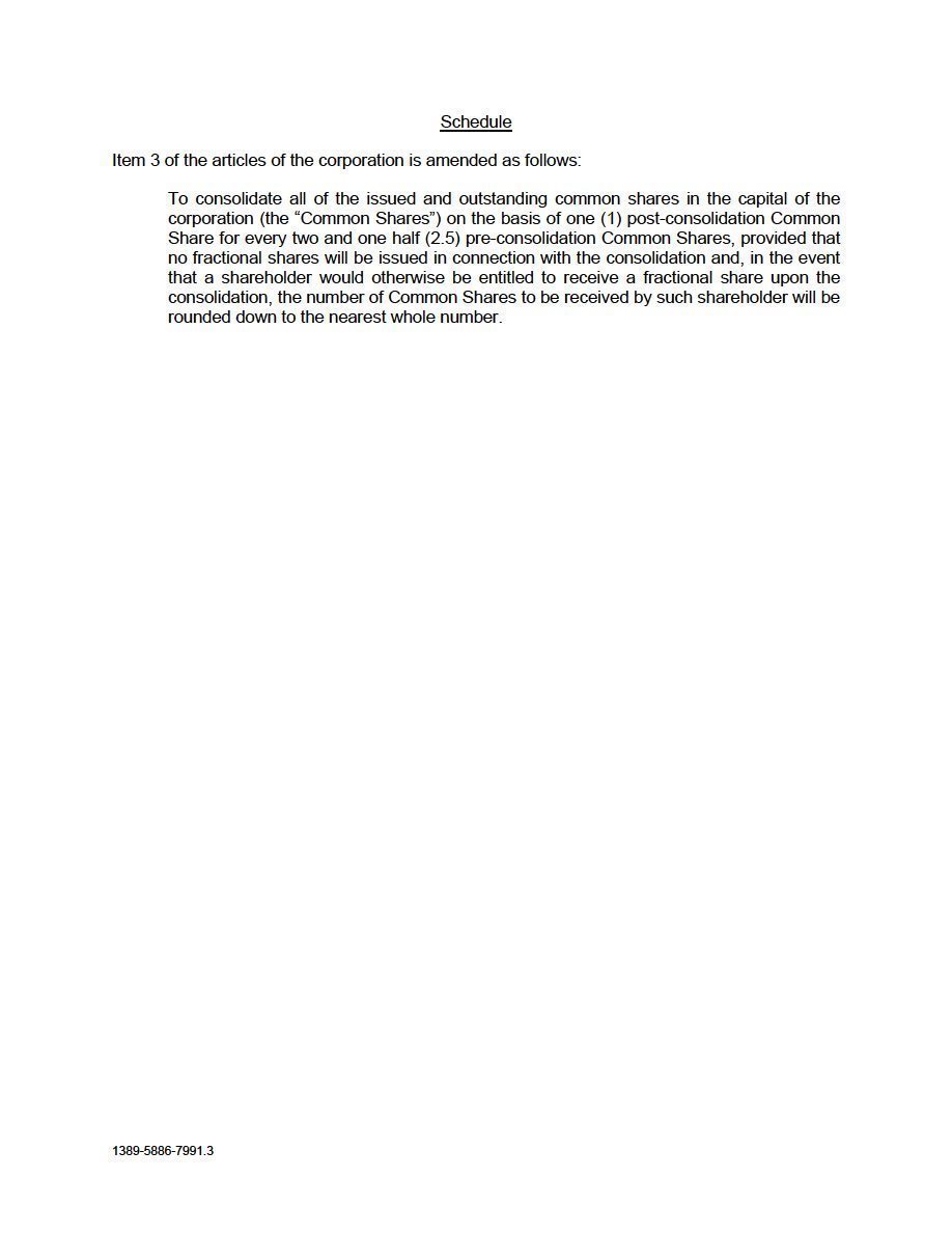 AND WHEREAS on the date hereof, the Corporation will be effecting the consolidation of its issued and outstanding common shares (the “Common Shares”) on the basis of one (1) new Common Share for every two and one half (2.5) old Common Shares (the “Share Consolidation”);