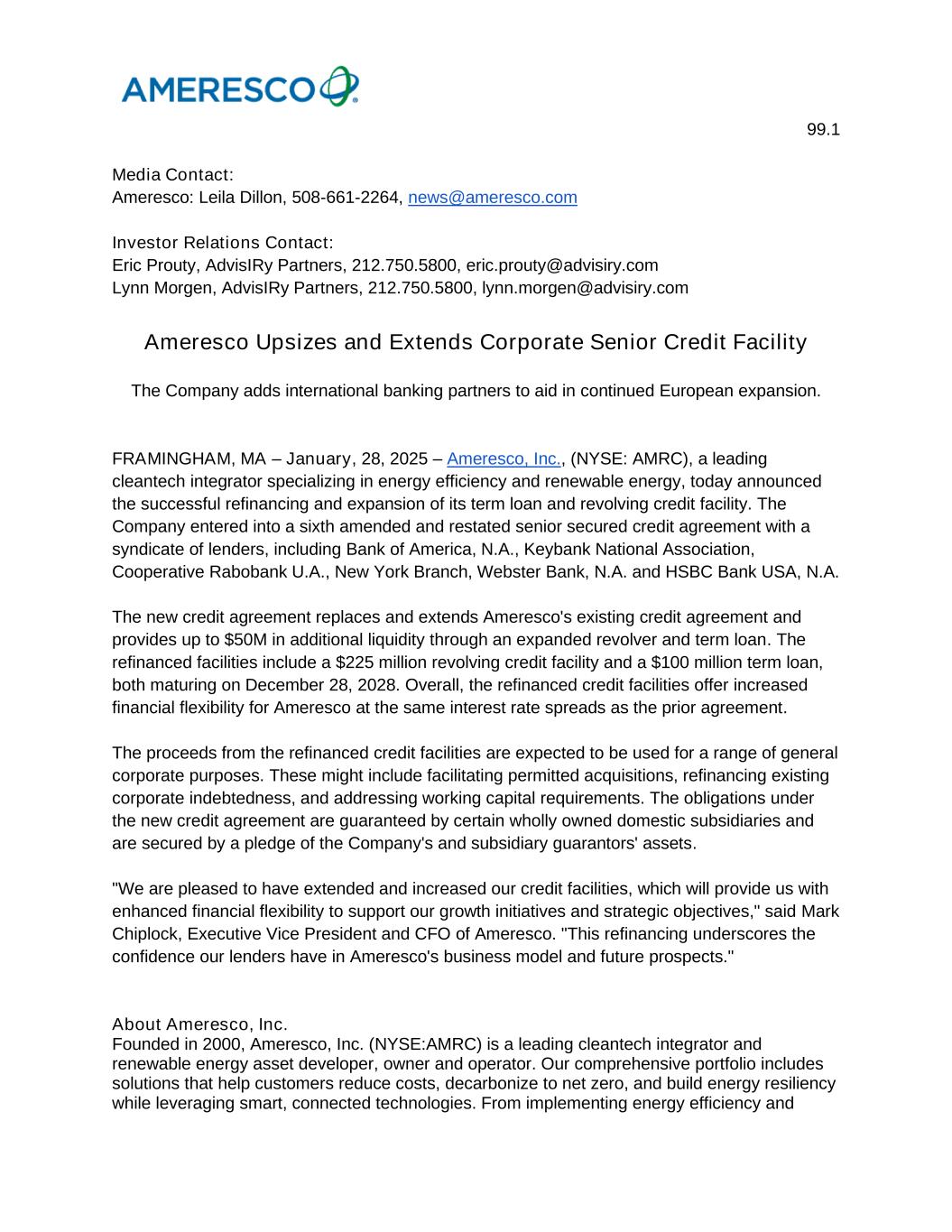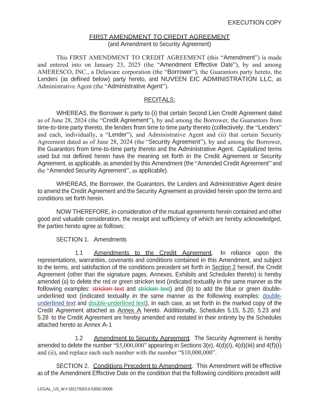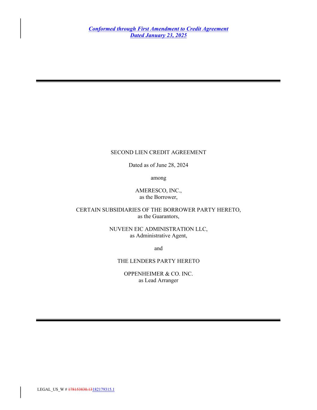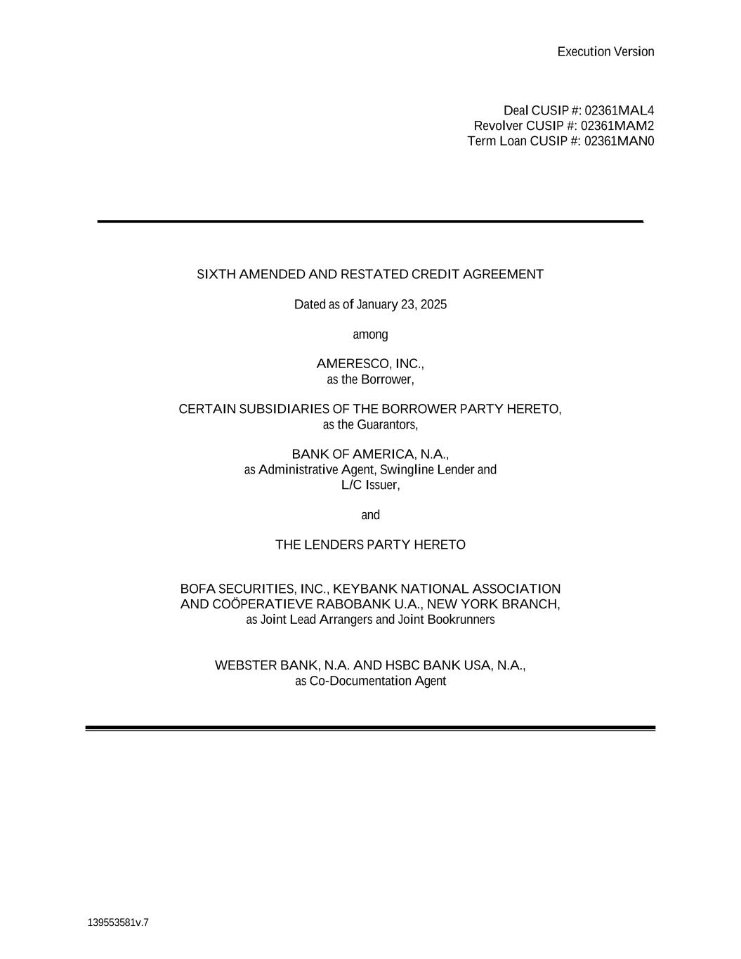 Execution Version Deal CUSIP #: 02361MAL4 Revolver CUSIP #: 02361MAM2 Term Loan CUSIP #: 02361MAN0 SIXTH AMENDED AND RESTATED CREDIT AGREEMENT Dated as of January 23, 2025 among AMERESCO, INC., as the Borrower, CERTAIN SUBSIDIARIES OF THE BORROWER PARTY HERETO, as the Guarantors, BANK OF AMERICA, N.A., as Administrative Agent, Swingline Lender and L/C Issuer, and THE LENDERS PARTY HERETO BOFA SECURITIES, INC., KEYBANK NATIONAL ASSOCIATION AND COÖPERATIEVE RABOBANK U.A., NEW YORK BRANCH, as Joint Lead Arrangers and Joint Bookrunners WEBSTER BANK, N.A. AND HSBC BANK USA, N.A., as Co-Documentation Agent 139553581v.7