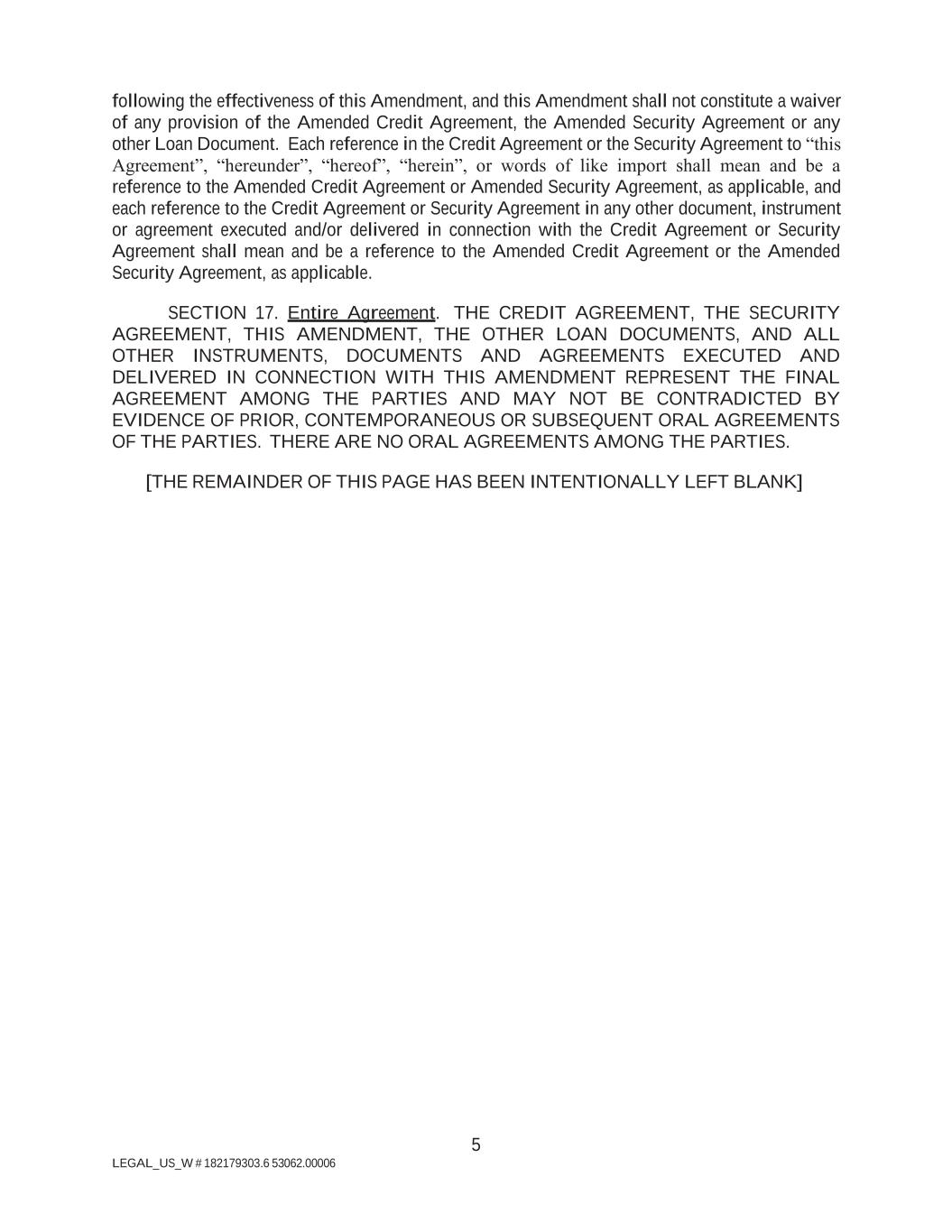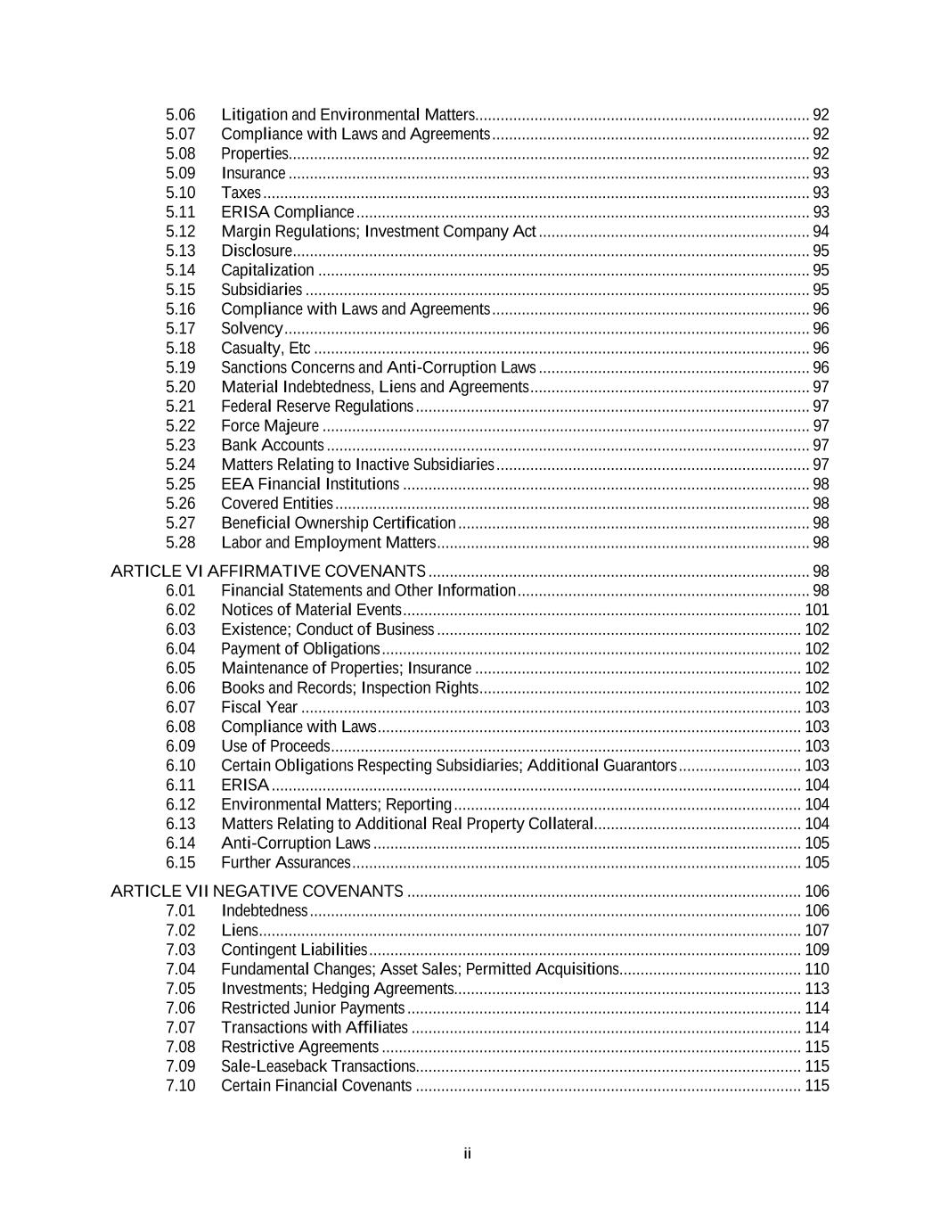 ii 5.06 Litigation and Environmental Matters ............................................................................... 92 5.07 Compliance with Laws and Agreements ........................................................................... 92 5.08 Properties ........................................................................................................................... 92 5.09 Insurance ........................................................................................................................... 93 5.10 Taxes ................................................................................................................................. 93 5.11 ERISA Compliance ........................................................................................................... 93 5.12 Margin Regulations; Investment Company Act ................................................................ 94 5.13 Disclosure .......................................................................................................................... 95 5.14 Capitalization .................................................................................................................... 95 5.15 Subsidiaries ....................................................................................................................... 95 5.16 Compliance with Laws and Agreements ........................................................................... 96 5.17 Solvency ............................................................................................................................ 96 5.18 Casualty, Etc ..................................................................................................................... 96 5.19 Sanctions Concerns and Anti-Corruption Laws ................................................................ 96 5.20 Material Indebtedness, Liens and Agreements .................................................................. 97 5.21 Federal Reserve Regulations ............................................................................................. 97 5.22 Force Majeure ................................................................................................................... 97 5.23 Bank Accounts .................................................................................................................. 97 5.24 Matters Relating to Inactive Subsidiaries .......................................................................... 97 5.25 EEA Financial Institutions ................................................................................................ 98 5.26 Covered Entities ................................................................................................................ 98 5.27 Beneficial Ownership Certification ................................................................................... 98 5.28 Labor and Employment Matters ........................................................................................ 98 ARTICLE VI AFFIRMATIVE COVENANTS .......................................................................................... 98 6.01 Financial Statements and Other Information ..................................................................... 98 6.02 Notices of Material Events .............................................................................................. 101 6.03 Existence; Conduct of Business ...................................................................................... 102 6.04 Payment of Obligations ................................................................................................... 102 6.05 Maintenance of Properties; Insurance ............................................................................. 102 6.06 Books and Records; Inspection Rights ............................................................................ 102 6.07 Fiscal Year ...................................................................................................................... 103 6.08 Compliance with Laws .................................................................................................... 103 6.09 Use of Proceeds ............................................................................................................... 103 6.10 Certain Obligations Respecting Subsidiaries; Additional Guarantors ............................. 103 6.11 ERISA ............................................................................................................................. 104 6.12 Environmental Matters; Reporting .................................................................................. 104 6.13 Matters Relating to Additional Real Property Collateral ................................................. 104 6.14 Anti-Corruption Laws ..................................................................................................... 105 6.15 Further Assurances .......................................................................................................... 105 ARTICLE VII NEGATIVE COVENANTS ............................................................................................. 106 7.01 Indebtedness .................................................................................................................... 106 7.02 Liens ................................................................................................................................ 107 7.03 Contingent Liabilities ...................................................................................................... 109 7.04 Fundamental Changes; Asset Sales; Permitted Acquisitions ........................................... 110 7.05 Investments; Hedging Agreements.................................................................................. 113 7.06 Restricted Junior Payments ............................................................................................. 114 7.0
