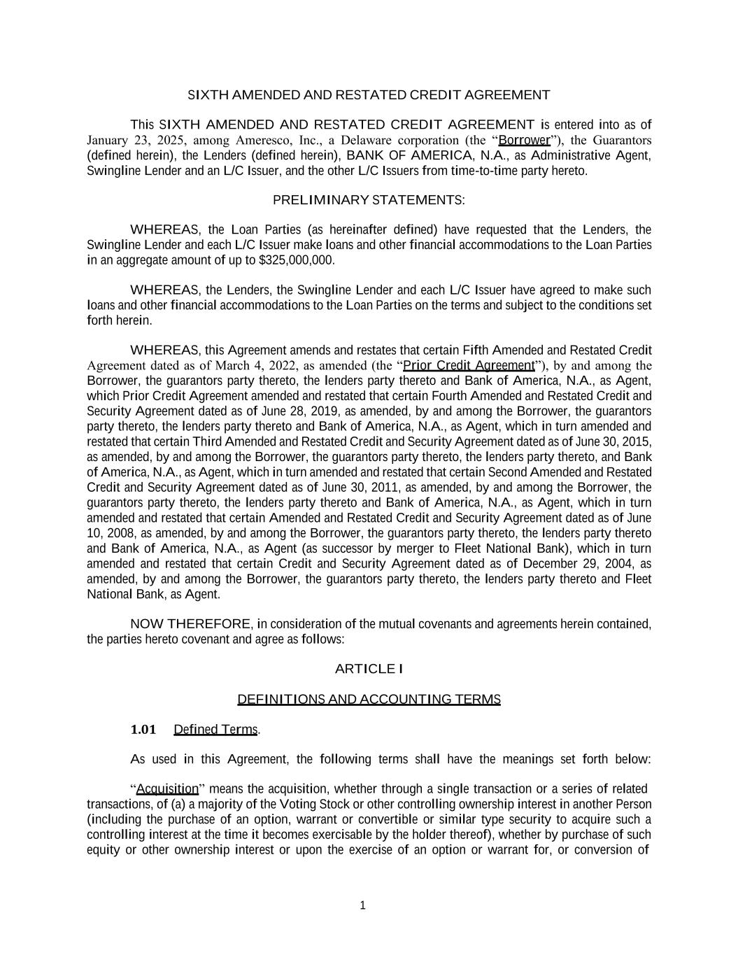 1 SIXTH AMENDED AND RESTATED CREDIT AGREEMENT This SIXTH AMENDED AND RESTATED CREDIT AGREEMENT is entered into as of January 23, 2025, among Ameresco, Inc., a Delaware corporation (the “Borrower”), the Guarantors (defined herein), the Lenders (defined herein), BANK OF AMERICA, N.A., as Administrative Agent, Swingline Lender and an L/C Issuer, and the other L/C Issuers from time-to-time party hereto. PRELIMINARY STATEMENTS: WHEREAS, the Loan Parties (as hereinafter defined) have requested that the Lenders, the Swingline Lender and each L/C Issuer make loans and other financial accommodations to the Loan Parties in an aggregate amount of up to $325,000,000. WHEREAS, the Lenders, the Swingline Lender and each L/C Issuer have agreed to make such loans and other financial accommodations to the Loan Parties on the terms and subject to the conditions set forth herein. WHEREAS, this Agreement amends and restates that certain Fifth Amended and Restated Credit Agreement dated as of March 4, 2022, as amended (the “Prior Credit Agreement”), by and among the Borrower, the guarantors party thereto, the lenders party thereto and Bank of America, N.A., as Agent, which Prior Credit Agreement amended and restated that certain Fourth Amended and Restated Credit and Security Agreement dated as of June 28, 2019, as amended, by and among the Borrower, the guarantors party thereto, the lenders party thereto and Bank of America, N.A., as Agent, which in turn amended and restated that certain Third Amended and Restated Credit and Security Agreement dated as of June 30, 2015, as amended, by and among the Borrower, the guarantors party thereto, the lenders party thereto, and Bank of America, N.A., as Agent, which in turn amended and restated that certain Second Amended and Restated Credit and Security Agreement dated as of June 30, 2011, as amended, by and among the Borrower, the guarantors party thereto, the lenders party thereto and Bank of America, N.A., as Agent, which in turn amended and restated that certain Amended and Restated Credit and Security Agreement dated as of June 10, 2008, as amended, by and among the Borrower, the guarantors party thereto, the lenders party thereto and Bank of America, N.A., as Agent (as successor by merger to Fleet National Bank), which in turn amended and restated that certain Credit and Security Agreement dated as of December 29, 2004, as amended, by and among the Borrower, the guarantors party thereto, the lenders party thereto and Fleet National Bank, as Agent. NOW THEREFORE, in consideration of the mutual covenants and agreements herein contained, the parties hereto covenant and agree as follows: ARTICLE I DEFINITIONS AND ACCOUNTING TERMS 1.01 Defined Terms. As used in this Agreement, the following terms shall have the meanings set forth below: “Acquisition” means the acquisition, whether through a single transaction or a series of related transactions, of (a) a majority of the Voting Stock or other controlling ownership interest in another Person (including the purchase of an option, warrant or convertible or similar type security to acquire such a controlling interest at the time it becomes exercisable by the holder thereof), whether by purchase of such equity or other ownership interest or upon the exercise of an option or warrant for, or conversion of