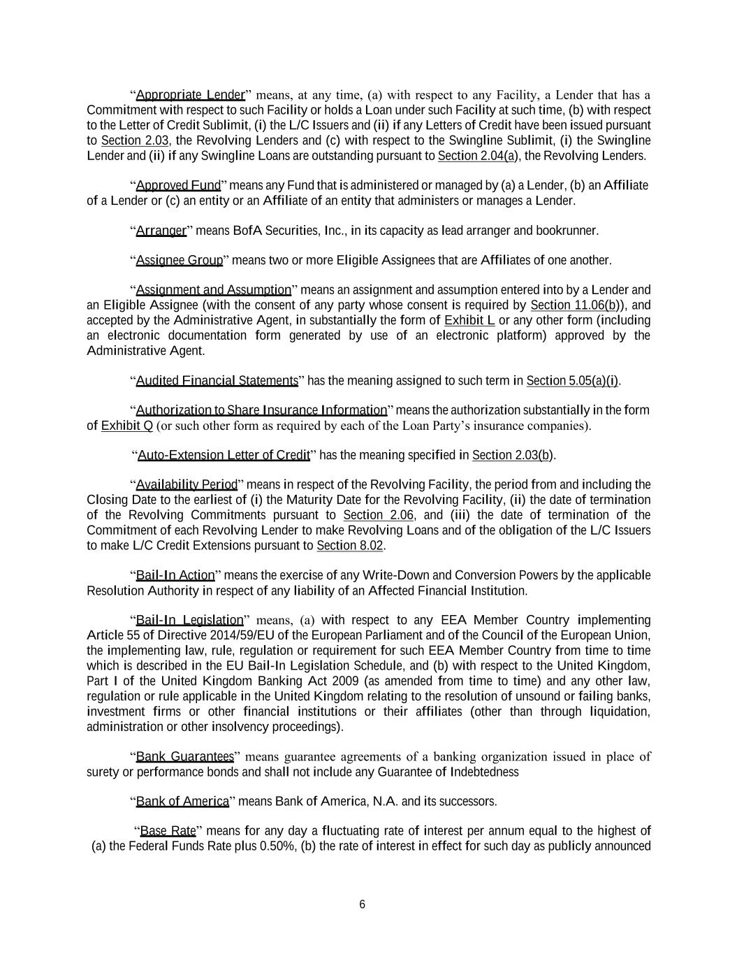 6 “Appropriate Lender” means, at any time, (a) with respect to any Facility, a Lender that has a Commitment with respect to such Facility or holds a Loan under such Facility at such time, (b) with respect to the Letter of Credit Sublimit, (i) the L/C Issuers and (ii) if any Letters of Credit have been issued pursuant to Section 2.03, the Revolving Lenders and (c) with respect to the Swingline Sublimit, (i) the Swingline Lender and (ii) if any Swingline Loans are outstanding pursuant to Section 2.04(a), the Revolving Lenders. “Approved Fund” means any Fund that is administered or managed by (a) a Lender, (b) an Affiliate of a Lender or (c) an entity or an Affiliate of an entity that administers or manages a Lender. “Arranger” means BofA Securities, Inc., in its capacity as lead arranger and bookrunner. “Assignee Group” means two or more Eligible Assignees that are Affiliates of one another. “Assignment and Assumption” means an assignment and assumption entered into by a Lender and an Eligible Assignee (with the consent of any party whose consent is required by Section 11.06(b)), and accepted by the Administrative Agent, in substantially the form of Exhibit L or any other form (including an electronic documentation form generated by use of an electronic platform) approved by the Administrative Agent. “Audited Financial Statements” has the meaning assigned to such term in Section 5.05(a)(i). “Authorization to Share Insurance Information” means the authorization substantially in the form of Exhibit Q (or such other form as required by each of the Loan Party’s insurance companies). “Auto-Extension Letter of Credit” has the meaning specified in Section 2.03(b). “Availability Period” means in respect of the Revolving Facility, the period from and including the Closing Date to the earliest of (i) the Maturity Date for the Revolving Facility, (ii) the date of termination of the Revolving Commitments pursuant to Section 2.06, and (iii) the date of termination of the Commitment of each Revolving Lender to make Revolving Loans and of the obligation of the L/C Issuers to make L/C Credit Extensions pursuant to Section 8.02. “Bail-In Action” means the exercise of any Write-Down and Conversion Powers by the applicable Resolution Authority in respect of any liability of an Affected Financial Institution. “Bail-In Legislation” means, (a) with respect to any EEA Member Country implementing Article 55 of Directive 2014/59/EU of the European Parliament and of the Council of the European Union, the implementing law, rule, regulation or requirement for such EEA Member Country from time to time which is described in the EU Bail-In Legislation Schedule, and (b) with respect to the United Kingdom, Part I of the United Kingdom Banking Act 2009 (as amended from time to time) and any other law, regulation or rule applicable in the United Kingdom relating to the resolution of unsound or failing banks, investment firms or other financial institutions or their affiliates (other than through liquidation, administration or other insolvency proceedings). “Bank Guarantees” means guarantee agreements of a banking organization issued in place of surety or performance bonds and shall not include any Guarantee of Indebtedness “Bank of America” means Bank of America, N.A. and its successors. “Base Rate” means for any day a fluctuating rate of interest per annum equal to the highest of (a) the Federal Funds Rate plus 0.50%, (b) the rate of interest in effect for such day as publicly announced