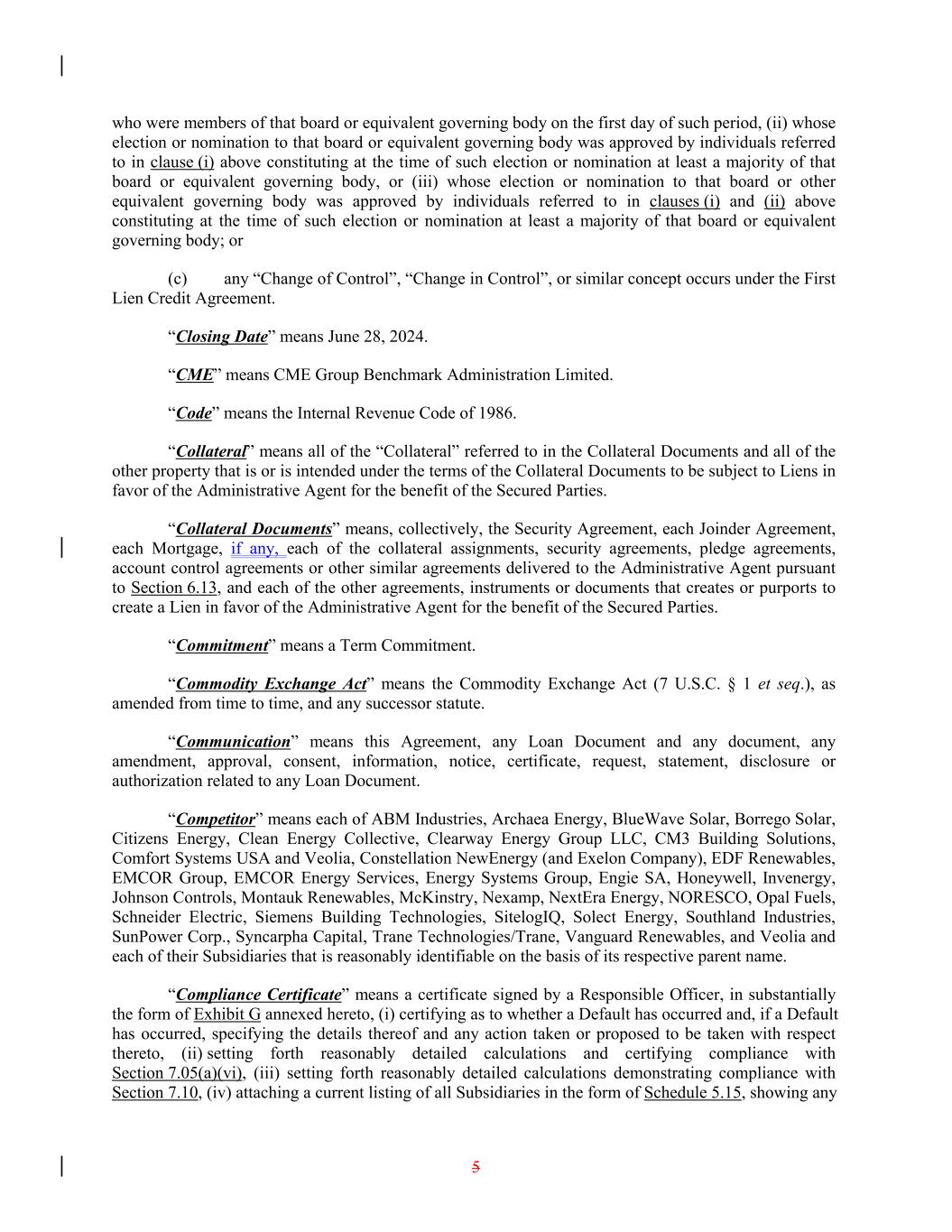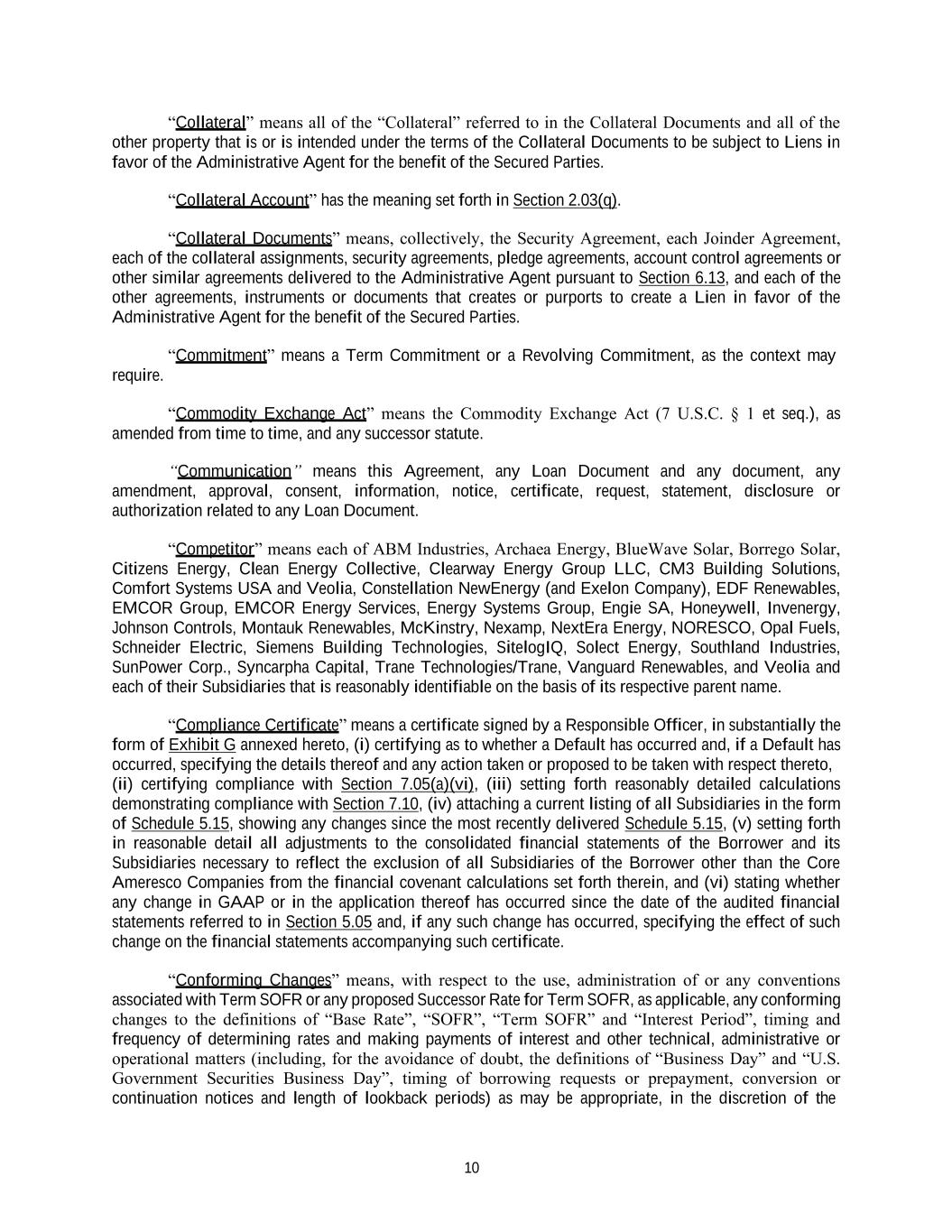 10 “Collateral” means all of the “Collateral” referred to in the Collateral Documents and all of the other property that is or is intended under the terms of the Collateral Documents to be subject to Liens in favor of the Administrative Agent for the benefit of the Secured Parties. “Collateral Account” has the meaning set forth in Section 2.03(q). “Collateral Documents” means, collectively, the Security Agreement, each Joinder Agreement, each of the collateral assignments, security agreements, pledge agreements, account control agreements or other similar agreements delivered to the Administrative Agent pursuant to Section 6.13, and each of the other agreements, instruments or documents that creates or purports to create a Lien in favor of the Administrative Agent for the benefit of the Secured Parties. “Commitment” means a Term Commitment or a Revolving Commitment, as the context may require. “Commodity Exchange Act” means the Commodity Exchange Act (7 U.S.C. § 1 et seq.), as amended from time to time, and any successor statute. “Communication” means this Agreement, any Loan Document and any document, any amendment, approval, consent, information, notice, certificate, request, statement, disclosure or authorization related to any Loan Document. “Competitor” means each of ABM Industries, Archaea Energy, BlueWave Solar, Borrego Solar, Citizens Energy, Clean Energy Collective, Clearway Energy Group LLC, CM3 Building Solutions, Comfort Systems USA and Veolia, Constellation NewEnergy (and Exelon Company), EDF Renewables, EMCOR Group, EMCOR Energy Services, Energy Systems Group, Engie SA, Honeywell, Invenergy, Johnson Controls, Montauk Renewables, McKinstry, Nexamp, NextEra Energy, NORESCO, Opal Fuels, Schneider Electric, Siemens Building Technologies, SitelogIQ, Solect Energy, Southland Industries, SunPower Corp., Syncarpha Capital, Trane Technologies/Trane, Vanguard Renewables, and Veolia and each of their Subsidiaries that is reasonably identifiable on the basis of its respective parent name. “Compliance Certificate” means a certificate signed by a Responsible Officer, in substantially the form of Exhibit G annexed hereto, (i) certifying as to whether a Default has occurred and, if a Default has occurred, specifying the details thereof and any action taken or proposed to be taken with respect thereto, (ii) certifying compliance with Section 7.05(a)(vi), (iii) setting forth reasonably detailed calculations demonstrating compliance with Section 7.10, (iv) attaching a current listing of all Subsidiaries in the form of Schedule 5.15, showing any changes since the most recently delivered Schedule 5.15, (v) setting forth in reasonable detail all adjustments to the consolidated financial statements of the Borrower and its Subsidiaries necessary to reflect the exclusion of all Subsidiaries of the Borrower other than the Core Ameresco Companies from the financial covenant calculations set forth therein, and (vi) stating whether any change in GAAP or in the application thereof has occurred since the date of the audited financial statements referred to in Section 5.05 and, if any such change has occurred, specifying the effect of such change on the financial statements accompanying such certificate. “Conforming Changes” means, with respect to the use, administration of or any conventions associated with Term SOFR or any proposed Successor Rate for Term SOFR, as applicable, any conforming changes to the definitions of “Base Rate”, “SOFR”, “Term SOFR” and “Interest Period”, timing and frequency of determining rates and making payments of interest and other technical, administrative or operational matters (including, for the avoidance of doubt, the definitions of “Business Day” and “U.S. Government Securities Business Day”, timing of borrowing requests or prepayment, conversion or continuation notices and length of lookback periods) as may be appropriate, in the discretion of the