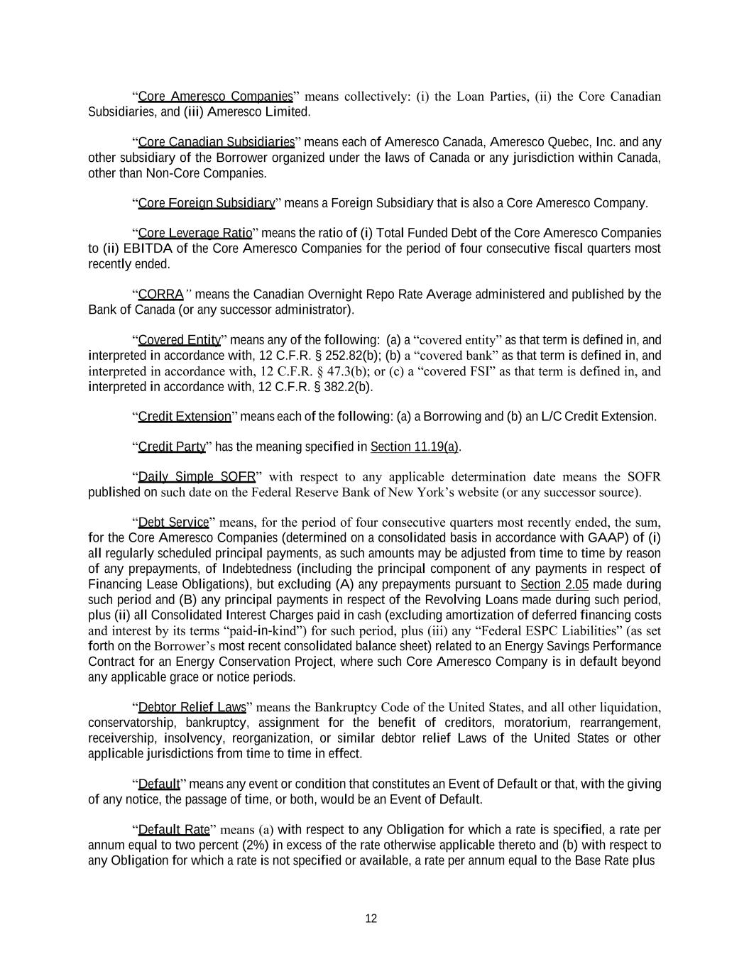 12 “Core Ameresco Companies” means collectively: (i) the Loan Parties, (ii) the Core Canadian Subsidiaries, and (iii) Ameresco Limited. “Core Canadian Subsidiaries” means each of Ameresco Canada, Ameresco Quebec, Inc. and any other subsidiary of the Borrower organized under the laws of Canada or any jurisdiction within Canada, other than Non-Core Companies. “Core Foreign Subsidiary” means a Foreign Subsidiary that is also a Core Ameresco Company. “Core Leverage Ratio” means the ratio of (i) Total Funded Debt of the Core Ameresco Companies to (ii) EBITDA of the Core Ameresco Companies for the period of four consecutive fiscal quarters most recently ended. “CORRA” means the Canadian Overnight Repo Rate Average administered and published by the Bank of Canada (or any successor administrator). “Covered Entity” means any of the following: (a) a “covered entity” as that term is defined in, and interpreted in accordance with, 12 C.F.R. § 252.82(b); (b) a “covered bank” as that term is defined in, and interpreted in accordance with, 12 C.F.R. § 47.3(b); or (c) a “covered FSI” as that term is defined in, and interpreted in accordance with, 12 C.F.R. § 382.2(b). “Credit Extension” means each of the following: (a) a Borrowing and (b) an L/C Credit Extension. “Credit Party” has the meaning specified in Section 11.19(a). “Daily Simple SOFR” with respect to any applicable determination date means the SOFR published on such date on the Federal Reserve Bank of New York’s website (or any successor source). “Debt Service” means, for the period of four consecutive quarters most recently ended, the sum, for the Core Ameresco Companies (determined on a consolidated basis in accordance with GAAP) of (i) all regularly scheduled principal payments, as such amounts may be adjusted from time to time by reason of any prepayments, of Indebtedness (including the principal component of any payments in respect of Financing Lease Obligations), but excluding (A) any prepayments pursuant to Section 2.05 made during such period and (B) any principal payments in respect of the Revolving Loans made during such period, plus (ii) all Consolidated Interest Charges paid in cash (excluding amortization of deferred financing costs and interest by its terms “paid-in-kind”) for such period, plus (iii) any “Federal ESPC Liabilities” (as set forth on the Borrower’s most recent consolidated balance sheet) related to an Energy Savings Performance Contract for an Energy Conservation Project, where such Core Ameresco Company is in default beyond any applicable grace or notice periods. “Debtor Relief Laws” means the Bankruptcy Code of the United States, and all other liquidation, conservatorship, bankruptcy, assignment for the benefit of creditors, moratorium, rearrangement, receivership, insolvency, reorganization, or similar debtor relief Laws of the United States or other applicable jurisdictions from time to time in effect. “Default” means any event or condition that constitutes an Event of Default or that, with the giving of any notice, the passage of time, or both, would be an Event of Default. “Default Rate” means (a) with respect to any Obligation for which a rate is specified, a rate per annum equal to two percent (2%) in excess of the rate otherwise applicable thereto and (b) with respect to any Obligation for which a rate is not specified or available, a rate per annum equal to the Base Rate plus