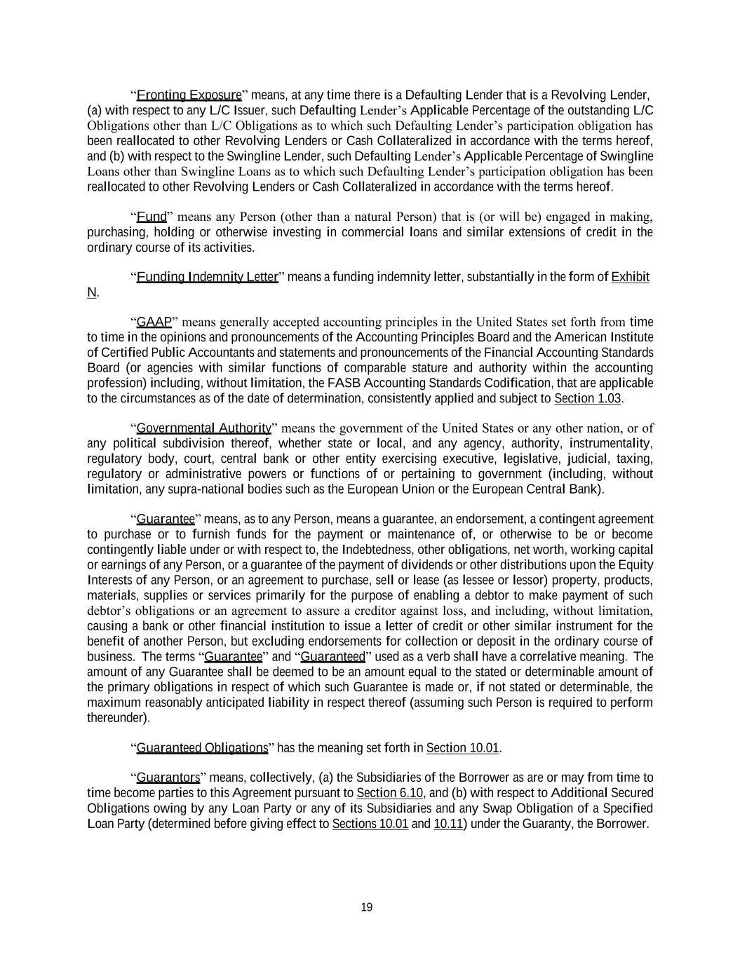 19 “Fronting Exposure” means, at any time there is a Defaulting Lender that is a Revolving Lender, (a) with respect to any L/C Issuer, such Defaulting Lender’s Applicable Percentage of the outstanding L/C Obligations other than L/C Obligations as to which such Defaulting Lender’s participation obligation has been reallocated to other Revolving Lenders or Cash Collateralized in accordance with the terms hereof, and (b) with respect to the Swingline Lender, such Defaulting Lender’s Applicable Percentage of Swingline Loans other than Swingline Loans as to which such Defaulting Lender’s participation obligation has been reallocated to other Revolving Lenders or Cash Collateralized in accordance with the terms hereof. “Fund” means any Person (other than a natural Person) that is (or will be) engaged in making, purchasing, holding or otherwise investing in commercial loans and similar extensions of credit in the ordinary course of its activities. “Funding Indemnity Letter” means a funding indemnity letter, substantially in the form of Exhibit N. “GAAP” means generally accepted accounting principles in the United States set forth from time to time in the opinions and pronouncements of the Accounting Principles Board and the American Institute of Certified Public Accountants and statements and pronouncements of the Financial Accounting Standards Board (or agencies with similar functions of comparable stature and authority within the accounting profession) including, without limitation, the FASB Accounting Standards Codification, that are applicable to the circumstances as of the date of determination, consistently applied and subject to Section 1.03. “Governmental Authority” means the government of the United States or any other nation, or of any political subdivision thereof, whether state or local, and any agency, authority, instrumentality, regulatory body, court, central bank or other entity exercising executive, legislative, judicial, taxing, regulatory or administrative powers or functions of or pertaining to government (including, without limitation, any supra-national bodies such as the European Union or the European Central Bank). “Guarantee” means, as to any Person, means a guarantee, an endorsement, a contingent agreement to purchase or to furnish funds for the payment or maintenance of, or otherwise to be or become contingently liable under or with respect to, the Indebtedness, other obligations, net worth, working capital or earnings of any Person, or a guarantee of the payment of dividends or other distributions upon the Equity Interests of any Person, or an agreement to purchase, sell or lease (as lessee or lessor) property, products, materials, supplies or services primarily for the purpose of enabling a debtor to make payment of such debtor’s obligations or an agreement to assure a creditor against loss, and including, without limitation, causing a bank or other financial institution to issue a letter of credit or other similar instrument for the benefit of another Person, but excluding endorsements for collection or deposit in the ordinary course of business. The terms “Guarantee” and “Guaranteed” used as a verb shall have a correlative meaning. The amount of any Guarantee shall be deemed to be an amount equal to the stated or determinable amount of the primary obligations in respect of which such Guarantee is made or, if not stated or determinable, the maximum reasonably anticipated liability in respect thereof (assuming such Person is required to perform thereunder). “Guaranteed Obligations” has the meaning set forth in Section 10.01. “Guarantors” means, collectively, (a) the Subsidiaries of the Borrower as are or may from time to time become parties to this Agreement pursuant to Section 6.10, and (b) with respect to Additional Secured Obligations owing by any Loan Party or any of its Subsidiaries and any Swap Obligation of a Specified Loan Party (determined before giving effect to Sections 10.01 and 10.11) under the Guaranty, the Borrower.