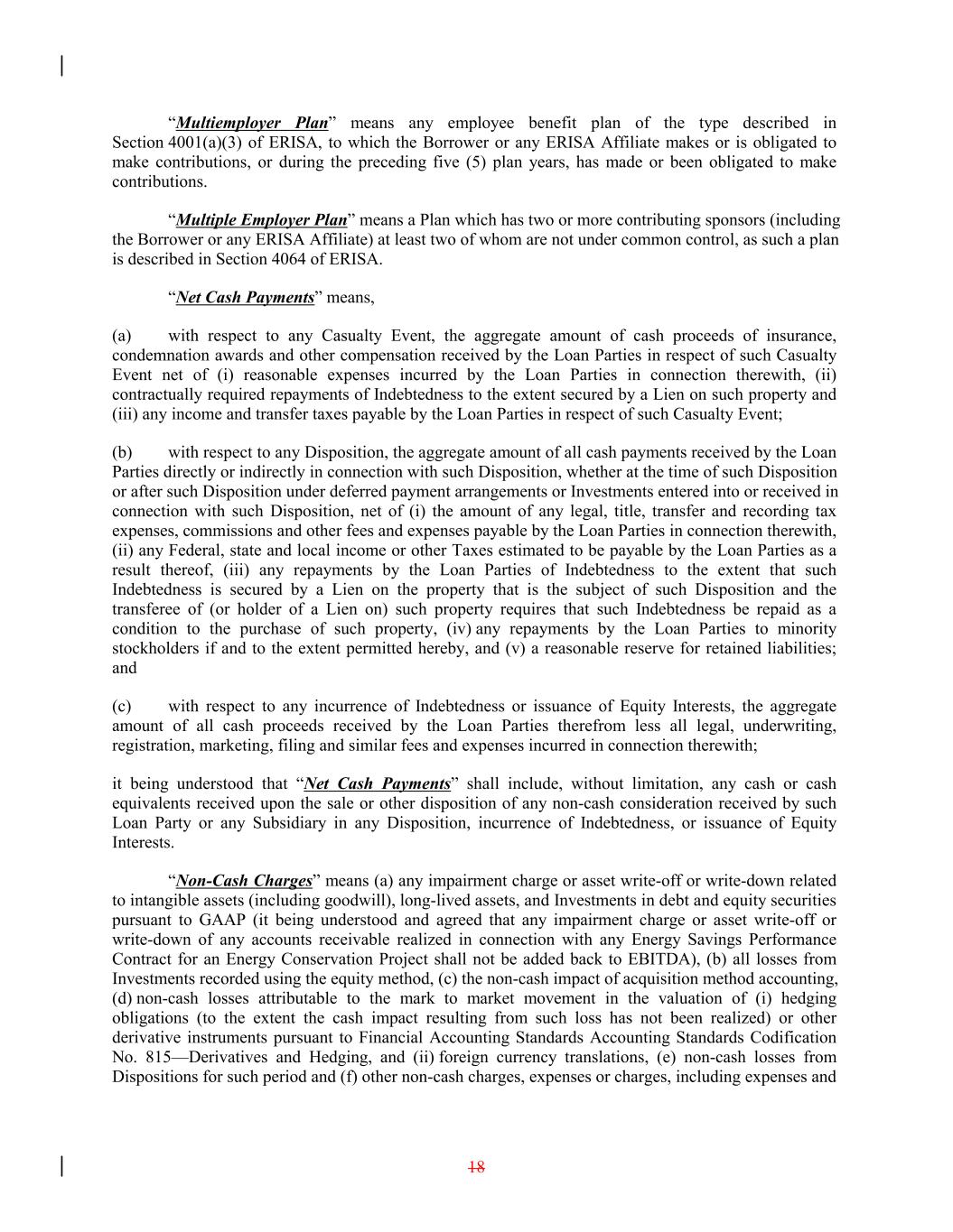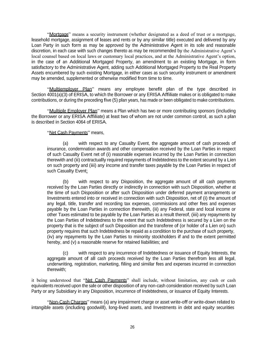 26 “Mortgage” means a security instrument (whether designated as a deed of trust or a mortgage, leasehold mortgage, assignment of leases and rents or by any similar title) executed and delivered by any Loan Party in such form as may be approved by the Administrative Agent in its sole and reasonable discretion, in each case with such changes thereto as may be recommended by the Administrative Agent’s local counsel based on local laws or customary local practices, and at the Administrative Agent’s option, in the case of an Additional Mortgaged Property, an amendment to an existing Mortgage, in form satisfactory to the Administrative Agent, adding such Additional Mortgaged Property to the Real Property Assets encumbered by such existing Mortgage, in either cases as such security instrument or amendment may be amended, supplemented or otherwise modified from time to time. “Multiemployer Plan” means any employee benefit plan of the type described in Section 4001(a)(3) of ERISA, to which the Borrower or any ERISA Affiliate makes or is obligated to make contributions, or during the preceding five (5) plan years, has made or been obligated to make contributions. “Multiple Employer Plan” means a Plan which has two or more contributing sponsors (including the Borrower or any ERISA Affiliate) at least two of whom are not under common control, as such a plan is described in Section 4064 of ERISA. “Net Cash Payments” means, (a) with respect to any Casualty Event, the aggregate amount of cash proceeds of insurance, condemnation awards and other compensation received by the Loan Parties in respect of such Casualty Event net of (i) reasonable expenses incurred by the Loan Parties in connection therewith and (ii) contractually required repayments of Indebtedness to the extent secured by a Lien on such property and (iii) any income and transfer taxes payable by the Loan Parties in respect of such Casualty Event; (b) with respect to any Disposition, the aggregate amount of all cash payments received by the Loan Parties directly or indirectly in connection with such Disposition, whether at the time of such Disposition or after such Disposition under deferred payment arrangements or Investments entered into or received in connection with such Disposition, net of (i) the amount of any legal, title, transfer and recording tax expenses, commissions and other fees and expenses payable by the Loan Parties in connection therewith, (ii) any Federal, state and local income or other Taxes estimated to be payable by the Loan Parties as a result thereof, (iii) any repayments by the Loan Parties of Indebtedness to the extent that such Indebtedness is secured by a Lien on the property that is the subject of such Disposition and the transferee of (or holder of a Lien on) such property requires that such Indebtedness be repaid as a condition to the purchase of such property, (iv) any repayments by the Loan Parties to minority stockholders if and to the extent permitted hereby, and (v) a reasonable reserve for retained liabilities; and (c) with respect to any incurrence of Indebtedness or issuance of Equity Interests, the aggregate amount of all cash proceeds received by the Loan Parties therefrom less all legal, underwriting, registration, marketing, filing and similar fees and expenses incurred in connection therewith; it being understood that “Net Cash Payments” shall include, without limitation, any cash or cash equivalents received upon the sale or other disposition of any non-cash consideration received by such Loan Party or any Subsidiary in any Disposition, incurrence of Indebtedness, or issuance of Equity Interests. “Non-Cash Charges” means (a) any impairment charge or asset write-off or write-down related to intangible assets (including goodwill), long-lived assets, and Investments in debt and equity securities