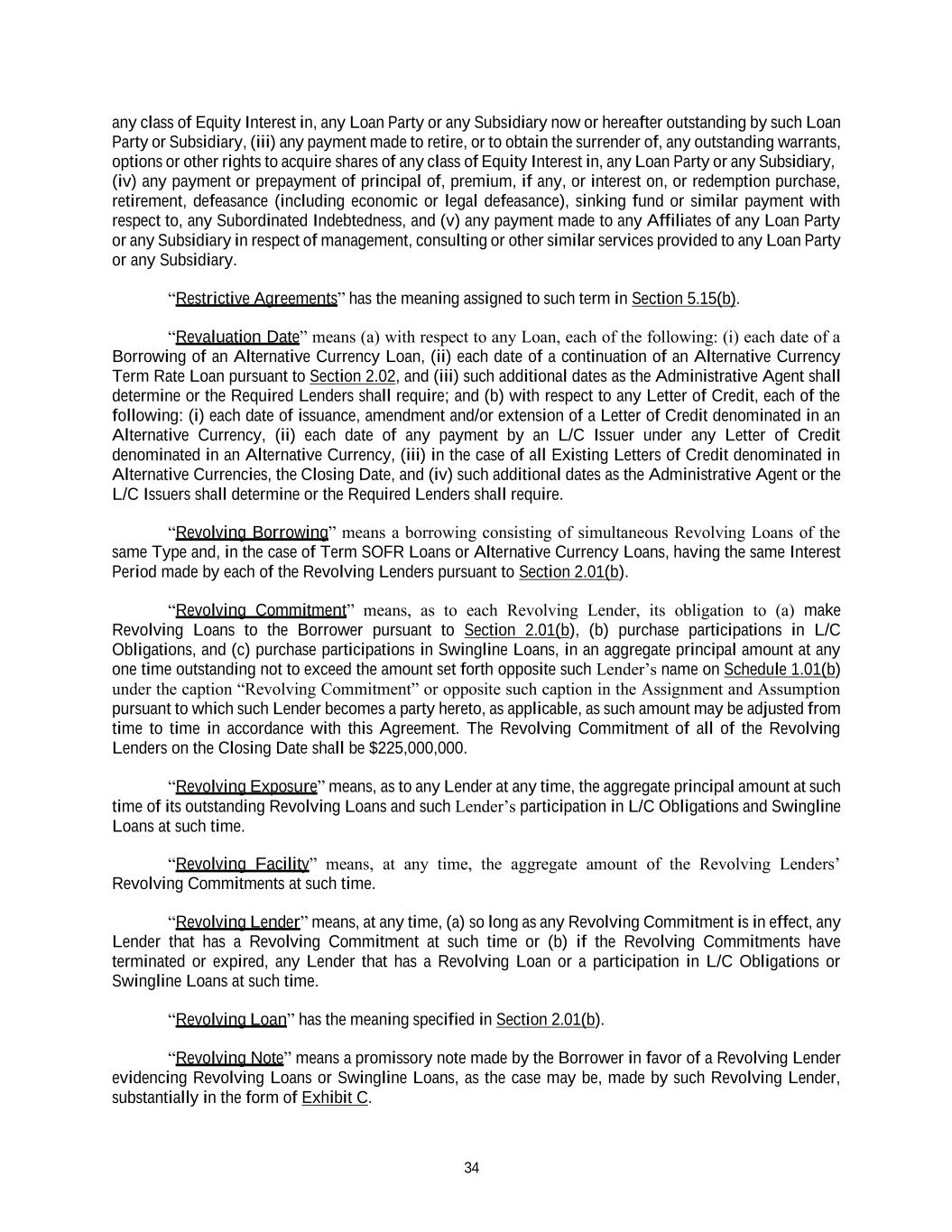 34 any class of Equity Interest in, any Loan Party or any Subsidiary now or hereafter outstanding by such Loan Party or Subsidiary, (iii) any payment made to retire, or to obtain the surrender of, any outstanding warrants, options or other rights to acquire shares of any class of Equity Interest in, any Loan Party or any Subsidiary, (iv) any payment or prepayment of principal of, premium, if any, or interest on, or redemption purchase, retirement, defeasance (including economic or legal defeasance), sinking fund or similar payment with respect to, any Subordinated Indebtedness, and (v) any payment made to any Affiliates of any Loan Party or any Subsidiary in respect of management, consulting or other similar services provided to any Loan Party or any Subsidiary. “Restrictive Agreements” has the meaning assigned to such term in Section 5.15(b). “Revaluation Date” means (a) with respect to any Loan, each of the following: (i) each date of a Borrowing of an Alternative Currency Loan, (ii) each date of a continuation of an Alternative Currency Term Rate Loan pursuant to Section 2.02, and (iii) such additional dates as the Administrative Agent shall determine or the Required Lenders shall require; and (b) with respect to any Letter of Credit, each of the following: (i) each date of issuance, amendment and/or extension of a Letter of Credit denominated in an Alternative Currency, (ii) each date of any payment by an L/C Issuer under any Letter of Credit denominated in an Alternative Currency, (iii) in the case of all Existing Letters of Credit denominated in Alternative Currencies, the Closing Date, and (iv) such additional dates as the Administrative Agent or the L/C Issuers shall determine or the Required Lenders shall require. “Revolving Borrowing” means a borrowing consisting of simultaneous Revolving Loans of the same Type and, in the case of Term SOFR Loans or Alternative Currency Loans, having the same Interest Period made by each of the Revolving Lenders pursuant to Section 2.01(b). “Revolving Commitment” means, as to each Revolving Lender, its obligation to (a) make Revolving Loans to the Borrower pursuant to Section 2.01(b), (b) purchase participations in L/C Obligations, and (c) purchase participations in Swingline Loans, in an aggregate principal amount at any one time outstanding not to exceed the amount set forth opposite such Lender’s name on Schedule 1.01(b) under the caption “Revolving Commitment” or opposite such caption in the Assignment and Assumption pursuant to which such Lender becomes a party hereto, as applicable, as such amount may be adjusted from time to time in accordance with this Agreement. The Revolving Commitment of all of the Revolving Lenders on the Closing Date shall be $225,000,000. “Revolving Exposure” means, as to any Lender at any time, the aggregate principal amount at such time of its outstanding Revolving Loans and such Lender’s participation in L/C Obligations and Swingline Loans at such time. “Revolving Facility” means, at any time, the aggregate amount of the Revolving Lenders’ Revolving Commitments at such time. “Revolving Lender” means, at any time, (a) so long as any Revolving Commitment is in effect, any Lender that has a Revolving Commitment at such time or (b) if the Revolving Commitments have terminated or expired, any Lender that has a Revolving Loan or a participation in L/C Obligations or Swingline Loans at such time. “Revolving Loan” has the meaning specified in Section 2.01(b). “Revolving Note” means a promissory note made by the Borrower in favor of a Revolving Lender evidencing Revolving Loans or Swingline Loans, as the case may be, made by such Revolving Lender, substantially in the form of Exhibit C.