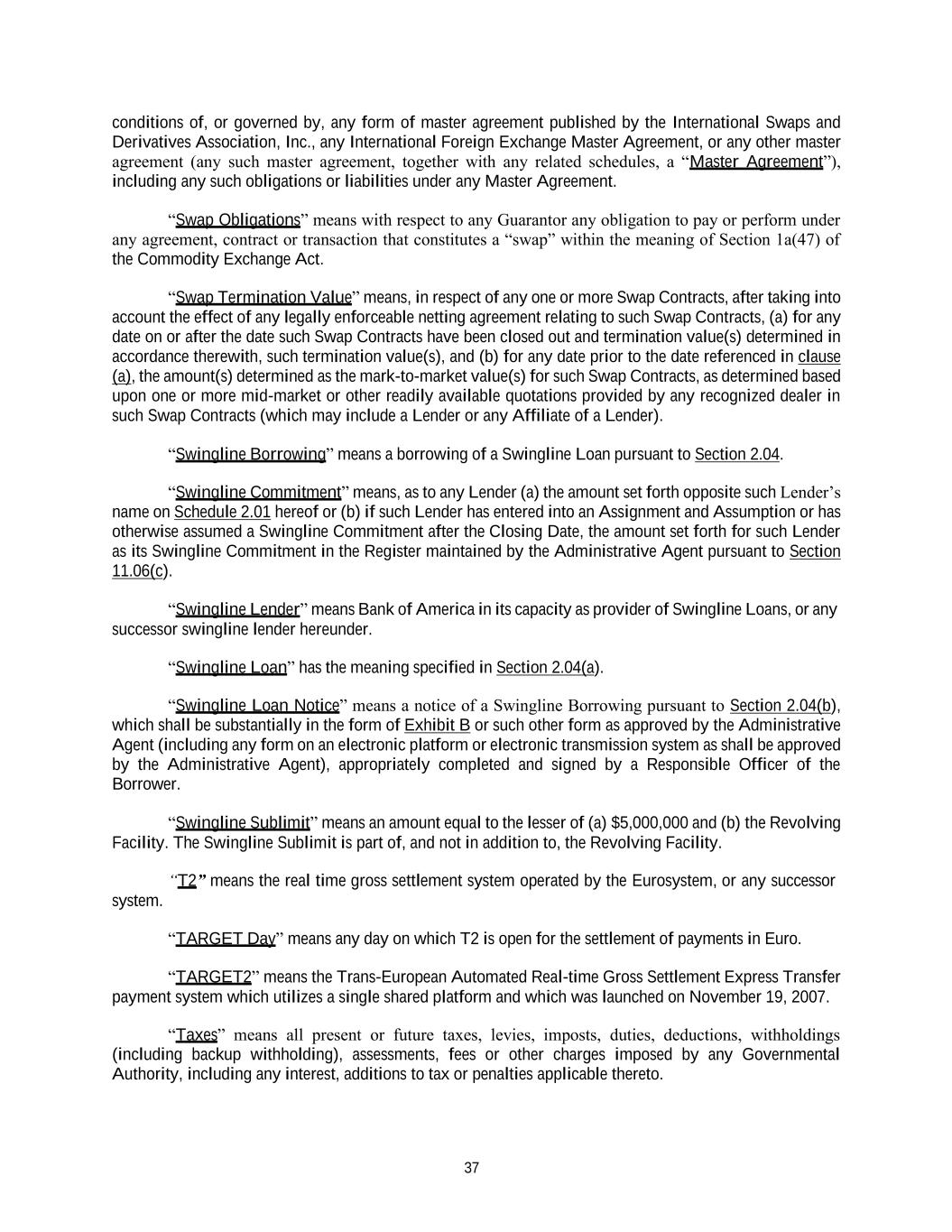37 conditions of, or governed by, any form of master agreement published by the International Swaps and Derivatives Association, Inc., any International Foreign Exchange Master Agreement, or any other master agreement (any such master agreement, together with any related schedules, a “Master Agreement”), including any such obligations or liabilities under any Master Agreement. “Swap Obligations” means with respect to any Guarantor any obligation to pay or perform under any agreement, contract or transaction that constitutes a “swap” within the meaning of Section 1a(47) of the Commodity Exchange Act. “Swap Termination Value” means, in respect of any one or more Swap Contracts, after taking into account the effect of any legally enforceable netting agreement relating to such Swap Contracts, (a) for any date on or after the date such Swap Contracts have been closed out and termination value(s) determined in accordance therewith, such termination value(s), and (b) for any date prior to the date referenced in clause (a), the amount(s) determined as the mark-to-market value(s) for such Swap Contracts, as determined based upon one or more mid-market or other readily available quotations provided by any recognized dealer in such Swap Contracts (which may include a Lender or any Affiliate of a Lender). “Swingline Borrowing” means a borrowing of a Swingline Loan pursuant to Section 2.04. “Swingline Commitment” means, as to any Lender (a) the amount set forth opposite such Lender’s name on Schedule 2.01 hereof or (b) if such Lender has entered into an Assignment and Assumption or has otherwise assumed a Swingline Commitment after the Closing Date, the amount set forth for such Lender as its Swingline Commitment in the Register maintained by the Administrative Agent pursuant to Section 11.06(c). “Swingline Lender” means Bank of America in its capacity as provider of Swingline Loans, or any successor swingline lender hereunder. “Swingline Loan” has the meaning specified in Section 2.04(a). “Swingline Loan Notice” means a notice of a Swingline Borrowing pursuant to Section 2.04(b), which shall be substantially in the form of Exhibit B or such other form as approved by the Administrative Agent (including any form on an electronic platform or electronic transmission system as shall be approved by the Administrative Agent), appropriately completed and signed by a Responsible Officer of the Borrower. “Swingline Sublimit” means an amount equal to the lesser of (a) $5,000,000 and (b) the Revolving Facility. The Swingline Sublimit is part of, and not in addition to, the Revolving Facility. “T2” means the real time gross settlement system operated by the Eurosystem, or any successor system. “TARGET Day” means any day on which T2 is open for the settlement of payments in Euro. “TARGET2” means the Trans-European Automated Real-time Gross Settlement Express Transfer payment system which utilizes a single shared platform and which was launched on November 19, 2007. “Taxes” means all present or future taxes, levies, imposts, duties, deductions, withholdings (including backup withholding), assessments, fees or other charges imposed by any Governmental Authority, including any interest, additions to tax or penalties applicable thereto.