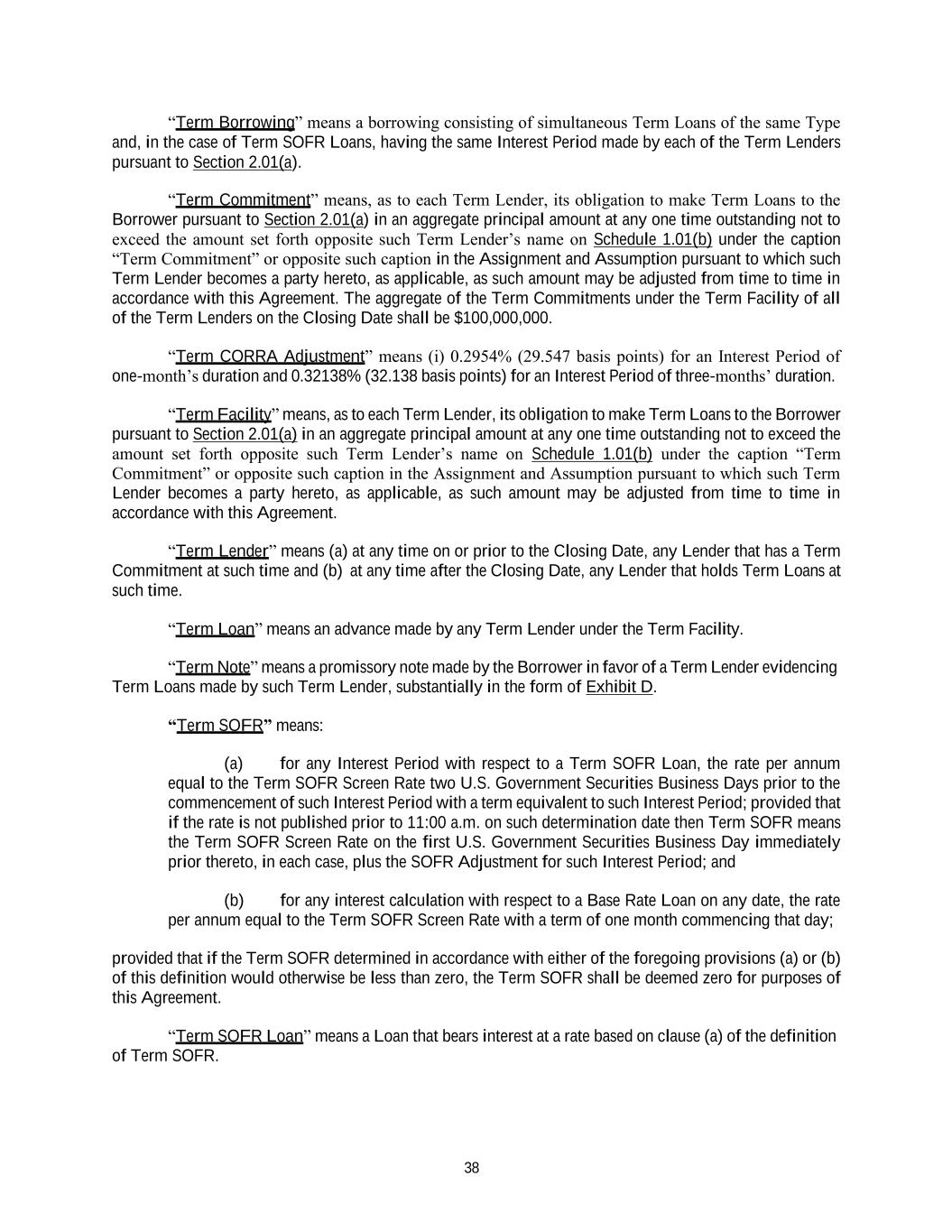 38 “Term Borrowing” means a borrowing consisting of simultaneous Term Loans of the same Type and, in the case of Term SOFR Loans, having the same Interest Period made by each of the Term Lenders pursuant to Section 2.01(a). “Term Commitment” means, as to each Term Lender, its obligation to make Term Loans to the Borrower pursuant to Section 2.01(a) in an aggregate principal amount at any one time outstanding not to exceed the amount set forth opposite such Term Lender’s name on Schedule 1.01(b) under the caption “Term Commitment” or opposite such caption in the Assignment and Assumption pursuant to which such Term Lender becomes a party hereto, as applicable, as such amount may be adjusted from time to time in accordance with this Agreement. The aggregate of the Term Commitments under the Term Facility of all of the Term Lenders on the Closing Date shall be $100,000,000. “Term CORRA Adjustment” means (i) 0.2954% (29.547 basis points) for an Interest Period of one-month’s duration and 0.32138% (32.138 basis points) for an Interest Period of three-months’ duration. “Term Facility” means, as to each Term Lender, its obligation to make Term Loans to the Borrower pursuant to Section 2.01(a) in an aggregate principal amount at any one time outstanding not to exceed the amount set forth opposite such Term Lender’s name on Schedule 1.01(b) under the caption “Term Commitment” or opposite such caption in the Assignment and Assumption pursuant to which such Term Lender becomes a party hereto, as applicable, as such amount may be adjusted from time to time in accordance with this Agreement. “Term Lender” means (a) at any time on or prior to the Closing Date, any Lender that has a Term Commitment at such time and (b) at any time after the Closing Date, any Lender that holds Term Loans at such time. “Term Loan” means an advance made by any Term Lender under the Term Facility. “Term Note” means a promissory note made by the Borrower in favor of a Term Lender evidencing Term Loans made by such Term Lender, substantially in the form of Exhibit D. “Term SOFR” means: (a) for any Interest Period with respect to a Term SOFR Loan, the rate per annum equal to the Term SOFR Screen Rate two U.S. Government Securities Business Days prior to the commencement of such Interest Period with a term equivalent to such Interest Period; provided that if the rate is not published prior to 11:00 a.m. on such determination date then Term SOFR means the Term SOFR Screen Rate on the first U.S. Government Securities Business Day immediately prior thereto, in each case, plus the SOFR Adjustment for such Interest Period; and (b) for any interest calculation with respect to a Base Rate Loan on any date, the rate per annum equal to the Term SOFR Screen Rate with a term of one month commencing that day; provided that if the Term SOFR determined in accordance with either of the foregoing provisions (a) or (b) of this definition would otherwise be less than zero, the Term SOFR shall be deemed zero for purposes of this Agreement. “Term SOFR Loan” means a Loan that bears interest at a rate based on clause (a) of the definition of Term SOFR.