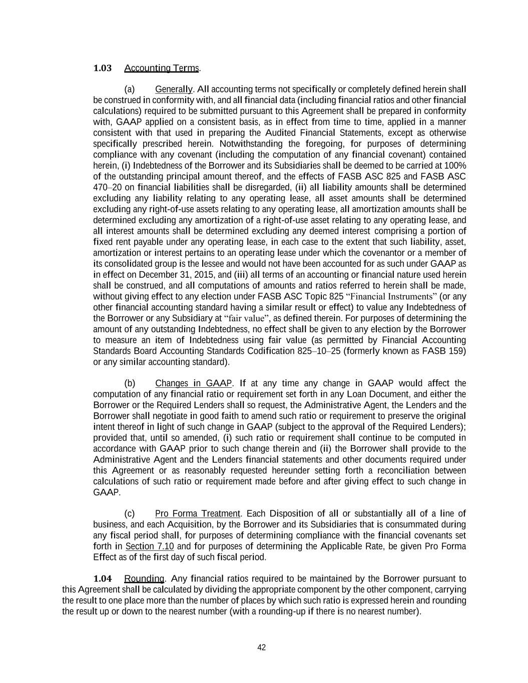 42 1.03 Accounting Terms. (a) Generally. All accounting terms not specifically or completely defined herein shall be construed in conformity with, and all financial data (including financial ratios and other financial calculations) required to be submitted pursuant to this Agreement shall be prepared in conformity with, GAAP applied on a consistent basis, as in effect from time to time, applied in a manner consistent with that used in preparing the Audited Financial Statements, except as otherwise specifically prescribed herein. Notwithstanding the foregoing, for purposes of determining compliance with any covenant (including the computation of any financial covenant) contained herein, (i) Indebtedness of the Borrower and its Subsidiaries shall be deemed to be carried at 100% of the outstanding principal amount thereof, and the effects of FASB ASC 825 and FASB ASC 470–20 on financial liabilities shall be disregarded, (ii) all liability amounts shall be determined excluding any liability relating to any operating lease, all asset amounts shall be determined excluding any right-of-use assets relating to any operating lease, all amortization amounts shall be determined excluding any amortization of a right-of-use asset relating to any operating lease, and all interest amounts shall be determined excluding any deemed interest comprising a portion of fixed rent payable under any operating lease, in each case to the extent that such liability, asset, amortization or interest pertains to an operating lease under which the covenantor or a member of its consolidated group is the lessee and would not have been accounted for as such under GAAP as in effect on December 31, 2015, and (iii) all terms of an accounting or financial nature used herein shall be construed, and all computations of amounts and ratios referred to herein shall be made, without giving effect to any election under FASB ASC Topic 825 “Financial Instruments” (or any other financial accounting standard having a similar result or effect) to value any Indebtedness of the Borrower or any Subsidiary at “fair value”, as defined therein. For purposes of determining the amount of any outstanding Indebtedness, no effect shall be given to any election by the Borrower to measure an item of Indebtedness using fair value (as permitted by Financial Accounting Standards Board Accounting Standards Codification 825–10–25 (formerly known as FASB 159) or any similar accounting standard). (b) Changes in GAAP. If at any time any change in GAAP would affect the computation of any financial ratio or requirement set forth in any Loan Document, and either the Borrower or the Required Lenders shall so request, the Administrative Agent, the Lenders and the Borrower shall negotiate in good faith to amend such ratio or requirement to preserve the original intent thereof in light of such change in GAAP (subject to the approval of the Required Lenders); provided that, until so amended, (i) such ratio or requirement shall continue to be computed in accordance with GAAP prior to such change therein and (ii) the Borrower shall provide to the Administrative Agent and the Lenders financial statements and other documents required under this Agreement or as reasonably requested hereunder setting forth a reconciliation between calculations of such ratio or requirement made before and after giving effect to such change in GAAP. (c) Pro Forma Treatment. Each Disposition of all or substantially all of a line of business, and each Acquisition, by the Borrower and its Subsidiaries that is consummated during any fiscal period shall, for purposes of determining compliance with the financial covenants set forth in Section 7.10 and for purposes of determining the Applicable Rate, be given Pro Forma Effect as of the first day of such fiscal period. 1.04 Rounding. Any financial ratios required to be maintained by the Borrower pursuant to this Agreement shall be calculated by dividing the appropriate component by the other component, carrying the result to one place more than the number of places by which such ratio is expressed herein and rounding the result up or down to the nearest number (with a rounding-up if there is no nearest number).