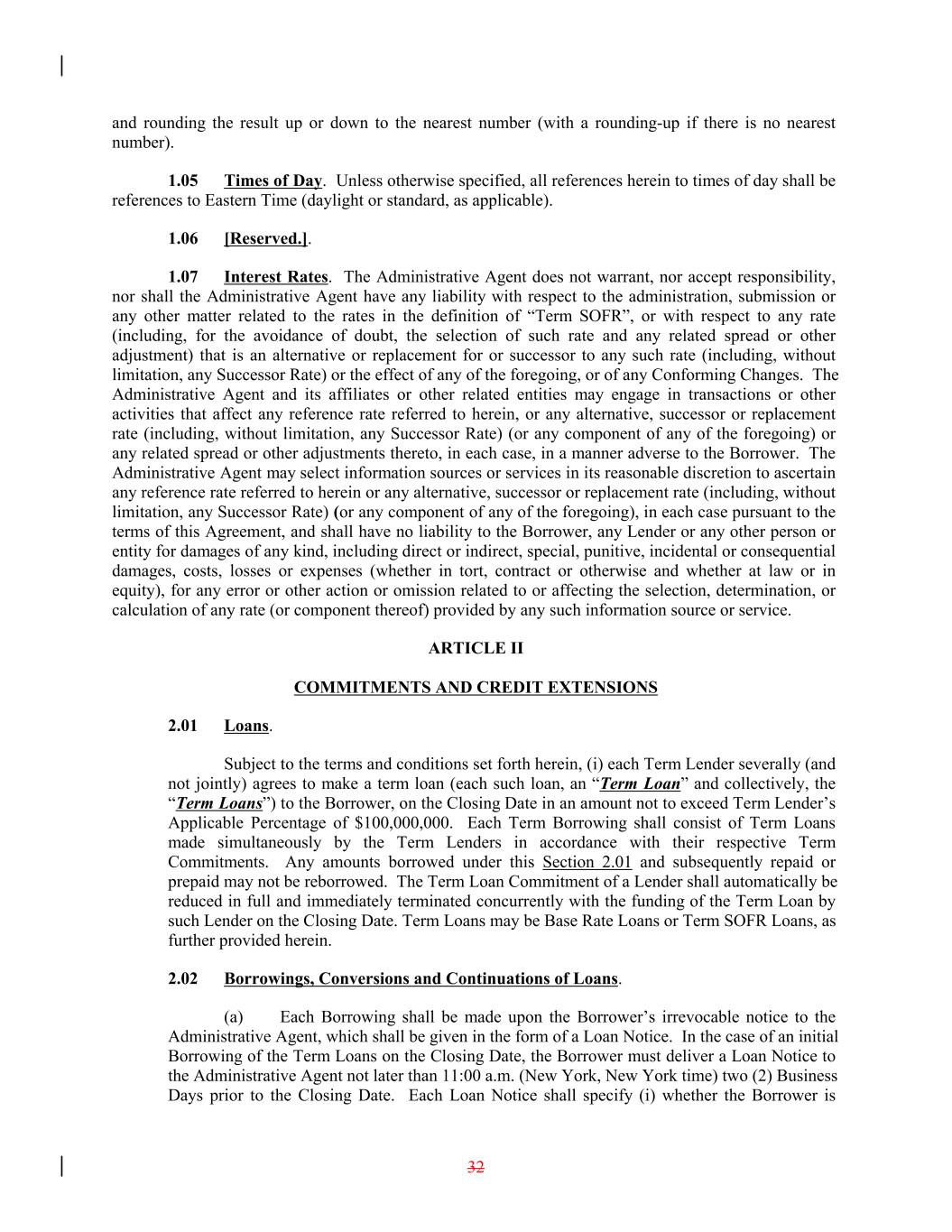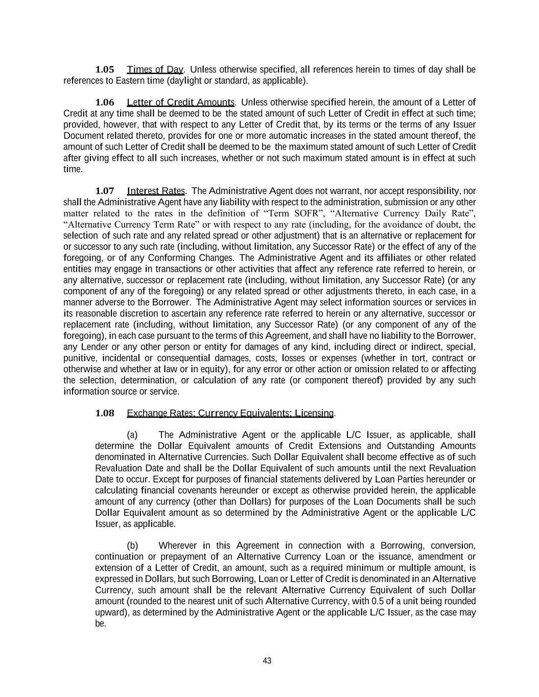 43 1.05 Times of Day. Unless otherwise specified, all references herein to times of day shall be references to Eastern time (daylight or standard, as applicable). 1.06 Letter of Credit Amounts. Unless otherwise specified herein, the amount of a Letter of Credit at any time shall be deemed to be the stated amount of such Letter of Credit in effect at such time; provided, however, that with respect to any Letter of Credit that, by its terms or the terms of any Issuer Document related thereto, provides for one or more automatic increases in the stated amount thereof, the amount of such Letter of Credit shall be deemed to be the maximum stated amount of such Letter of Credit after giving effect to all such increases, whether or not such maximum stated amount is in effect at such time. 1.07 Interest Rates. The Administrative Agent does not warrant, nor accept responsibility, nor shall the Administrative Agent have any liability with respect to the administration, submission or any other matter related to the rates in the definition of “Term SOFR”, “Alternative Currency Daily Rate”, “Alternative Currency Term Rate” or with respect to any rate (including, for the avoidance of doubt, the selection of such rate and any related spread or other adjustment) that is an alternative or replacement for or successor to any such rate (including, without limitation, any Successor Rate) or the effect of any of the foregoing, or of any Conforming Changes. The Administrative Agent and its affiliates or other related entities may engage in transactions or other activities that affect any reference rate referred to herein, or any alternative, successor or replacement rate (including, without limitation, any Successor Rate) (or any component of any of the foregoing) or any related spread or other adjustments thereto, in each case, in a manner adverse to the Borrower. The Administrative Agent may select information sources or services in its reasonable discretion to ascertain any reference rate referred to herein or any alternative, successor or replacement rate (including, without limitation, any Successor Rate) (or any component of any of the foregoing), in each case pursuant to the terms of this Agreement, and shall have no liability to the Borrower, any Lender or any other person or entity for damages of any kind, including direct or indirect, special, punitive, incidental or consequential damages, costs, losses or expenses (whether in tort, contract or otherwise and whether at law or in equity), for any error or other action or omission related to or affecting the selection, determination, or calculation of any rate (or component thereof) provided by any such information source or service. 1.08 Exchange Rates; Currency Equivalents; Licensing. (a) The Administrative Agent or the applicable L/C Issuer, as applicable, shall determine the Dollar Equivalent amounts of Credit Extensions and Outstanding Amounts denominated in Alternative Currencies. Such Dollar Equivalent shall become effective as of such Revaluation Date and shall be the Dollar Equivalent of such amounts until the next Revaluation Date to occur. Except for purposes of financial statements delivered by Loan Parties hereunder or calculating financial covenants hereunder or except as otherwise provided herein, the applicable amount of any currency (other than Dollars) for purposes of the Loan Documents shall be such Dollar Equivalent amount as so determined by the Administrative Agent or the applicable L/C Issuer, as applicable. (b) Wherever in this Agreement in connection with a Borrowing, conversion, continuation or prepayment of an Alternative Currency Loan or the issuance, amendment or extension of a Letter of Credit, an amount, such as a required minimum or multiple amount, is expressed in Dollars, but such Borrowing, Loan or Letter of Credit is denominated in an Alternative Currency, such amount shall be the relevant Alternative Currency Equivalent of such Dollar amount (rounded to the nearest unit of such Alternative Currency, with 0.5 of a unit being rounded upward), as determined by the Administrative Agent or the applicable L/C Issuer, as the case may be.