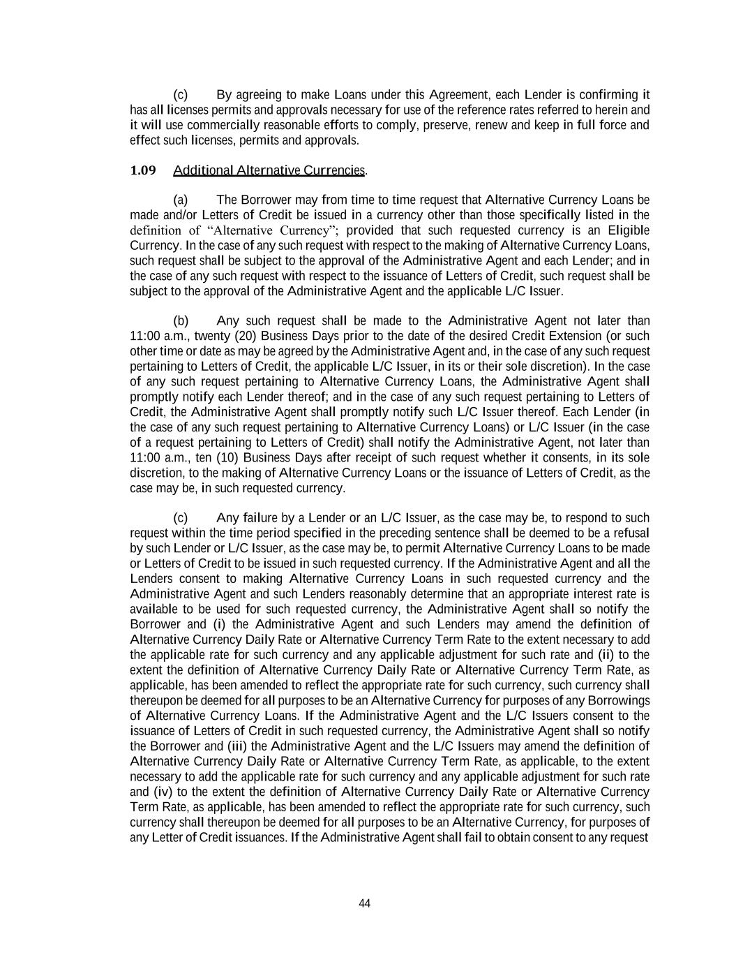 44 (c) By agreeing to make Loans under this Agreement, each Lender is confirming it has all licenses permits and approvals necessary for use of the reference rates referred to herein and it will use commercially reasonable efforts to comply, preserve, renew and keep in full force and effect such licenses, permits and approvals. 1.09 Additional Alternative Currencies. (a) The Borrower may from time to time request that Alternative Currency Loans be made and/or Letters of Credit be issued in a currency other than those specifically listed in the definition of “Alternative Currency”; provided that such requested currency is an Eligible Currency. In the case of any such request with respect to the making of Alternative Currency Loans, such request shall be subject to the approval of the Administrative Agent and each Lender; and in the case of any such request with respect to the issuance of Letters of Credit, such request shall be subject to the approval of the Administrative Agent and the applicable L/C Issuer. (b) Any such request shall be made to the Administrative Agent not later than 11:00 a.m., twenty (20) Business Days prior to the date of the desired Credit Extension (or such other time or date as may be agreed by the Administrative Agent and, in the case of any such request pertaining to Letters of Credit, the applicable L/C Issuer, in its or their sole discretion). In the case of any such request pertaining to Alternative Currency Loans, the Administrative Agent shall promptly notify each Lender thereof; and in the case of any such request pertaining to Letters of Credit, the Administrative Agent shall promptly notify such L/C Issuer thereof. Each Lender (in the case of any such request pertaining to Alternative Currency Loans) or L/C Issuer (in the case of a request pertaining to Letters of Credit) shall notify the Administrative Agent, not later than 11:00 a.m., ten (10) Business Days after receipt of such request whether it consents, in its sole discretion, to the making of Alternative Currency Loans or the issuance of Letters of Credit, as the case may be, in such requested currency. (c) Any failure by a Lender or an L/C Issuer, as the case may be, to respond to such request within the time period specified in the preceding sentence shall be deemed to be a refusal by such Lender or L/C Issuer, as the case may be, to permit Alternative Currency Loans to be made or Letters of Credit to be issued in such requested currency. If the Administrative Agent and all the Lenders consent to making Alternative Currency Loans in such requested currency and the Administrative Agent and such Lenders reasonably determine that an appropriate interest rate is available to be used for such requested currency, the Administrative Agent shall so notify the Borrower and (i) the Administrative Agent and such Lenders may amend the definition of Alternative Currency Daily Rate or Alternative Currency Term Rate to the extent necessary to add the applicable rate for such currency and any applicable adjustment for such rate and (ii) to the extent the definition of Alternative Currency Daily Rate or Alternative Currency Term Rate, as applicable, has been amended to reflect the appropriate rate for such currency, such currency shall thereupon be deemed for all purposes to be an Alternative Currency for purposes of any Borrowings of Alternative Currency Loans. If the Administrative Agent and the L/C Issuers consent to the issuance of Letters of Credit in such requested currency, the Administrative Agent shall so notify the Borrower and (iii) the Administrative Agent and the L/C Issuers may amend the definition of Alternative Currency Daily Rate or Alternative Currency Term Rate, as applicable, to the extent necessary to add the applicable rate for such currency and any applicable adjustment for such rate and (iv) to the extent the definition of Alternative Currency Daily Rate or Alternative Currency Term Rate, as applicable, has been amended to reflect the appropriate rate for such currency, such currency shall thereupon be deemed for all purposes to be an Alternative Currency, for purposes of any Letter of Credit issuances. If the Administrative Agent shall fail to obtain consent to any request