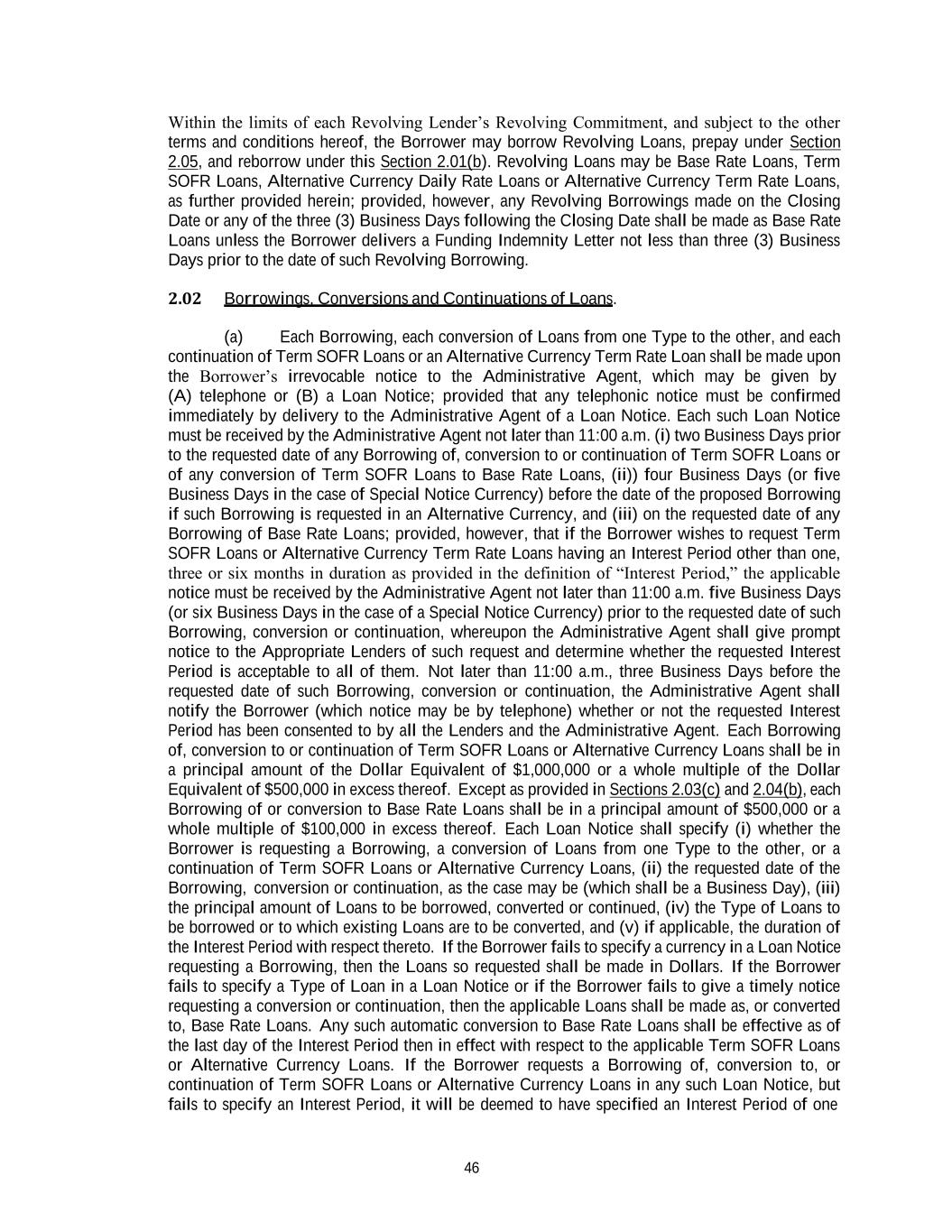 46 Within the limits of each Revolving Lender’s Revolving Commitment, and subject to the other terms and conditions hereof, the Borrower may borrow Revolving Loans, prepay under Section 2.05, and reborrow under this Section 2.01(b). Revolving Loans may be Base Rate Loans, Term SOFR Loans, Alternative Currency Daily Rate Loans or Alternative Currency Term Rate Loans, as further provided herein; provided, however, any Revolving Borrowings made on the Closing Date or any of the three (3) Business Days following the Closing Date shall be made as Base Rate Loans unless the Borrower delivers a Funding Indemnity Letter not less than three (3) Business Days prior to the date of such Revolving Borrowing. 2.02 Borrowings, Conversions and Continuations of Loans. (a) Each Borrowing, each conversion of Loans from one Type to the other, and each continuation of Term SOFR Loans or an Alternative Currency Term Rate Loan shall be made upon the Borrower’s irrevocable notice to the Administrative Agent, which may be given by (A) telephone or (B) a Loan Notice; provided that any telephonic notice must be confirmed immediately by delivery to the Administrative Agent of a Loan Notice. Each such Loan Notice must be received by the Administrative Agent not later than 11:00 a.m. (i) two Business Days prior to the requested date of any Borrowing of, conversion to or continuation of Term SOFR Loans or of any conversion of Term SOFR Loans to Base Rate Loans, (ii)) four Business Days (or five Business Days in the case of Special Notice Currency) before the date of the proposed Borrowing if such Borrowing is requested in an Alternative Currency, and (iii) on the requested date of any Borrowing of Base Rate Loans; provided, however, that if the Borrower wishes to request Term SOFR Loans or Alternative Currency Term Rate Loans having an Interest Period other than one, three or six months in duration as provided in the definition of “Interest Period,” the applicable notice must be received by the Administrative Agent not later than 11:00 a.m. five Business Days (or six Business Days in the case of a Special Notice Currency) prior to the requested date of such Borrowing, conversion or continuation, whereupon the Administrative Agent shall give prompt notice to the Appropriate Lenders of such request and determine whether the requested Interest Period is acceptable to all of them. Not later than 11:00 a.m., three Business Days before the requested date of such Borrowing, conversion or continuation, the Administrative Agent shall notify the Borrower (which notice may be by telephone) whether or not the requested Interest Period has been consented to by all the Lenders and the Administrative Agent. Each Borrowing of, conversion to or continuation of Term SOFR Loans or Alternative Currency Loans shall be in a principal amount of the Dollar Equivalent of $1,000,000 or a whole multiple of the Dollar Equivalent of $500,000 in excess thereof. Except as provided in Sections 2.03(c) and 2.04(b), each Borrowing of or conversion to Base Rate Loans shall be in a principal amount of $500,000 or a whole multiple of $100,000 in excess thereof. Each Loan Notice shall specify (i) whether the Borrower is requesting a Borrowing, a conversion of Loans from one Type to the other, or a continuation of Term SOFR Loans or Alternative Currency Loans, (ii) the requested date of the Borrowing, conversion or continuation, as the case may be (which shall be a Business Day), (iii) the principal amount of Loans to be borrowed, converted or continued, (iv) the Type of Loans to be borrowed or to which existing Loans are to be converted, and (v) if applicable, the duration of the Interest Period with respect thereto. If the Borrower fails to specify a currency in a Loan Notice requesting a Borrowing, then the Loans so requested shall be made in Dollars. If the Borrower fails to specify a Type of Loan in a Loan Notice or if the Borrower fails to give a timely notice requesting a conversion or continuation, then the applicable Loans shall be made as, or converted to, Base Rate Loans. Any such automatic conversion to Base Rate Loans shall be effective as of the last day of the Interest Period then in effect with respect to the applicable Term SOFR Loans or Alternative Currency Loans. If the Borrower requests a Borrowing of, conversion to, or continuation of Term SOFR Loans or Alternative Currency Loans in any such Loan Notice, but fails to specify an Interest Period, it will be deemed to have specified an Interest Period of one