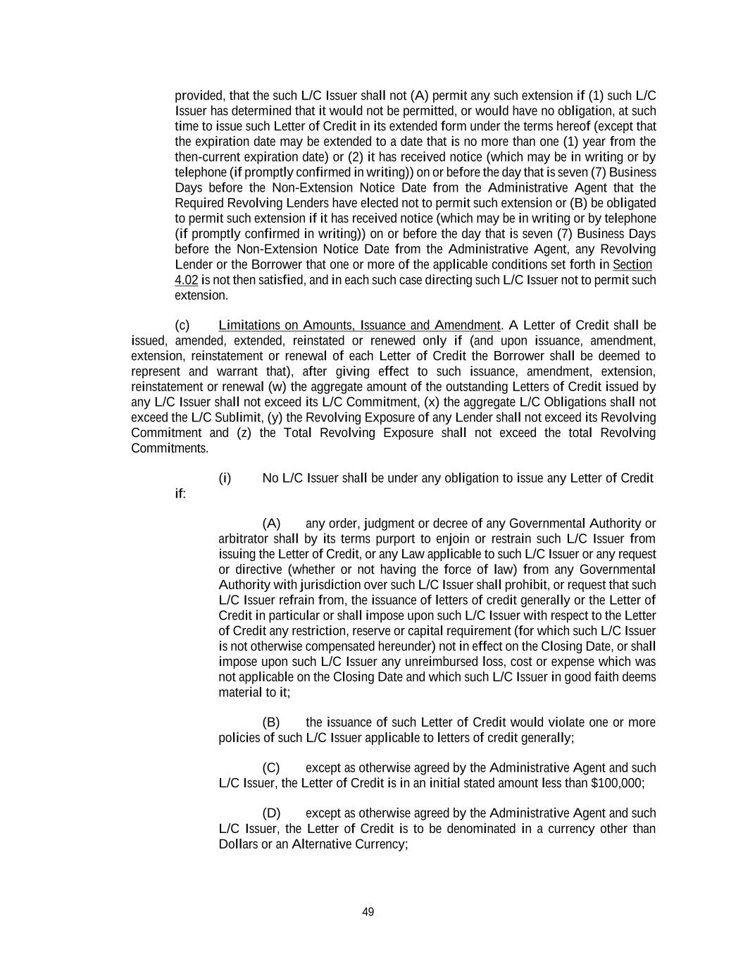 49 provided, that the such L/C Issuer shall not (A) permit any such extension if (1) such L/C Issuer has determined that it would not be permitted, or would have no obligation, at such time to issue such Letter of Credit in its extended form under the terms hereof (except that the expiration date may be extended to a date that is no more than one (1) year from the then-current expiration date) or (2) it has received notice (which may be in writing or by telephone (if promptly confirmed in writing)) on or before the day that is seven (7) Business Days before the Non-Extension Notice Date from the Administrative Agent that the Required Revolving Lenders have elected not to permit such extension or (B) be obligated to permit such extension if it has received notice (which may be in writing or by telephone (if promptly confirmed in writing)) on or before the day that is seven (7) Business Days before the Non-Extension Notice Date from the Administrative Agent, any Revolving Lender or the Borrower that one or more of the applicable conditions set forth in Section 4.02 is not then satisfied, and in each such case directing such L/C Issuer not to permit such extension. (c) Limitations on Amounts, Issuance and Amendment. A Letter of Credit shall be issued, amended, extended, reinstated or renewed only if (and upon issuance, amendment, extension, reinstatement or renewal of each Letter of Credit the Borrower shall be deemed to represent and warrant that), after giving effect to such issuance, amendment, extension, reinstatement or renewal (w) the aggregate amount of the outstanding Letters of Credit issued by any L/C Issuer shall not exceed its L/C Commitment, (x) the aggregate L/C Obligations shall not exceed the L/C Sublimit, (y) the Revolving Exposure of any Lender shall not exceed its Revolving Commitment and (z) the Total Revolving Exposure shall not exceed the total Revolving Commitments. (i) No L/C Issuer shall be under any obligation to issue any Letter of Credit if: (A) any order, judgment or decree of any Governmental Authority or arbitrator shall by its terms purport to enjoin or restrain such L/C Issuer from issuing the Letter of Credit, or any Law applicable to such L/C Issuer or any request or directive (whether or not having the force of law) from any Governmental Authority with jurisdiction over such L/C Issuer shall prohibit, or request that such L/C Issuer refrain from, the issuance of letters of credit generally or the Letter of Credit in particular or shall impose upon such L/C Issuer with respect to the Letter of Credit any restriction, reserve or capital requirement (for which such L/C Issuer is not otherwise compensated hereunder) not in effect on the Closing Date, or shall impose upon such L/C Issuer any unreimbursed loss, cost or expense which was not applicable on the Closing Date and which such L/C Issuer in good faith deems material to it; (B) the issuance of such Letter of Credit would violate one or more policies of such L/C Issuer applicable to letters of credit generally; (C) except as otherwise agreed by the Administrative Agent and such L/C Issuer, the Letter of Credit is in an initial stated amount less than $100,000; (D) except as otherwise agreed by the Administrative Agent and such L/C Issuer, the Letter of Credit is to be denominated in a currency other than Dollars or an Alternative Currency;
