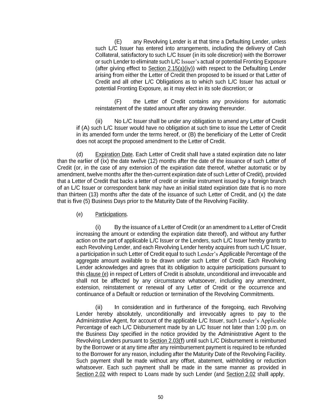 50 (E) any Revolving Lender is at that time a Defaulting Lender, unless such L/C Issuer has entered into arrangements, including the delivery of Cash Collateral, satisfactory to such L/C Issuer (in its sole discretion) with the Borrower or such Lender to eliminate such L/C Issuer’s actual or potential Fronting Exposure (after giving effect to Section 2.15(a)(iv)) with respect to the Defaulting Lender arising from either the Letter of Credit then proposed to be issued or that Letter of Credit and all other L/C Obligations as to which such L/C Issuer has actual or potential Fronting Exposure, as it may elect in its sole discretion; or (F) the Letter of Credit contains any provisions for automatic reinstatement of the stated amount after any drawing thereunder. (ii) No L/C Issuer shall be under any obligation to amend any Letter of Credit if (A) such L/C Issuer would have no obligation at such time to issue the Letter of Credit in its amended form under the terms hereof, or (B) the beneficiary of the Letter of Credit does not accept the proposed amendment to the Letter of Credit. (d) Expiration Date. Each Letter of Credit shall have a stated expiration date no later than the earlier of (ix) the date twelve (12) months after the date of the issuance of such Letter of Credit (or, in the case of any extension of the expiration date thereof, whether automatic or by amendment, twelve months after the then-current expiration date of such Letter of Credit), provided that a Letter of Credit that backs a letter of credit or similar instrument issued by a foreign branch of an L/C Issuer or correspondent bank may have an initial stated expiration date that is no more than thirteen (13) months after the date of the issuance of such Letter of Credit, and (x) the date that is five (5) Business Days prior to the Maturity Date of the Revolving Facility. (e) Participations. (i) By the issuance of a Letter of Credit (or an amendment to a Letter of Credit increasing the amount or extending the expiration date thereof), and without any further action on the part of applicable L/C Issuer or the Lenders, such L/C Issuer hereby grants to each Revolving Lender, and each Revolving Lender hereby acquires from such L/C Issuer, a participation in such Letter of Credit equal to such Lender’s Applicable Percentage of the aggregate amount available to be drawn under such Letter of Credit. Each Revolving Lender acknowledges and agrees that its obligation to acquire participations pursuant to this clause (e) in respect of Letters of Credit is absolute, unconditional and irrevocable and shall not be affected by any circumstance whatsoever, including any amendment, extension, reinstatement or renewal of any Letter of Credit or the occurrence and continuance of a Default or reduction or termination of the Revolving Commitments. (ii) In consideration and in furtherance of the foregoing, each Revolving Lender hereby absolutely, unconditionally and irrevocably agrees to pay to the Administrative Agent, for account of the applicable L/C Issuer, such Lender’s Applicable Percentage of each L/C Disbursement made by an L/C Issuer not later than 1:00 p.m. on the Business Day specified in the notice provided by the Administrative Agent to the Revolving Lenders pursuant to Section 2.03(f) until such L/C Disbursement is reimbursed by the Borrower or at any time after any reimbursement payment is required to be refunded to the Borrower for any reason, including after the Maturity Date of the Revolving Facility. Such payment shall be made without any offset, abatement, withholding or reduction whatsoever. Each such payment shall be made in the same manner as provided in Section 2.02 with respect to Loans made by such Lender (and Section 2.02 shall apply,