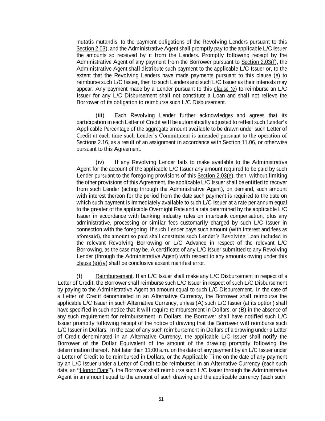 51 mutatis mutandis, to the payment obligations of the Revolving Lenders pursuant to this Section 2.03), and the Administrative Agent shall promptly pay to the applicable L/C Issuer the amounts so received by it from the Lenders. Promptly following receipt by the Administrative Agent of any payment from the Borrower pursuant to Section 2.03(f), the Administrative Agent shall distribute such payment to the applicable L/C Issuer or, to the extent that the Revolving Lenders have made payments pursuant to this clause (e) to reimburse such L/C Issuer, then to such Lenders and such L/C Issuer as their interests may appear. Any payment made by a Lender pursuant to this clause (e) to reimburse an L/C Issuer for any L/C Disbursement shall not constitute a Loan and shall not relieve the Borrower of its obligation to reimburse such L/C Disbursement. (iii) Each Revolving Lender further acknowledges and agrees that its participation in each Letter of Credit will be automatically adjusted to reflect such Lender’s Applicable Percentage of the aggregate amount available to be drawn under such Letter of Credit at each time such Lender’s Commitment is amended pursuant to the operation of Sections 2.16, as a result of an assignment in accordance with Section 11.06, or otherwise pursuant to this Agreement. (iv) If any Revolving Lender fails to make available to the Administrative Agent for the account of the applicable L/C Issuer any amount required to be paid by such Lender pursuant to the foregoing provisions of this Section 2.03(e), then, without limiting the other provisions of this Agreement, the applicable L/C Issuer shall be entitled to recover from such Lender (acting through the Administrative Agent), on demand, such amount with interest thereon for the period from the date such payment is required to the date on which such payment is immediately available to such L/C Issuer at a rate per annum equal to the greater of the applicable Overnight Rate and a rate determined by the applicable L/C Issuer in accordance with banking industry rules on interbank compensation, plus any administrative, processing or similar fees customarily charged by such L/C Issuer in connection with the foregoing. If such Lender pays such amount (with interest and fees as aforesaid), the amount so paid shall constitute such Lender’s Revolving Loan included in the relevant Revolving Borrowing or L/C Advance in respect of the relevant L/C Borrowing, as the case may be. A certificate of any L/C Issuer submitted to any Revolving Lender (through the Administrative Agent) with respect to any amounts owing under this clause (e)(iv) shall be conclusive absent manifest error. (f) Reimbursement. If an L/C Issuer shall make any L/C Disbursement in respect of a Letter of Credit, the Borrower shall reimburse such L/C Issuer in respect of such L/C Disbursement by paying to the Administrative Agent an amount equal to such L/C Disbursement. In the case of a Letter of Credit denominated in an Alternative Currency, the Borrower shall reimburse the applicable L/C Issuer in such Alternative Currency, unless (A) such L/C Issuer (at its option) shall have specified in such notice that it will require reimbursement in Dollars, or (B) in the absence of any such requirement for reimbursement in Dollars, the Borrower shall have notified such L/C Issuer promptly following receipt of the notice of drawing that the Borrower will reimburse such L/C Issuer in Dollars. In the case of any such reimbursement in Dollars of a drawing under a Letter of Credit denominated in an Alternative Currency, the applicable L/C Issuer shall notify the Borrower of the Dollar Equivalent of the amount of the drawing promptly following the determination thereof. Not later than 11:00 a.m. on the date of any payment by an L/C Issuer under a Letter of Credit to be reimbursed in Dollars, or the Applicable Time on the date of any payment by an L/C Issuer under a Letter of Credit to be reimbursed in an Alternative Currency (each such date, an “Honor Date”), the Borrower shall reimburse such L/C Issuer through the Administrative Agent in an amount equal to the amount of such drawing and the applicable currency (each such