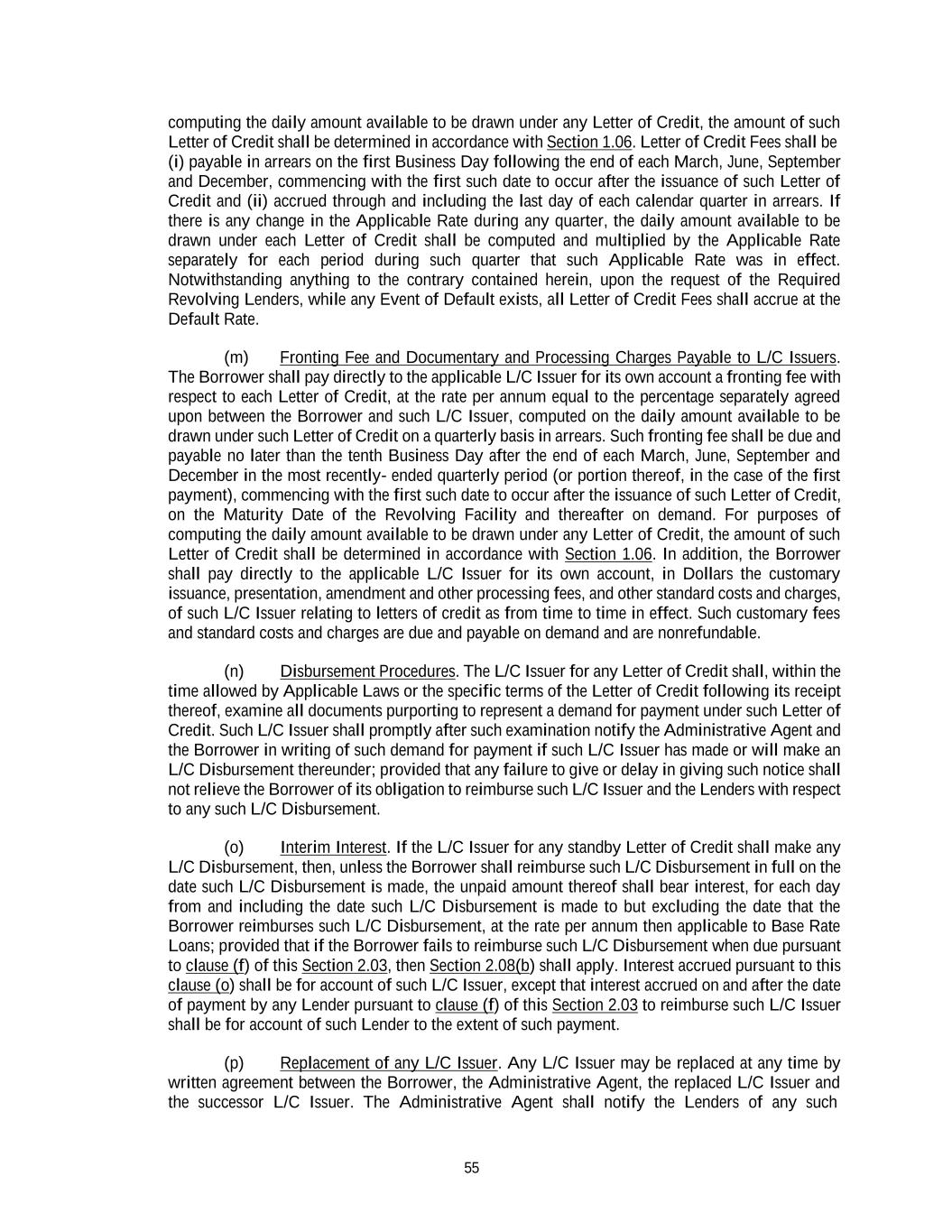 55 computing the daily amount available to be drawn under any Letter of Credit, the amount of such Letter of Credit shall be determined in accordance with Section 1.06. Letter of Credit Fees shall be (i) payable in arrears on the first Business Day following the end of each March, June, September and December, commencing with the first such date to occur after the issuance of such Letter of Credit and (ii) accrued through and including the last day of each calendar quarter in arrears. If there is any change in the Applicable Rate during any quarter, the daily amount available to be drawn under each Letter of Credit shall be computed and multiplied by the Applicable Rate separately for each period during such quarter that such Applicable Rate was in effect. Notwithstanding anything to the contrary contained herein, upon the request of the Required Revolving Lenders, while any Event of Default exists, all Letter of Credit Fees shall accrue at the Default Rate. (m) Fronting Fee and Documentary and Processing Charges Payable to L/C Issuers. The Borrower shall pay directly to the applicable L/C Issuer for its own account a fronting fee with respect to each Letter of Credit, at the rate per annum equal to the percentage separately agreed upon between the Borrower and such L/C Issuer, computed on the daily amount available to be drawn under such Letter of Credit on a quarterly basis in arrears. Such fronting fee shall be due and payable no later than the tenth Business Day after the end of each March, June, September and December in the most recently- ended quarterly period (or portion thereof, in the case of the first payment), commencing with the first such date to occur after the issuance of such Letter of Credit, on the Maturity Date of the Revolving Facility and thereafter on demand. For purposes of computing the daily amount available to be drawn under any Letter of Credit, the amount of such Letter of Credit shall be determined in accordance with Section 1.06. In addition, the Borrower shall pay directly to the applicable L/C Issuer for its own account, in Dollars the customary issuance, presentation, amendment and other processing fees, and other standard costs and charges, of such L/C Issuer relating to letters of credit as from time to time in effect. Such customary fees and standard costs and charges are due and payable on demand and are nonrefundable. (n) Disbursement Procedures. The L/C Issuer for any Letter of Credit shall, within the time allowed by Applicable Laws or the specific terms of the Letter of Credit following its receipt thereof, examine all documents purporting to represent a demand for payment under such Letter of Credit. Such L/C Issuer shall promptly after such examination notify the Administrative Agent and the Borrower in writing of such demand for payment if such L/C Issuer has made or will make an L/C Disbursement thereunder; provided that any failure to give or delay in giving such notice shall not relieve the Borrower of its obligation to reimburse such L/C Issuer and the Lenders with respect to any such L/C Disbursement. (o) Interim Interest. If the L/C Issuer for any standby Letter of Credit shall make any L/C Disbursement, then, unless the Borrower shall reimburse such L/C Disbursement in full on the date such L/C Disbursement is made, the unpaid amount thereof shall bear interest, for each day from and including the date such L/C Disbursement is made to but excluding the date that the Borrower reimburses such L/C Disbursement, at the rate per annum then applicable to Base Rate Loans; provided that if the Borrower fails to reimburse such L/C Disbursement when due pursuant to clause (f) of this Section 2.03, then Section 2.08(b) shall apply. Interest accrued pursuant to this clause (o) shall be for account of such L/C Issuer, except that interest accrued on and after the date of payment by any Lender pursuant to clause (f) of this Section 2.03 to reimburse such L/C Issuer shall be for account of such Lender to the extent of such payment. (p) Replacement of any L/C Issuer. Any L/C Issuer may be replaced at any time by written agreement between the Borrower, the Administrative Agent, the replaced L/C Issuer and the successor L/C Issuer. The Administrative Agent shall notify the Lenders of any such