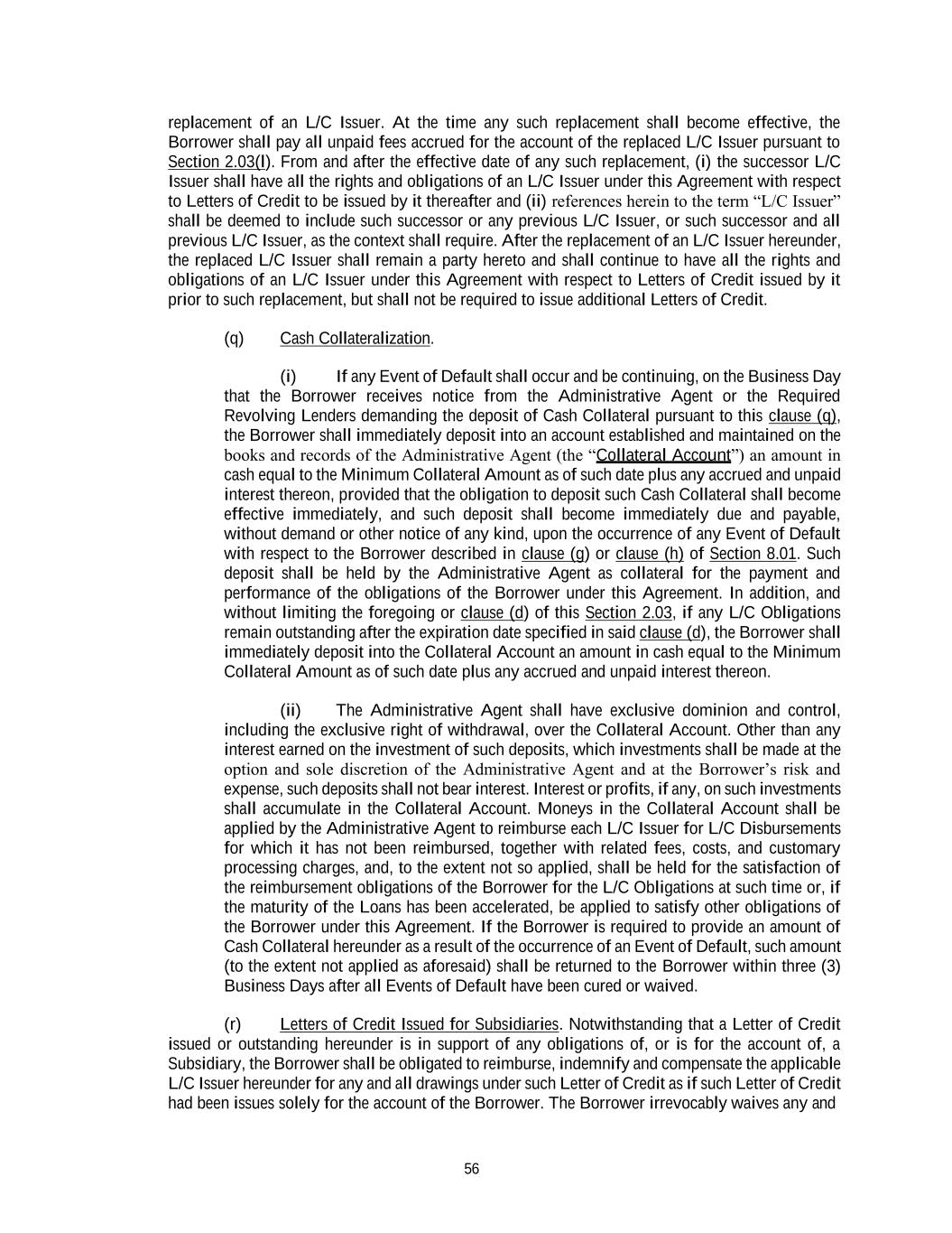 56 replacement of an L/C Issuer. At the time any such replacement shall become effective, the Borrower shall pay all unpaid fees accrued for the account of the replaced L/C Issuer pursuant to Section 2.03(l). From and after the effective date of any such replacement, (i) the successor L/C Issuer shall have all the rights and obligations of an L/C Issuer under this Agreement with respect to Letters of Credit to be issued by it thereafter and (ii) references herein to the term “L/C Issuer” shall be deemed to include such successor or any previous L/C Issuer, or such successor and all previous L/C Issuer, as the context shall require. After the replacement of an L/C Issuer hereunder, the replaced L/C Issuer shall remain a party hereto and shall continue to have all the rights and obligations of an L/C Issuer under this Agreement with respect to Letters of Credit issued by it prior to such replacement, but shall not be required to issue additional Letters of Credit. (q) Cash Collateralization. (i) If any Event of Default shall occur and be continuing, on the Business Day that the Borrower receives notice from the Administrative Agent or the Required Revolving Lenders demanding the deposit of Cash Collateral pursuant to this clause (q), the Borrower shall immediately deposit into an account established and maintained on the books and records of the Administrative Agent (the “Collateral Account”) an amount in cash equal to the Minimum Collateral Amount as of such date plus any accrued and unpaid interest thereon, provided that the obligation to deposit such Cash Collateral shall become effective immediately, and such deposit shall become immediately due and payable, without demand or other notice of any kind, upon the occurrence of any Event of Default with respect to the Borrower described in clause (g) or clause (h) of Section 8.01. Such deposit shall be held by the Administrative Agent as collateral for the payment and performance of the obligations of the Borrower under this Agreement. In addition, and without limiting the foregoing or clause (d) of this Section 2.03, if any L/C Obligations remain outstanding after the expiration date specified in said clause (d), the Borrower shall immediately deposit into the Collateral Account an amount in cash equal to the Minimum Collateral Amount as of such date plus any accrued and unpaid interest thereon. (ii) The Administrative Agent shall have exclusive dominion and control, including the exclusive right of withdrawal, over the Collateral Account. Other than any interest earned on the investment of such deposits, which investments shall be made at the option and sole discretion of the Administrative Agent and at the Borrower’s risk and expense, such deposits shall not bear interest. Interest or profits, if any, on such investments shall accumulate in the Collateral Account. Moneys in the Collateral Account shall be applied by the Administrative Agent to reimburse each L/C Issuer for L/C Disbursements for which it has not been reimbursed, together with related fees, costs, and customary processing charges, and, to the extent not so applied, shall be held for the satisfaction of the reimbursement obligations of the Borrower for the L/C Obligations at such time or, if the maturity of the Loans has been accelerated, be applied to satisfy other obligations of the Borrower under this Agreement. If the Borrower is required to provide an amount of Cash Collateral hereunder as a result of the occurrence of an Event of Default, such amount (to the extent not applied as aforesaid) shall be returned to the Borrower within three (3) Business Days after all Events of Default have been cured or waived. (r) Letters of Credit Issued for Subsidiaries. Notwithstanding that a Letter of Credit issued or outstanding hereunder is in support of any obligations of, or is for the account of, a Subsidiary, the Borrower shall be obligated to reimburse, indemnify and compensate the applicable L/C Issuer hereunder for any and all drawings under such Letter of Credit as if such Letter of Credit had been issues solely for the account of the Borrower. The Borrower irrevocably waives any and