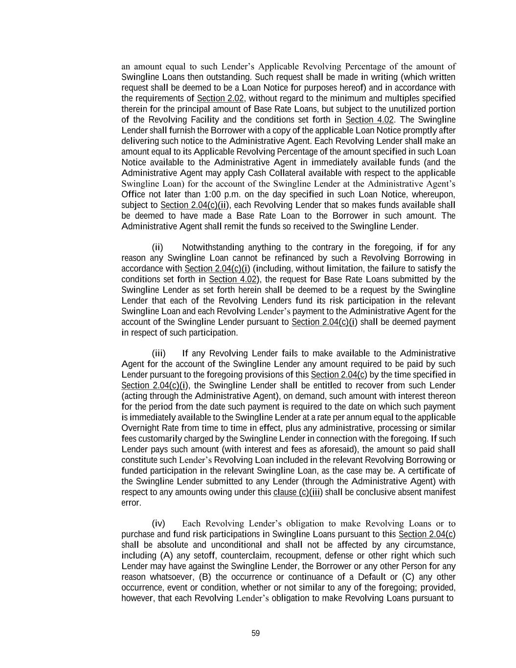 59 an amount equal to such Lender’s Applicable Revolving Percentage of the amount of Swingline Loans then outstanding. Such request shall be made in writing (which written request shall be deemed to be a Loan Notice for purposes hereof) and in accordance with the requirements of Section 2.02, without regard to the minimum and multiples specified therein for the principal amount of Base Rate Loans, but subject to the unutilized portion of the Revolving Facility and the conditions set forth in Section 4.02. The Swingline Lender shall furnish the Borrower with a copy of the applicable Loan Notice promptly after delivering such notice to the Administrative Agent. Each Revolving Lender shall make an amount equal to its Applicable Revolving Percentage of the amount specified in such Loan Notice available to the Administrative Agent in immediately available funds (and the Administrative Agent may apply Cash Collateral available with respect to the applicable Swingline Loan) for the account of the Swingline Lender at the Administrative Agent’s Office not later than 1:00 p.m. on the day specified in such Loan Notice, whereupon, subject to Section 2.04(c)(ii), each Revolving Lender that so makes funds available shall be deemed to have made a Base Rate Loan to the Borrower in such amount. The Administrative Agent shall remit the funds so received to the Swingline Lender. (ii) Notwithstanding anything to the contrary in the foregoing, if for any reason any Swingline Loan cannot be refinanced by such a Revolving Borrowing in accordance with Section 2.04(c)(i) (including, without limitation, the failure to satisfy the conditions set forth in Section 4.02), the request for Base Rate Loans submitted by the Swingline Lender as set forth herein shall be deemed to be a request by the Swingline Lender that each of the Revolving Lenders fund its risk participation in the relevant Swingline Loan and each Revolving Lender’s payment to the Administrative Agent for the account of the Swingline Lender pursuant to Section 2.04(c)(i) shall be deemed payment in respect of such participation. (iii) If any Revolving Lender fails to make available to the Administrative Agent for the account of the Swingline Lender any amount required to be paid by such Lender pursuant to the foregoing provisions of this Section 2.04(c) by the time specified in Section 2.04(c)(i), the Swingline Lender shall be entitled to recover from such Lender (acting through the Administrative Agent), on demand, such amount with interest thereon for the period from the date such payment is required to the date on which such payment is immediately available to the Swingline Lender at a rate per annum equal to the applicable Overnight Rate from time to time in effect, plus any administrative, processing or similar fees customarily charged by the Swingline Lender in connection with the foregoing. If such Lender pays such amount (with interest and fees as aforesaid), the amount so paid shall constitute such Lender’s Revolving Loan included in the relevant Revolving Borrowing or funded participation in the relevant Swingline Loan, as the case may be. A certificate of the Swingline Lender submitted to any Lender (through the Administrative Agent) with respect to any amounts owing under this clause (c)(iii) shall be conclusive absent manifest error. (iv) Each Revolving Lender’s obligation to make Revolving Loans or to purchase and fund risk participations in Swingline Loans pursuant to this Section 2.04(c) shall be absolute and unconditional and shall not be affected by any circumstance, including (A) any setoff, counterclaim, recoupment, defense or other right which such Lender may have against the Swingline Lender, the Borrower or any other Person for any reason whatsoever, (B) the occurrence or continuance of a Default or (C) any other occurrence, event or condition, whether or not similar to any of the foregoing; provided, however, that each Revolving Lender’s obligation to make Revolving Loans pursuant to
