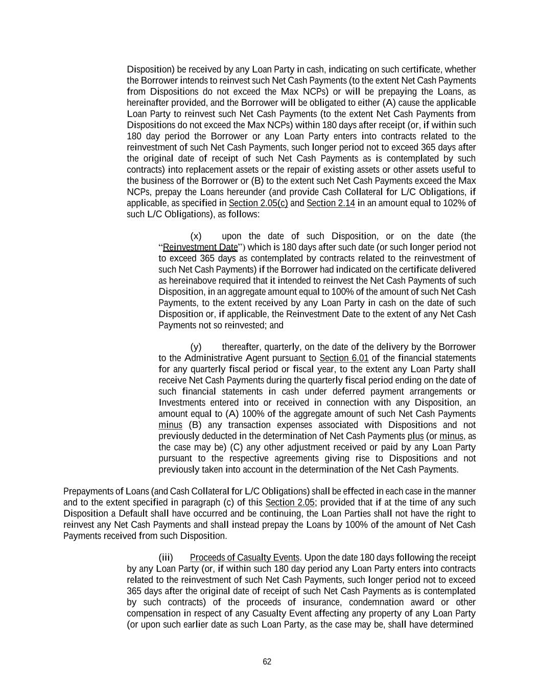 62 Disposition) be received by any Loan Party in cash, indicating on such certificate, whether the Borrower intends to reinvest such Net Cash Payments (to the extent Net Cash Payments from Dispositions do not exceed the Max NCPs) or will be prepaying the Loans, as hereinafter provided, and the Borrower will be obligated to either (A) cause the applicable Loan Party to reinvest such Net Cash Payments (to the extent Net Cash Payments from Dispositions do not exceed the Max NCPs) within 180 days after receipt (or, if within such 180 day period the Borrower or any Loan Party enters into contracts related to the reinvestment of such Net Cash Payments, such longer period not to exceed 365 days after the original date of receipt of such Net Cash Payments as is contemplated by such contracts) into replacement assets or the repair of existing assets or other assets useful to the business of the Borrower or (B) to the extent such Net Cash Payments exceed the Max NCPs, prepay the Loans hereunder (and provide Cash Collateral for L/C Obligations, if applicable, as specified in Section 2.05(c) and Section 2.14 in an amount equal to 102% of such L/C Obligations), as follows: (x) upon the date of such Disposition, or on the date (the “Reinvestment Date”) which is 180 days after such date (or such longer period not to exceed 365 days as contemplated by contracts related to the reinvestment of such Net Cash Payments) if the Borrower had indicated on the certificate delivered as hereinabove required that it intended to reinvest the Net Cash Payments of such Disposition, in an aggregate amount equal to 100% of the amount of such Net Cash Payments, to the extent received by any Loan Party in cash on the date of such Disposition or, if applicable, the Reinvestment Date to the extent of any Net Cash Payments not so reinvested; and (y) thereafter, quarterly, on the date of the delivery by the Borrower to the Administrative Agent pursuant to Section 6.01 of the financial statements for any quarterly fiscal period or fiscal year, to the extent any Loan Party shall receive Net Cash Payments during the quarterly fiscal period ending on the date of such financial statements in cash under deferred payment arrangements or Investments entered into or received in connection with any Disposition, an amount equal to (A) 100% of the aggregate amount of such Net Cash Payments minus (B) any transaction expenses associated with Dispositions and not previously deducted in the determination of Net Cash Payments plus (or minus, as the case may be) (C) any other adjustment received or paid by any Loan Party pursuant to the respective agreements giving rise to Dispositions and not previously taken into account in the determination of the Net Cash Payments. Prepayments of Loans (and Cash Collateral for L/C Obligations) shall be effected in each case in the manner and to the extent specified in paragraph (c) of this Section 2.05; provided that if at the time of any such Disposition a Default shall have occurred and be continuing, the Loan Parties shall not have the right to reinvest any Net Cash Payments and shall instead prepay the Loans by 100% of the amount of Net Cash Payments received from such Disposition. (iii) Proceeds of Casualty Events. Upon the date 180 days following the receipt by any Loan Party (or, if within such 180 day period any Loan Party enters into contracts related to the reinvestment of such Net Cash Payments, such longer period not to exceed 365 days after the original date of receipt of such Net Cash Payments as is contemplated by such contracts) of the proceeds of insurance, condemnation award or other compensation in respect of any Casualty Event affecting any property of any Loan Party (or upon such earlier date as such Loan Party, as the case may be, shall have determined