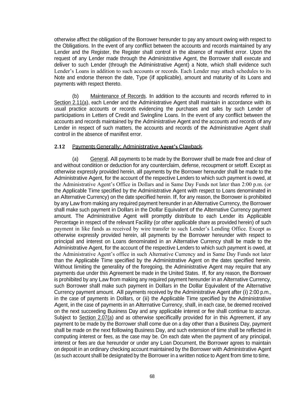 68 otherwise affect the obligation of the Borrower hereunder to pay any amount owing with respect to the Obligations. In the event of any conflict between the accounts and records maintained by any Lender and the Register, the Register shall control in the absence of manifest error. Upon the request of any Lender made through the Administrative Agent, the Borrower shall execute and deliver to such Lender (through the Administrative Agent) a Note, which shall evidence such Lender’s Loans in addition to such accounts or records. Each Lender may attach schedules to its Note and endorse thereon the date, Type (if applicable), amount and maturity of its Loans and payments with respect thereto. (b) Maintenance of Records. In addition to the accounts and records referred to in Section 2.11(a), each Lender and the Administrative Agent shall maintain in accordance with its usual practice accounts or records evidencing the purchases and sales by such Lender of participations in Letters of Credit and Swingline Loans. In the event of any conflict between the accounts and records maintained by the Administrative Agent and the accounts and records of any Lender in respect of such matters, the accounts and records of the Administrative Agent shall control in the absence of manifest error. 2.12 Payments Generally; Administrative Agent’s Clawback. (a) General. All payments to be made by the Borrower shall be made free and clear of and without condition or deduction for any counterclaim, defense, recoupment or setoff. Except as otherwise expressly provided herein, all payments by the Borrower hereunder shall be made to the Administrative Agent, for the account of the respective Lenders to which such payment is owed, at the Administrative Agent’s Office in Dollars and in Same Day Funds not later than 2:00 p.m. (or the Applicable Time specified by the Administrative Agent with respect to Loans denominated in an Alternative Currency) on the date specified herein. If, for any reason, the Borrower is prohibited by any Law from making any required payment hereunder in an Alternative Currency, the Borrower shall make such payment in Dollars in the Dollar Equivalent of the Alternative Currency payment amount. The Administrative Agent will promptly distribute to each Lender its Applicable Percentage in respect of the relevant Facility (or other applicable share as provided herein) of such payment in like funds as received by wire transfer to such Lender’s Lending Office. Except as otherwise expressly provided herein, all payments by the Borrower hereunder with respect to principal and interest on Loans denominated in an Alternative Currency shall be made to the Administrative Agent, for the account of the respective Lenders to which such payment is owed, at the Administrative Agent’s office in such Alternative Currency and in Same Day Funds not later than the Applicable Time specified by the Administrative Agent on the dates specified herein. Without limiting the generality of the foregoing, the Administrative Agent may require that any payments due under this Agreement be made in the United States. If, for any reason, the Borrower is prohibited by any Law from making any required payment hereunder in an Alternative Currency, such Borrower shall make such payment in Dollars in the Dollar Equivalent of the Alternative Currency payment amount. All payments received by the Administrative Agent after (i) 2:00 p.m., in the case of payments in Dollars, or (ii) the Applicable Time specified by the Administrative Agent, in the case of payments in an Alternative Currency, shall, in each case, be deemed received on the next succeeding Business Day and any applicable interest or fee shall continue to accrue. Subject to Section 2.07(a) and as otherwise specifically provided for in this Agreement, if any payment to be made by the Borrower shall come due on a day other than a Business Day, payment shall be made on the next following Business Day, and such extension of time shall be reflected in computing interest or fees, as the case may be. On each date when the payment of any principal, interest or fees are due hereunder or under any Loan Document, the Borrower agrees to maintain on deposit in an ordinary checking account maintained by the Borrower with Administrative Agent (as such account shall be designated by the Borrower in a written notice to Agent from time to time,