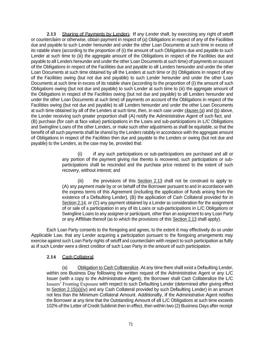 71 2.13 Sharing of Payments by Lenders. If any Lender shall, by exercising any right of setoff or counterclaim or otherwise, obtain payment in respect of (a) Obligations in respect of any of the Facilities due and payable to such Lender hereunder and under the other Loan Documents at such time in excess of its ratable share (according to the proportion of (i) the amount of such Obligations due and payable to such Lender at such time to (ii) the aggregate amount of the Obligations in respect of the Facilities due and payable to all Lenders hereunder and under the other Loan Documents at such time) of payments on account of the Obligations in respect of the Facilities due and payable to all Lenders hereunder and under the other Loan Documents at such time obtained by all the Lenders at such time or (b) Obligations in respect of any of the Facilities owing (but not due and payable) to such Lender hereunder and under the other Loan Documents at such time in excess of its ratable share (according to the proportion of (i) the amount of such Obligations owing (but not due and payable) to such Lender at such time to (ii) the aggregate amount of the Obligations in respect of the Facilities owing (but not due and payable) to all Lenders hereunder and under the other Loan Documents at such time) of payments on account of the Obligations in respect of the Facilities owing (but not due and payable) to all Lenders hereunder and under the other Loan Documents at such time obtained by all of the Lenders at such time, then, in each case under clauses (a) and (b) above, the Lender receiving such greater proportion shall (A) notify the Administrative Agent of such fact, and (B) purchase (for cash at face value) participations in the Loans and sub-participations in L/C Obligations and Swingline Loans of the other Lenders, or make such other adjustments as shall be equitable, so that the benefit of all such payments shall be shared by the Lenders ratably in accordance with the aggregate amount of Obligations in respect of the Facilities then due and payable to the Lenders or owing (but not due and payable) to the Lenders, as the case may be, provided that: (i) if any such participations or sub-participations are purchased and all or any portion of the payment giving rise thereto is recovered, such participations or sub- participations shall be rescinded and the purchase price restored to the extent of such recovery, without interest; and (ii) the provisions of this Section 2.13 shall not be construed to apply to (A) any payment made by or on behalf of the Borrower pursuant to and in accordance with the express terms of this Agreement (including the application of funds arising from the existence of a Defaulting Lender), (B) the application of Cash Collateral provided for in Section 2.14, or (C) any payment obtained by a Lender as consideration for the assignment of or sale of a participation in any of its Loans or sub-participations in L/C Obligations or Swingline Loans to any assignee or participant, other than an assignment to any Loan Party or any Affiliate thereof (as to which the provisions of this Section 2.13 shall apply). Each Loan Party consents to the foregoing and agrees, to the extent it may effectively do so under Applicable Law, that any Lender acquiring a participation pursuant to the foregoing arrangements may exercise against such Loan Party rights of setoff and counterclaim with respect to such participation as fully as if such Lender were a direct creditor of such Loan Party in the amount of such participation. 2.14 Cash Collateral. (a) Obligation to Cash Collateralize. At any time there shall exist a Defaulting Lender, within one Business Day following the written request of the Administrative Agent or any L/C Issuer (with a copy to the Administrative Agent), the Borrower shall Cash Collateralize the L/C Issuers’ Fronting Exposure with respect to such Defaulting Lender (determined after giving effect to Section 2.15(a)(iv) and any Cash Collateral provided by such Defaulting Lender) in an amount not less than the Minimum Collateral Amount. Additionally, if the Administrative Agent notifies the Borrower at any time that the Outstanding Amount of all L/C Obligations at such time exceeds 102% of the Letter of Credit Sublimit then in effect, then within two (2) Business Days after receipt