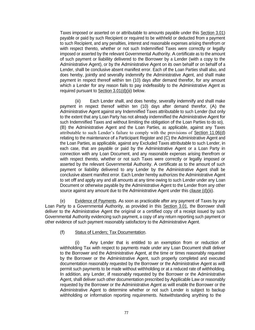 77 Taxes imposed or asserted on or attributable to amounts payable under this Section 3.01) payable or paid by such Recipient or required to be withheld or deducted from a payment to such Recipient, and any penalties, interest and reasonable expenses arising therefrom or with respect thereto, whether or not such Indemnified Taxes were correctly or legally imposed or asserted by the relevant Governmental Authority. A certificate as to the amount of such payment or liability delivered to the Borrower by a Lender (with a copy to the Administrative Agent), or by the Administrative Agent on its own behalf or on behalf of a Lender, shall be conclusive absent manifest error. Each of the Loan Parties shall also, and does hereby, jointly and severally indemnify the Administrative Agent, and shall make payment in respect thereof within ten (10) days after demand therefor, for any amount which a Lender for any reason fails to pay indefeasibly to the Administrative Agent as required pursuant to Section 3.01(d)(ii) below. (ii) Each Lender shall, and does hereby, severally indemnify and shall make payment in respect thereof within ten (10) days after demand therefor, (A) the Administrative Agent against any Indemnified Taxes attributable to such Lender (but only to the extent that any Loan Party has not already indemnified the Administrative Agent for such Indemnified Taxes and without limiting the obligation of the Loan Parties to do so), (B) the Administrative Agent and the Loan Parties, as applicable, against any Taxes attributable to such Lender’s failure to comply with the provisions of Section 11.06(d) relating to the maintenance of a Participant Register and (C) the Administrative Agent and the Loan Parties, as applicable, against any Excluded Taxes attributable to such Lender, in each case, that are payable or paid by the Administrative Agent or a Loan Party in connection with any Loan Document, and any reasonable expenses arising therefrom or with respect thereto, whether or not such Taxes were correctly or legally imposed or asserted by the relevant Governmental Authority. A certificate as to the amount of such payment or liability delivered to any Lender by the Administrative Agent shall be conclusive absent manifest error. Each Lender hereby authorizes the Administrative Agent to set off and apply any and all amounts at any time owing to such Lender under any Loan Document or otherwise payable by the Administrative Agent to the Lender from any other source against any amount due to the Administrative Agent under this clause (d)(ii). (e) Evidence of Payments. As soon as practicable after any payment of Taxes by any Loan Party to a Governmental Authority, as provided in this Section 3.01, the Borrower shall deliver to the Administrative Agent the original or a certified copy of a receipt issued by such Governmental Authority evidencing such payment, a copy of any return reporting such payment or other evidence of such payment reasonably satisfactory to the Administrative Agent. (f) Status of Lenders; Tax Documentation. (i) Any Lender that is entitled to an exemption from or reduction of withholding Tax with respect to payments made under any Loan Document shall deliver to the Borrower and the Administrative Agent, at the time or times reasonably requested by the Borrower or the Administrative Agent, such properly completed and executed documentation reasonably requested by the Borrower or the Administrative Agent as will permit such payments to be made without withholding or at a reduced rate of withholding. In addition, any Lender, if reasonably requested by the Borrower or the Administrative Agent, shall deliver such other documentation prescribed by Applicable Law or reasonably requested by the Borrower or the Administrative Agent as will enable the Borrower or the Administrative Agent to determine whether or not such Lender is subject to backup withholding or information reporting requirements. Notwithstanding anything to the