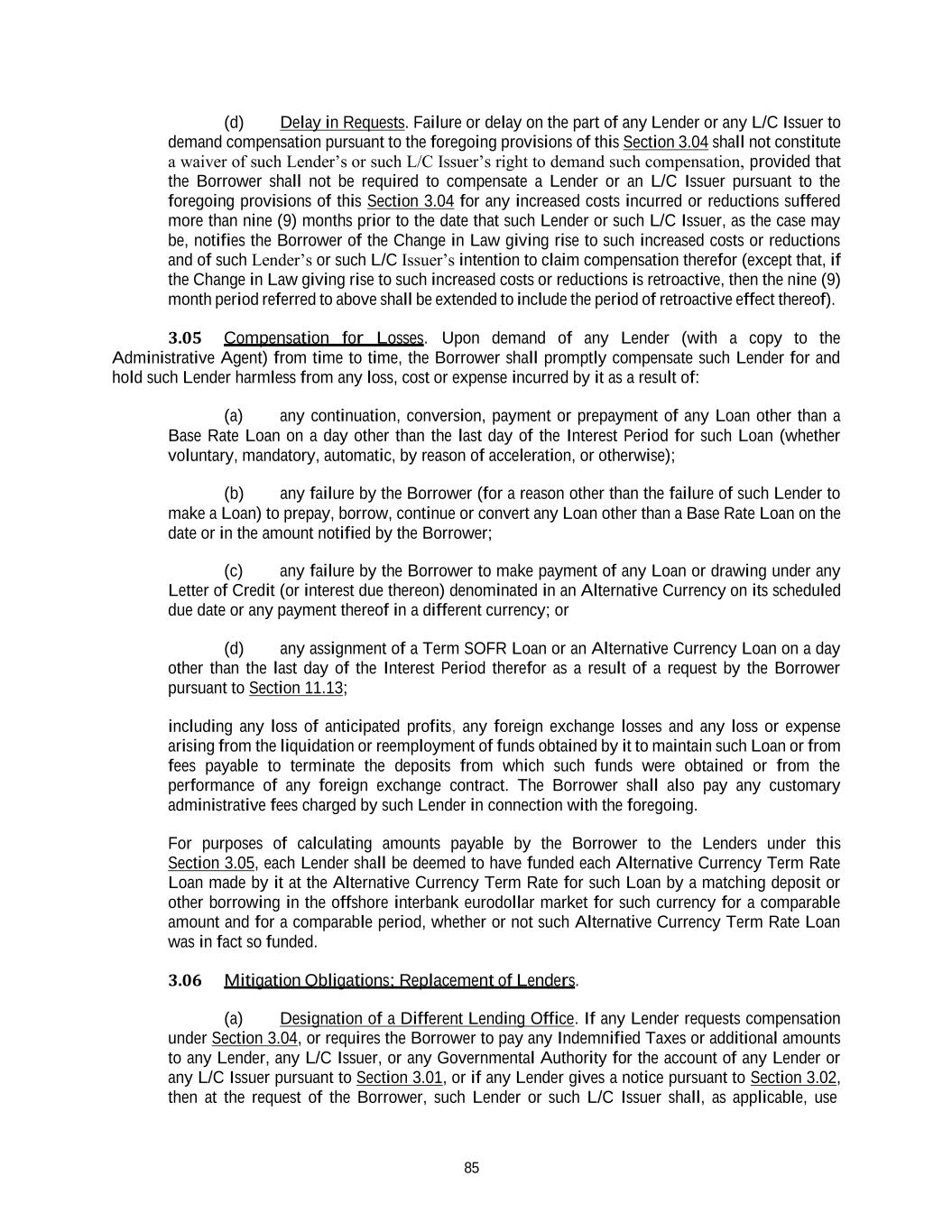 85 (d) Delay in Requests. Failure or delay on the part of any Lender or any L/C Issuer to demand compensation pursuant to the foregoing provisions of this Section 3.04 shall not constitute a waiver of such Lender’s or such L/C Issuer’s right to demand such compensation, provided that the Borrower shall not be required to compensate a Lender or an L/C Issuer pursuant to the foregoing provisions of this Section 3.04 for any increased costs incurred or reductions suffered more than nine (9) months prior to the date that such Lender or such L/C Issuer, as the case may be, notifies the Borrower of the Change in Law giving rise to such increased costs or reductions and of such Lender’s or such L/C Issuer’s intention to claim compensation therefor (except that, if the Change in Law giving rise to such increased costs or reductions is retroactive, then the nine (9) month period referred to above shall be extended to include the period of retroactive effect thereof). 3.05 Compensation for Losses. Upon demand of any Lender (with a copy to the Administrative Agent) from time to time, the Borrower shall promptly compensate such Lender for and hold such Lender harmless from any loss, cost or expense incurred by it as a result of: (a) any continuation, conversion, payment or prepayment of any Loan other than a Base Rate Loan on a day other than the last day of the Interest Period for such Loan (whether voluntary, mandatory, automatic, by reason of acceleration, or otherwise); (b) any failure by the Borrower (for a reason other than the failure of such Lender to make a Loan) to prepay, borrow, continue or convert any Loan other than a Base Rate Loan on the date or in the amount notified by the Borrower; (c) any failure by the Borrower to make payment of any Loan or drawing under any Letter of Credit (or interest due thereon) denominated in an Alternative Currency on its scheduled due date or any payment thereof in a different currency; or (d) any assignment of a Term SOFR Loan or an Alternative Currency Loan on a day other than the last day of the Interest Period therefor as a result of a request by the Borrower pursuant to Section 11.13; including any loss of anticipated profits, any foreign exchange losses and any loss or expense arising from the liquidation or reemployment of funds obtained by it to maintain such Loan or from fees payable to terminate the deposits from which such funds were obtained or from the performance of any foreign exchange contract. The Borrower shall also pay any customary administrative fees charged by such Lender in connection with the foregoing. For purposes of calculating amounts payable by the Borrower to the Lenders under this Section 3.05, each Lender shall be deemed to have funded each Alternative Currency Term Rate Loan made by it at the Alternative Currency Term Rate for such Loan by a matching deposit or other borrowing in the offshore interbank eurodollar market for such currency for a comparable amount and for a comparable period, whether or not such Alternative Currency Term Rate Loan was in fact so funded. 3.06 Mitigation Obligations; Replacement of Lenders. (a) Designation of a Different Lending Office. If any Lender requests compensation under Section 3.04, or requires the Borrower to pay any Indemnified Taxes or additional amounts to any Lender, any L/C Issuer, or any Governmental Authority for the account of any Lender or any L/C Issuer pursuant to Section 3.01, or if any Lender gives a notice pursuant to Section 3.02, then at the request of the Borrower, such Lender or such L/C Issuer shall, as applicable, use