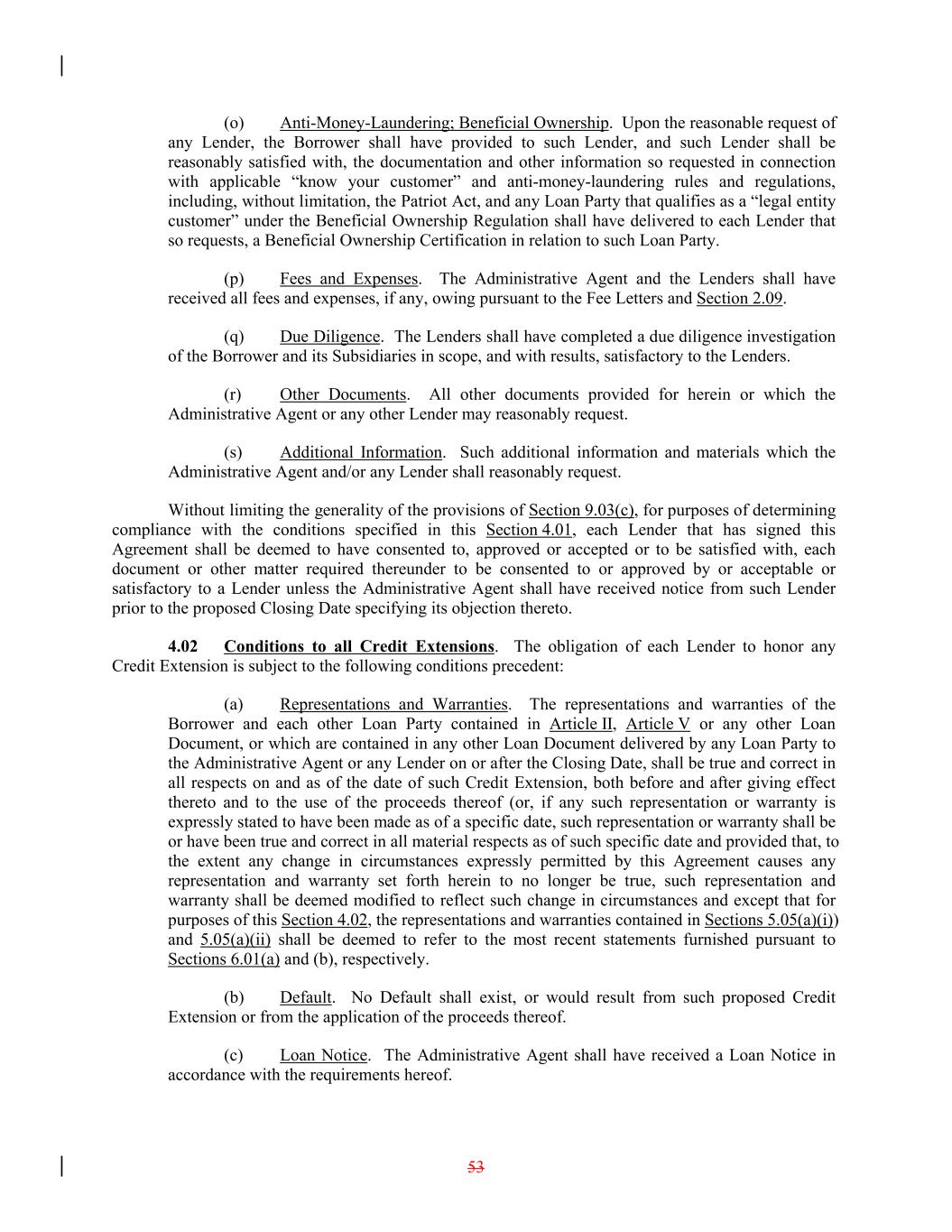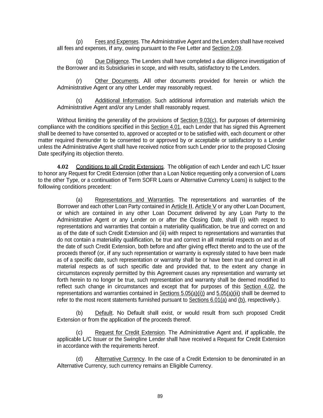 89 (p) Fees and Expenses. The Administrative Agent and the Lenders shall have received all fees and expenses, if any, owing pursuant to the Fee Letter and Section 2.09. (q) Due Diligence. The Lenders shall have completed a due diligence investigation of the Borrower and its Subsidiaries in scope, and with results, satisfactory to the Lenders. (r) Other Documents. All other documents provided for herein or which the Administrative Agent or any other Lender may reasonably request. (s) Additional Information. Such additional information and materials which the Administrative Agent and/or any Lender shall reasonably request. Without limiting the generality of the provisions of Section 9.03(c), for purposes of determining compliance with the conditions specified in this Section 4.01, each Lender that has signed this Agreement shall be deemed to have consented to, approved or accepted or to be satisfied with, each document or other matter required thereunder to be consented to or approved by or acceptable or satisfactory to a Lender unless the Administrative Agent shall have received notice from such Lender prior to the proposed Closing Date specifying its objection thereto. 4.02 Conditions to all Credit Extensions. The obligation of each Lender and each L/C Issuer to honor any Request for Credit Extension (other than a Loan Notice requesting only a conversion of Loans to the other Type, or a continuation of Term SOFR Loans or Alternative Currency Loans) is subject to the following conditions precedent: (a) Representations and Warranties. The representations and warranties of the Borrower and each other Loan Party contained in Article II, Article V or any other Loan Document, or which are contained in any other Loan Document delivered by any Loan Party to the Administrative Agent or any Lender on or after the Closing Date, shall (i) with respect to representations and warranties that contain a materiality qualification, be true and correct on and as of the date of such Credit Extension and (ii) with respect to representations and warranties that do not contain a materiality qualification, be true and correct in all material respects on and as of the date of such Credit Extension, both before and after giving effect thereto and to the use of the proceeds thereof (or, if any such representation or warranty is expressly stated to have been made as of a specific date, such representation or warranty shall be or have been true and correct in all material respects as of such specific date and provided that, to the extent any change in circumstances expressly permitted by this Agreement causes any representation and warranty set forth herein to no longer be true, such representation and warranty shall be deemed modified to reflect such change in circumstances and except that for purposes of this Section 4.02, the representations and warranties contained in Sections 5.05(a)(i)) and 5.05(a)(ii) shall be deemed to refer to the most recent statements furnished pursuant to Sections 6.01(a) and (b), respectively.). (b) Default. No Default shall exist, or would result from such proposed Credit Extension or from the application of the proceeds thereof. (c) Request for Credit Extension. The Administrative Agent and, if applicable, the applicable L/C Issuer or the Swingline Lender shall have received a Request for Credit Extension in accordance with the requirements hereof. (d) Alternative Currency. In the case of a Credit Extension to be denominated in an Alternative Currency, such currency remains an Eligible Currency.