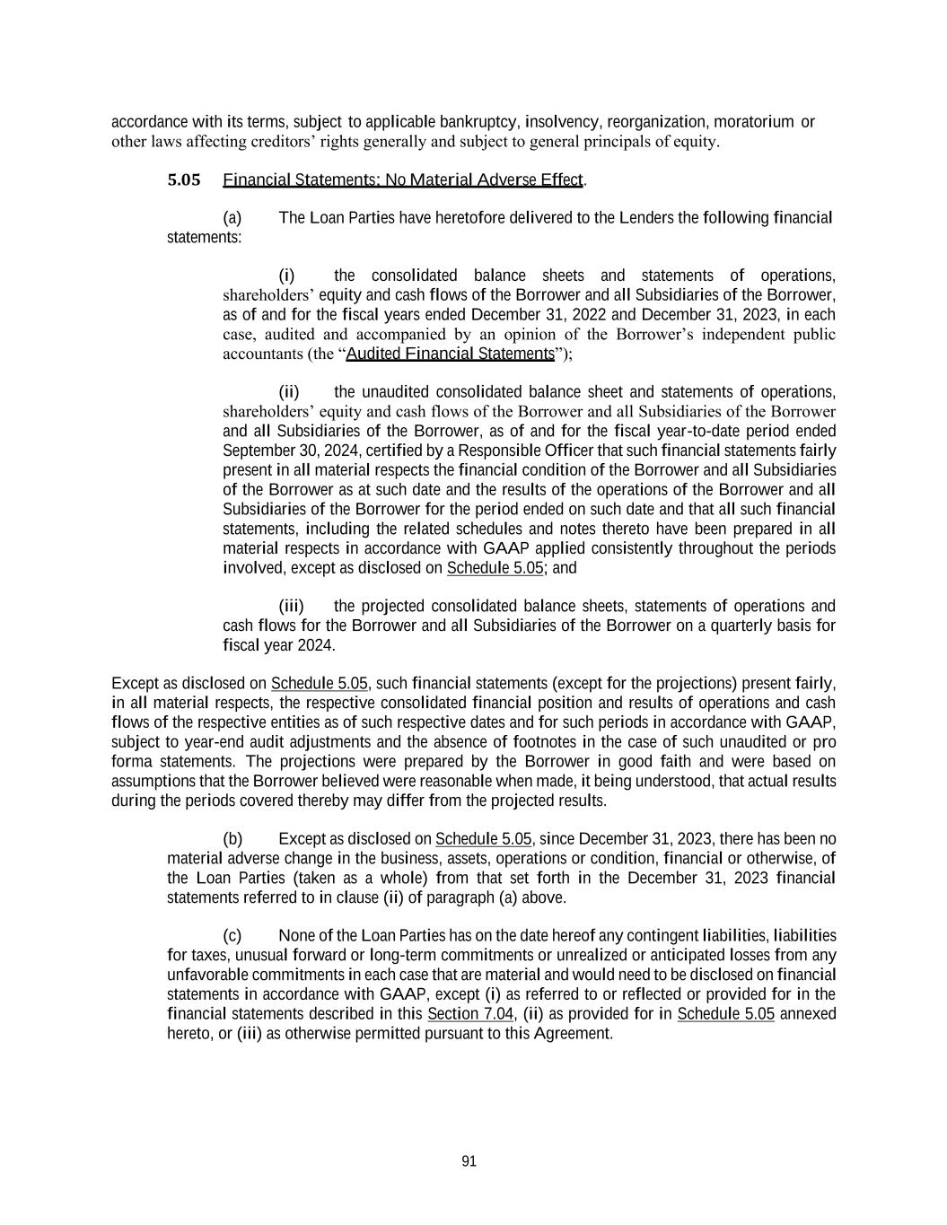 91 accordance with its terms, subject to applicable bankruptcy, insolvency, reorganization, moratorium or other laws affecting creditors’ rights generally and subject to general principals of equity. 5.05 Financial Statements; No Material Adverse Effect. (a) The Loan Parties have heretofore delivered to the Lenders the following financial statements: (i) the consolidated balance sheets and statements of operations, shareholders’ equity and cash flows of the Borrower and all Subsidiaries of the Borrower, as of and for the fiscal years ended December 31, 2022 and December 31, 2023, in each case, audited and accompanied by an opinion of the Borrower’s independent public accountants (the “Audited Financial Statements”); (ii) the unaudited consolidated balance sheet and statements of operations, shareholders’ equity and cash flows of the Borrower and all Subsidiaries of the Borrower and all Subsidiaries of the Borrower, as of and for the fiscal year-to-date period ended September 30, 2024, certified by a Responsible Officer that such financial statements fairly present in all material respects the financial condition of the Borrower and all Subsidiaries of the Borrower as at such date and the results of the operations of the Borrower and all Subsidiaries of the Borrower for the period ended on such date and that all such financial statements, including the related schedules and notes thereto have been prepared in all material respects in accordance with GAAP applied consistently throughout the periods involved, except as disclosed on Schedule 5.05; and (iii) the projected consolidated balance sheets, statements of operations and cash flows for the Borrower and all Subsidiaries of the Borrower on a quarterly basis for fiscal year 2024. Except as disclosed on Schedule 5.05, such financial statements (except for the projections) present fairly, in all material respects, the respective consolidated financial position and results of operations and cash flows of the respective entities as of such respective dates and for such periods in accordance with GAAP, subject to year-end audit adjustments and the absence of footnotes in the case of such unaudited or pro forma statements. The projections were prepared by the Borrower in good faith and were based on assumptions that the Borrower believed were reasonable when made, it being understood, that actual results during the periods covered thereby may differ from the projected results. (b) Except as disclosed on Schedule 5.05, since December 31, 2023, there has been no material adverse change in the business, assets, operations or condition, financial or otherwise, of the Loan Parties (taken as a whole) from that set forth in the December 31, 2023 financial statements referred to in clause (ii) of paragraph (a) above. (c) None of the Loan Parties has on the date hereof any contingent liabilities, liabilities for taxes, unusual forward or long-term commitments or unrealized or anticipated losses from any unfavorable commitments in each case that are material and would need to be disclosed on financial statements in accordance with GAAP, except (i) as referred to or reflected or provided for in the financial statements described in this Section 7.04, (ii) as provided for in Schedule 5.05 annexed hereto, or (iii) as otherwise permitted pursuant to this Agreement.