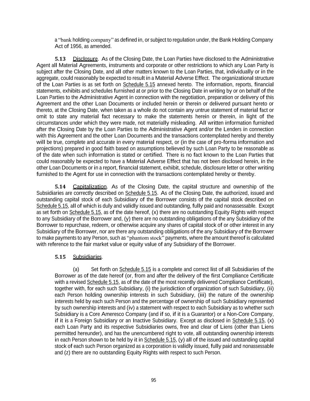95 a “bank holding company” as defined in, or subject to regulation under, the Bank Holding Company Act of 1956, as amended. 5.13 Disclosure. As of the Closing Date, the Loan Parties have disclosed to the Administrative Agent all Material Agreements, instruments and corporate or other restrictions to which any Loan Party is subject after the Closing Date, and all other matters known to the Loan Parties, that, individually or in the aggregate, could reasonably be expected to result in a Material Adverse Effect. The organizational structure of the Loan Parties is as set forth on Schedule 5.15 annexed hereto. The information, reports, financial statements, exhibits and schedules furnished at or prior to the Closing Date in writing by or on behalf of the Loan Parties to the Administrative Agent in connection with the negotiation, preparation or delivery of this Agreement and the other Loan Documents or included herein or therein or delivered pursuant hereto or thereto, at the Closing Date, when taken as a whole do not contain any untrue statement of material fact or omit to state any material fact necessary to make the statements herein or therein, in light of the circumstances under which they were made, not materially misleading. All written information furnished after the Closing Date by the Loan Parties to the Administrative Agent and/or the Lenders in connection with this Agreement and the other Loan Documents and the transactions contemplated hereby and thereby will be true, complete and accurate in every material respect, or (in the case of pro-forma information and projections) prepared in good faith based on assumptions believed by such Loan Party to be reasonable as of the date when such information is stated or certified. There is no fact known to the Loan Parties that could reasonably be expected to have a Material Adverse Effect that has not been disclosed herein, in the other Loan Documents or in a report, financial statement, exhibit, schedule, disclosure letter or other writing furnished to the Agent for use in connection with the transactions contemplated hereby or thereby. 5.14 Capitalization. As of the Closing Date, the capital structure and ownership of the Subsidiaries are correctly described on Schedule 5.15. As of the Closing Date, the authorized, issued and outstanding capital stock of each Subsidiary of the Borrower consists of the capital stock described on Schedule 5.15, all of which is duly and validly issued and outstanding, fully paid and nonassessable. Except as set forth on Schedule 5.15, as of the date hereof, (x) there are no outstanding Equity Rights with respect to any Subsidiary of the Borrower and, (y) there are no outstanding obligations of the any Subsidiary of the Borrower to repurchase, redeem, or otherwise acquire any shares of capital stock of or other interest in any Subsidiary of the Borrower, nor are there any outstanding obligations of the any Subsidiary of the Borrower to make payments to any Person, such as “phantom stock” payments, where the amount thereof is calculated with reference to the fair market value or equity value of any Subsidiary of the Borrower. 5.15 Subsidiaries. (a) Set forth on Schedule 5.15 is a complete and correct list of all Subsidiaries of the Borrower as of the date hereof (or, from and after the delivery of the first Compliance Certificate with a revised Schedule 5.15, as of the date of the most recently delivered Compliance Certificate), together with, for each such Subsidiary, (i) the jurisdiction of organization of such Subsidiary, (ii) each Person holding ownership interests in such Subsidiary, (iii) the nature of the ownership interests held by each such Person and the percentage of ownership of such Subsidiary represented by such ownership interests and (iv) a statement with respect to each Subsidiary as to whether such Subsidiary is a Core Ameresco Company (and if so, if it is a Guarantor) or a Non-Core Company, if it is a Foreign Subsidiary or an Inactive Subsidiary. Except as disclosed in Schedule 5.15, (x) each Loan Party and its respective Subsidiaries owns, free and clear of Liens (other than Liens permitted hereunder), and has the unencumbered right to vote, all outstanding ownership interests in each Person shown to be held by it in Schedule 5.15, (y) all of the issued and outstanding capital stock of each such Person organized as a corporation is validly issued, fully paid and nonassessable and (z) there are no outstanding Equity Rights with respect to such Person.