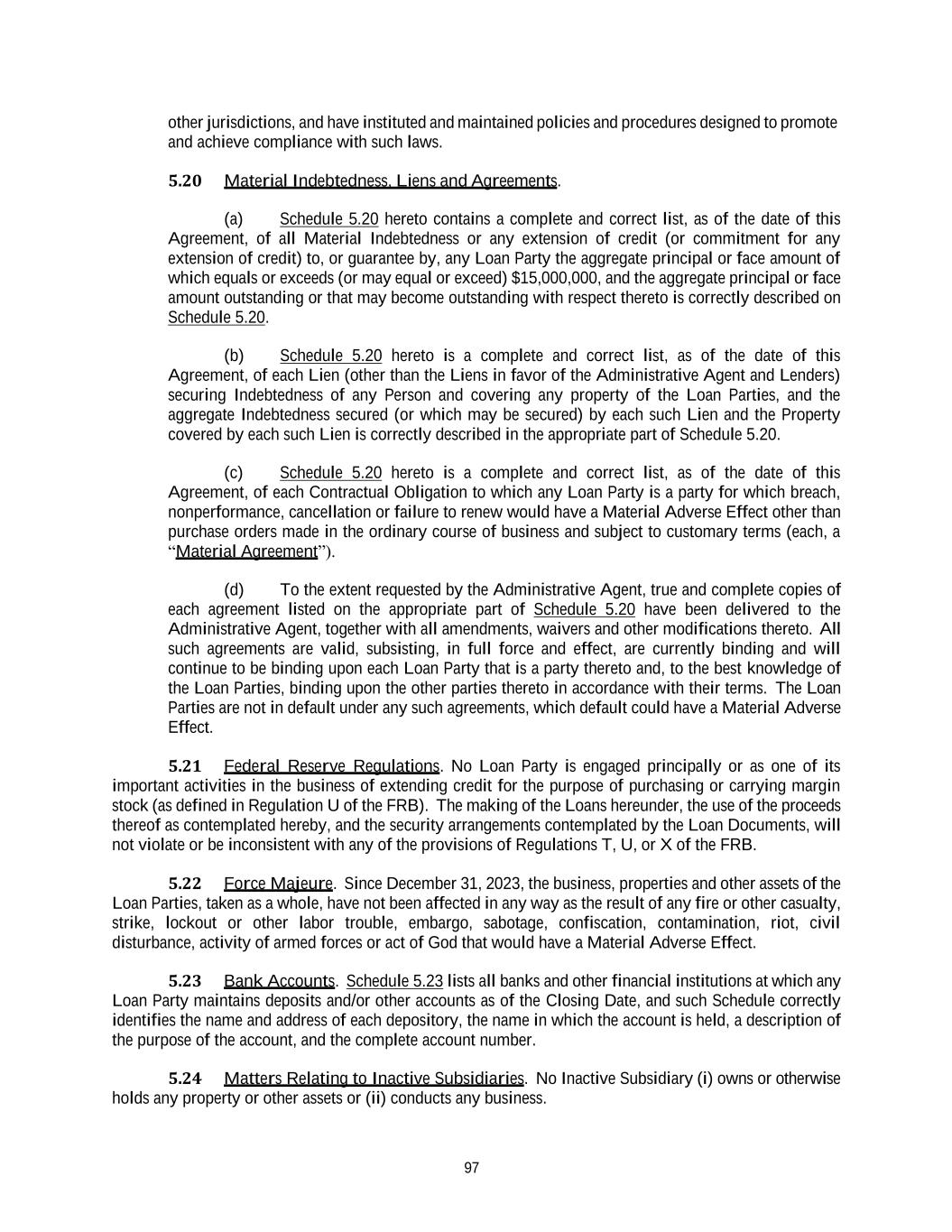 97 other jurisdictions, and have instituted and maintained policies and procedures designed to promote and achieve compliance with such laws. 5.20 Material Indebtedness, Liens and Agreements. (a) Schedule 5.20 hereto contains a complete and correct list, as of the date of this Agreement, of all Material Indebtedness or any extension of credit (or commitment for any extension of credit) to, or guarantee by, any Loan Party the aggregate principal or face amount of which equals or exceeds (or may equal or exceed) $15,000,000, and the aggregate principal or face amount outstanding or that may become outstanding with respect thereto is correctly described on Schedule 5.20. (b) Schedule 5.20 hereto is a complete and correct list, as of the date of this Agreement, of each Lien (other than the Liens in favor of the Administrative Agent and Lenders) securing Indebtedness of any Person and covering any property of the Loan Parties, and the aggregate Indebtedness secured (or which may be secured) by each such Lien and the Property covered by each such Lien is correctly described in the appropriate part of Schedule 5.20. (c) Schedule 5.20 hereto is a complete and correct list, as of the date of this Agreement, of each Contractual Obligation to which any Loan Party is a party for which breach, nonperformance, cancellation or failure to renew would have a Material Adverse Effect other than purchase orders made in the ordinary course of business and subject to customary terms (each, a “Material Agreement”). (d) To the extent requested by the Administrative Agent, true and complete copies of each agreement listed on the appropriate part of Schedule 5.20 have been delivered to the Administrative Agent, together with all amendments, waivers and other modifications thereto. All such agreements are valid, subsisting, in full force and effect, are currently binding and will continue to be binding upon each Loan Party that is a party thereto and, to the best knowledge of the Loan Parties, binding upon the other parties thereto in accordance with their terms. The Loan Parties are not in default under any such agreements, which default could have a Material Adverse Effect. 5.21 Federal Reserve Regulations. No Loan Party is engaged principally or as one of its important activities in the business of extending credit for the purpose of purchasing or carrying margin stock (as defined in Regulation U of the FRB). The making of the Loans hereunder, the use of the proceeds thereof as contemplated hereby, and the security arrangements contemplated by the Loan Documents, will not violate or be inconsistent with any of the provisions of Regulations T, U, or X of the FRB. 5.22 Force Majeure. Since December 31, 2023, the business, properties and other assets of the Loan Parties, taken as a whole, have not been affected in any way as the result of any fire or other casualty, strike, lockout or other labor trouble, embargo, sabotage, confiscation, contamination, riot, civil disturbance, activity of armed forces or act of God that would have a Material Adverse Effect. 5.23 Bank Accounts. Schedule 5.23 lists all banks and other financial institutions at which any Loan Party maintains deposits and/or other accounts as of the Closing Date, and such Schedule correctly identifies the name and address of each depository, the name in which the account is held, a description of the purpose of the account, and the complete account number. 5.24 Matters Relating to Inactive Subsidiaries. No Inactive Subsidiary (i) owns or otherwise holds any property or other assets or (ii) conducts any business.