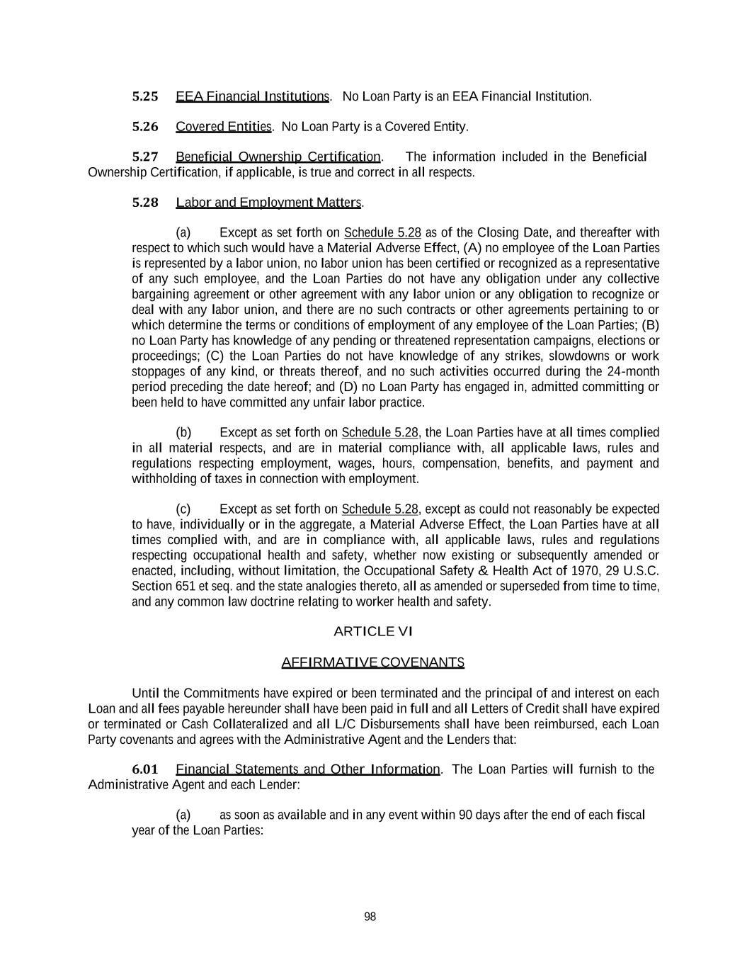98 5.25 EEA Financial Institutions. No Loan Party is an EEA Financial Institution. 5.26 Covered Entities. No Loan Party is a Covered Entity. 5.27 Beneficial Ownership Certification. The information included in the Beneficial Ownership Certification, if applicable, is true and correct in all respects. 5.28 Labor and Employment Matters. (a) Except as set forth on Schedule 5.28 as of the Closing Date, and thereafter with respect to which such would have a Material Adverse Effect, (A) no employee of the Loan Parties is represented by a labor union, no labor union has been certified or recognized as a representative of any such employee, and the Loan Parties do not have any obligation under any collective bargaining agreement or other agreement with any labor union or any obligation to recognize or deal with any labor union, and there are no such contracts or other agreements pertaining to or which determine the terms or conditions of employment of any employee of the Loan Parties; (B) no Loan Party has knowledge of any pending or threatened representation campaigns, elections or proceedings; (C) the Loan Parties do not have knowledge of any strikes, slowdowns or work stoppages of any kind, or threats thereof, and no such activities occurred during the 24-month period preceding the date hereof; and (D) no Loan Party has engaged in, admitted committing or been held to have committed any unfair labor practice. (b) Except as set forth on Schedule 5.28, the Loan Parties have at all times complied in all material respects, and are in material compliance with, all applicable laws, rules and regulations respecting employment, wages, hours, compensation, benefits, and payment and withholding of taxes in connection with employment. (c) Except as set forth on Schedule 5.28, except as could not reasonably be expected to have, individually or in the aggregate, a Material Adverse Effect, the Loan Parties have at all times complied with, and are in compliance with, all applicable laws, rules and regulations respecting occupational health and safety, whether now existing or subsequently amended or enacted, including, without limitation, the Occupational Safety & Health Act of 1970, 29 U.S.C. Section 651 et seq. and the state analogies thereto, all as amended or superseded from time to time, and any common law doctrine relating to worker health and safety. ARTICLE VI AFFIRMATIVE COVENANTS Until the Commitments have expired or been terminated and the principal of and interest on each Loan and all fees payable hereunder shall have been paid in full and all Letters of Credit shall have expired or terminated or Cash Collateralized and all L/C Disbursements shall have been reimbursed, each Loan Party covenants and agrees with the Administrative Agent and the Lenders that: 6.01 Financial Statements and Other Information. The Loan Parties will furnish to the Administrative Agent and each Lender: (a) as soon as available and in any event within 90 days after the end of each fiscal year of the Loan Parties: