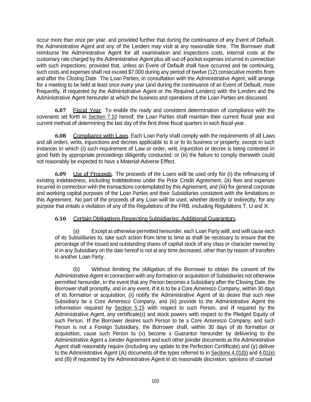 103 occur more than once per year, and provided further that during the continuance of any Event of Default, the Administrative Agent and any of the Lenders may visit at any reasonable time. The Borrower shall reimburse the Administrative Agent for all examination and inspections costs, internal costs at the customary rate charged by the Administrative Agent plus all out-of-pocket expenses incurred in connection with such inspections, provided that, unless an Event of Default shall have occurred and be continuing, such costs and expenses shall not exceed $7,000 during any period of twelve (12) consecutive months from and after the Closing Date. The Loan Parties, in consultation with the Administrative Agent, will arrange for a meeting to be held at least once every year (and during the continuance of an Event of Default, more frequently, if requested by the Administrative Agent or the Required Lenders) with the Lenders and the Administrative Agent hereunder at which the business and operations of the Loan Parties are discussed. 6.07 Fiscal Year. To enable the ready and consistent determination of compliance with the covenants set forth in Section 7.10 hereof, the Loan Parties shall maintain their current fiscal year and current method of determining the last day of the first three fiscal quarters in each fiscal year. 6.08 Compliance with Laws. Each Loan Party shall comply with the requirements of all Laws and all orders, writs, injunctions and decrees applicable to it or to its business or property, except in such instances in which (i) such requirement of Law or order, writ, injunction or decree is being contested in good faith by appropriate proceedings diligently conducted; or (ii) the failure to comply therewith could not reasonably be expected to have a Material Adverse Effect. 6.09 Use of Proceeds. The proceeds of the Loans will be used only for (i) the refinancing of existing indebtedness, including Indebtedness under the Prior Credit Agreement, (ii) fees and expenses incurred in connection with the transactions contemplated by this Agreement, and (iii) for general corporate and working capital purposes of the Loan Parties and their Subsidiaries consistent with the limitations in this Agreement. No part of the proceeds of any Loan will be used, whether directly or indirectly, for any purpose that entails a violation of any of the Regulations of the FRB, including Regulations T, U and X. 6.10 Certain Obligations Respecting Subsidiaries; Additional Guarantors. (a) Except as otherwise permitted hereunder, each Loan Party will, and will cause each of its Subsidiaries to, take such action from time to time as shall be necessary to ensure that the percentage of the issued and outstanding shares of capital stock of any class or character owned by it in any Subsidiary on the date hereof is not at any time decreased, other than by reason of transfers to another Loan Party. (b) Without limiting the obligation of the Borrower to obtain the consent of the Administrative Agent in connection with any formation or acquisition of Subsidiaries not otherwise permitted hereunder, in the event that any Person becomes a Subsidiary after the Closing Date, the Borrower shall promptly, and in any event, if it is to be a Core Ameresco Company, within 30 days of its formation or acquisition, (i) notify the Administrative Agent of its desire that such new Subsidiary be a Core Ameresco Company, and (ii) provide to the Administrative Agent the information required by Section 5.15 with respect to such Person, and if required by the Administrative Agent, any certificate(s) and stock powers with respect to the Pledged Equity of such Person. If the Borrower desires such Person to be a Core Ameresco Company, and such Person is not a Foreign Subsidiary, the Borrower shall, within 30 days of its formation or acquisition, cause such Person to (x) become a Guarantor hereunder by delivering to the Administrative Agent a Joinder Agreement and such other joinder documents as the Administrative Agent shall reasonably require (including any update to the Perfection Certificate) and (y) deliver to the Administrative Agent (A) documents of the types referred to in Sections 4.01(b) and 4.01(e) and (B) if requested by the Administrative Agent in its reasonable discretion, opinions of counsel