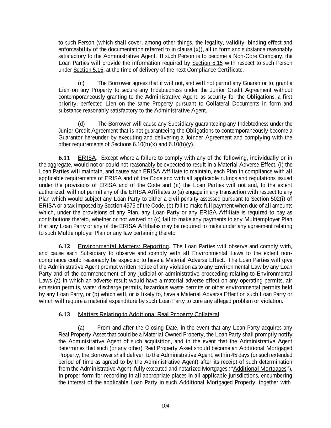 104 to such Person (which shall cover, among other things, the legality, validity, binding effect and enforceability of the documentation referred to in clause (x)), all in form and substance reasonably satisfactory to the Administrative Agent. If such Person is to become a Non-Core Company, the Loan Parties will provide the information required by Section 5.15 with respect to such Person under Section 5.15, at the time of delivery of the next Compliance Certificate. (c) The Borrower agrees that it will not, and will not permit any Guarantor to, grant a Lien on any Property to secure any Indebtedness under the Junior Credit Agreement without contemporaneously granting to the Administrative Agent, as security for the Obligations, a first priority, perfected Lien on the same Property pursuant to Collateral Documents in form and substance reasonably satisfactory to the Administrative Agent. (d) The Borrower will cause any Subsidiary guaranteeing any Indebtedness under the Junior Credit Agreement that is not guaranteeing the Obligations to contemporaneously become a Guarantor hereunder by executing and delivering a Joinder Agreement and complying with the other requirements of Sections 6.10(b)(x) and 6.10(b)(y). 6.11 ERISA. Except where a failure to comply with any of the following, individually or in the aggregate, would not or could not reasonably be expected to result in a Material Adverse Effect, (i) the Loan Parties will maintain, and cause each ERISA Affiliate to maintain, each Plan in compliance with all applicable requirements of ERISA and of the Code and with all applicable rulings and regulations issued under the provisions of ERISA and of the Code and (ii) the Loan Parties will not and, to the extent authorized, will not permit any of the ERISA Affiliates to (a) engage in any transaction with respect to any Plan which would subject any Loan Party to either a civil penalty assessed pursuant to Section 502(i) of ERISA or a tax imposed by Section 4975 of the Code, (b) fail to make full payment when due of all amounts which, under the provisions of any Plan, any Loan Party or any ERISA Affiliate is required to pay as contributions thereto, whether or not waived or (c) fail to make any payments to any Multiemployer Plan that any Loan Party or any of the ERISA Affiliates may be required to make under any agreement relating to such Multiemployer Plan or any law pertaining thereto 6.12 Environmental Matters; Reporting. The Loan Parties will observe and comply with, and cause each Subsidiary to observe and comply with all Environmental Laws to the extent non- compliance could reasonably be expected to have a Material Adverse Effect. The Loan Parties will give the Administrative Agent prompt written notice of any violation as to any Environmental Law by any Loan Party and of the commencement of any judicial or administrative proceeding relating to Environmental Laws (a) in which an adverse result would have a material adverse effect on any operating permits, air emission permits, water discharge permits, hazardous waste permits or other environmental permits held by any Loan Party, or (b) which will, or is likely to, have a Material Adverse Effect on such Loan Party or which will require a material expenditure by such Loan Party to cure any alleged problem or violation. 6.13 Matters Relating to Additional Real Property Collateral. (a) From and after the Closing Date, in the event that any Loan Party acquires any Real Property Asset that could be a Material Owned Property, the Loan Party shall promptly notify the Administrative Agent of such acquisition, and in the event that the Administrative Agent determines that such (or any other) Real Property Asset should become an Additional Mortgaged Property, the Borrower shall deliver, to the Administrative Agent, within 45 days (or such extended period of time as agreed to by the Administrative Agent) after its receipt of such determination from the Administrative Agent, fully executed and notarized Mortgages (“Additional Mortgages”), in proper form for recording in all appropriate places in all applicable jurisdictions, encumbering the interest of the applicable Loan Party in such Additional Mortgaged Property, together with